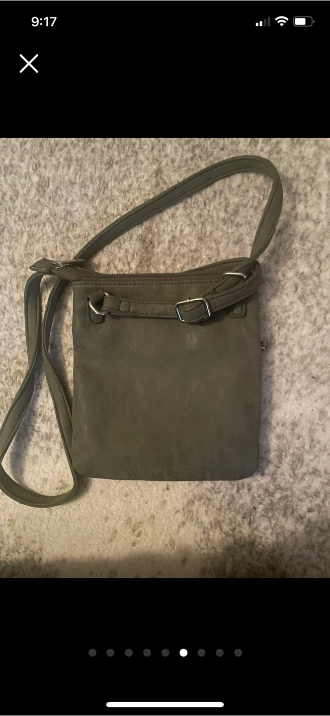 This olive green crossbody purse has a decorative tassel. It's made of a faux leather material. The strap is adjustable.