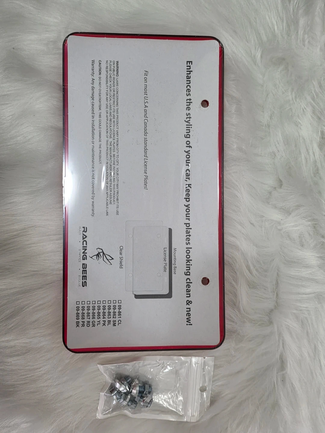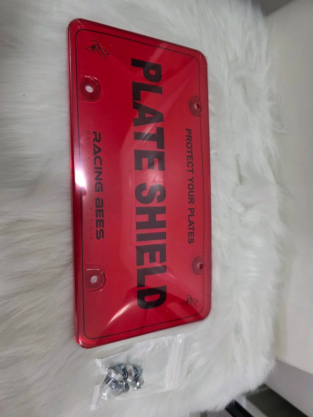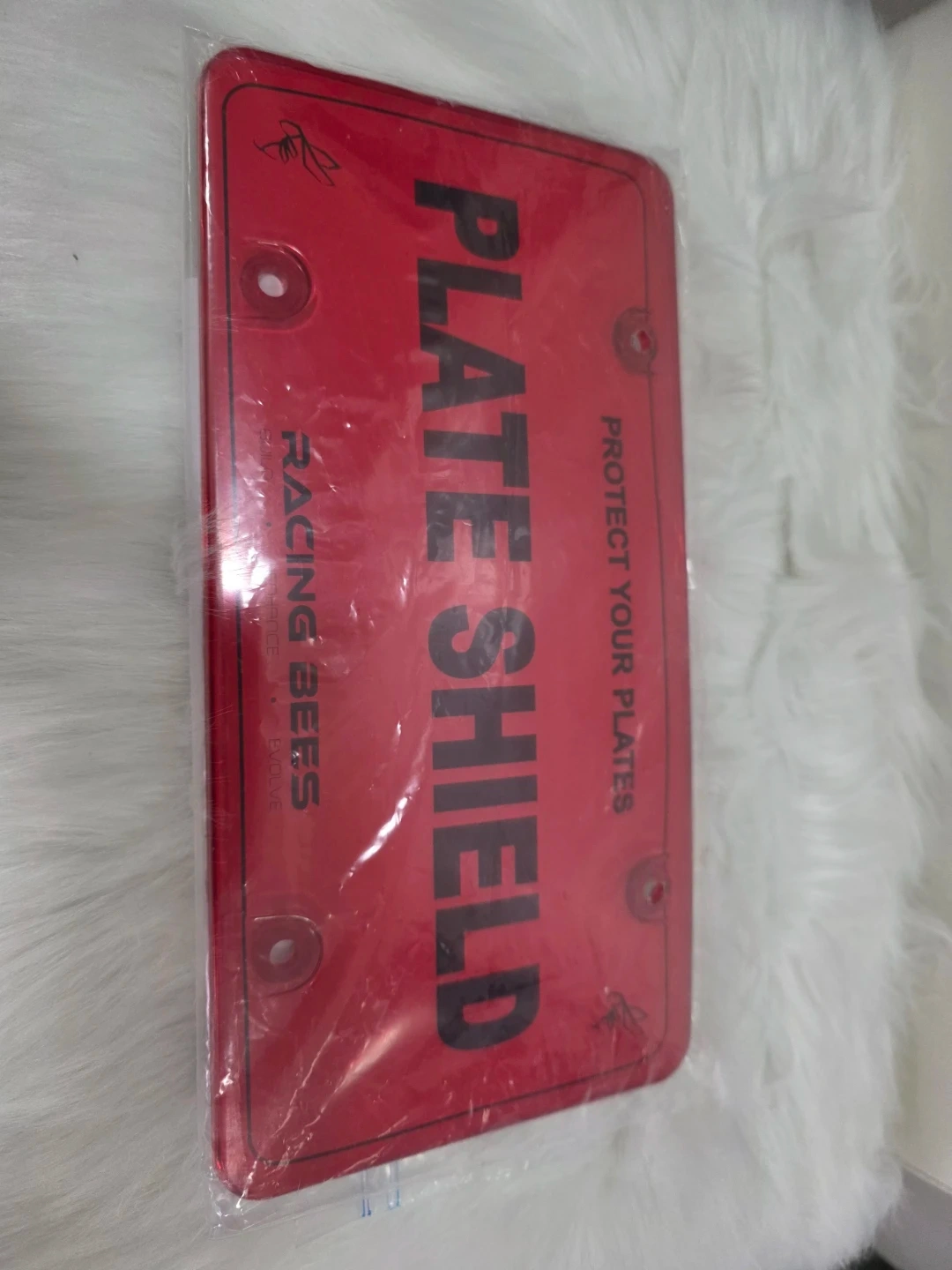 This is a red plate shield for protecting your car's license plates. It fits most Canada standard license plates. It's made for enhancing the styling of your car while keeping plates clean. Mounting hardware is included.