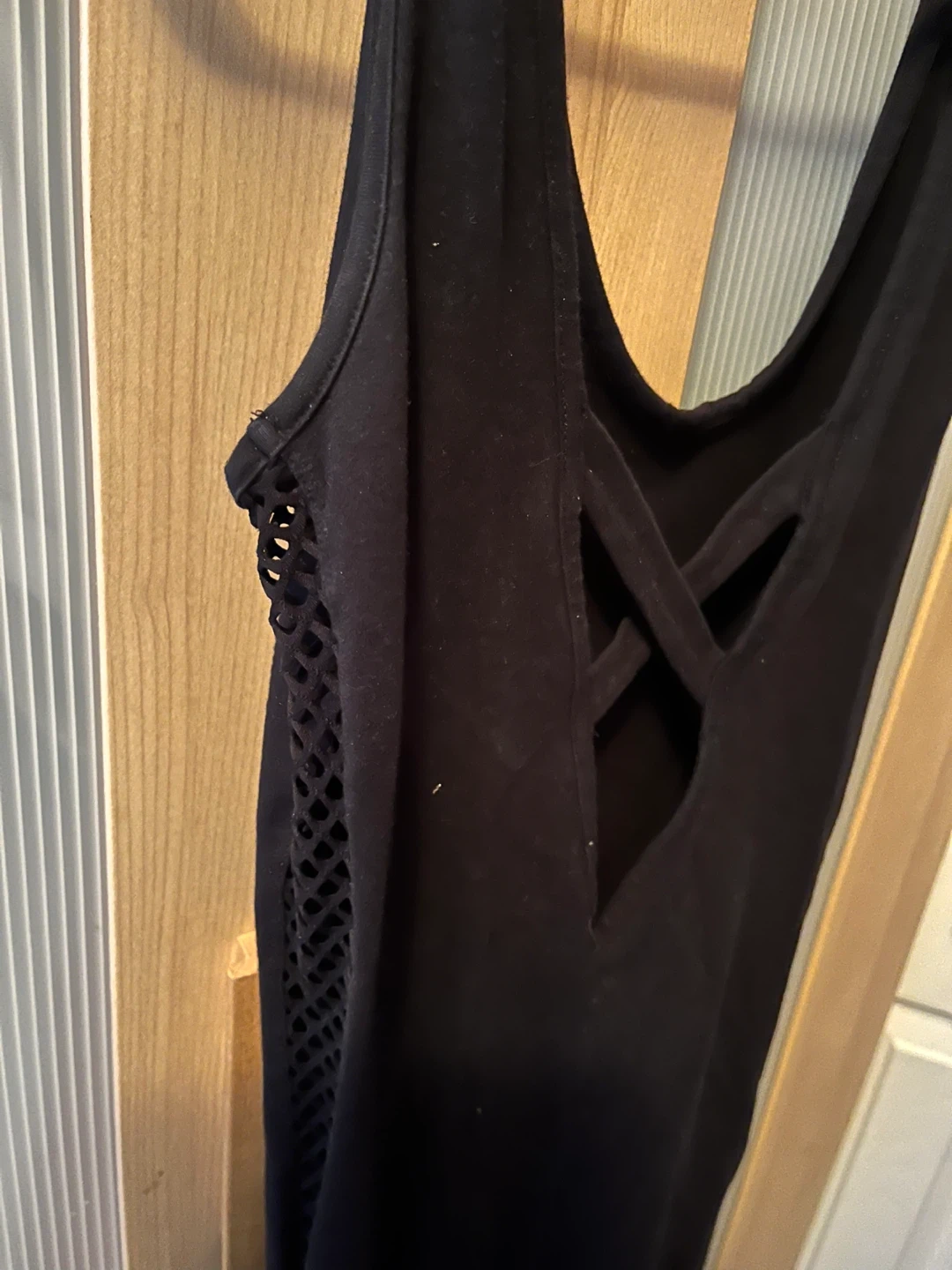 This black bodysuit features a unique criss-cross design on the back and mesh detailing on the sides. It's a sleeveless, scoop-neck style. Comfortable and stylish for everyday wear or layering!