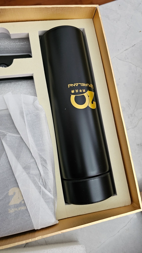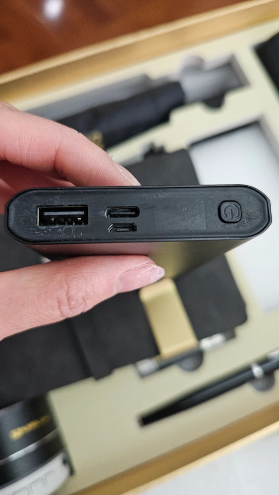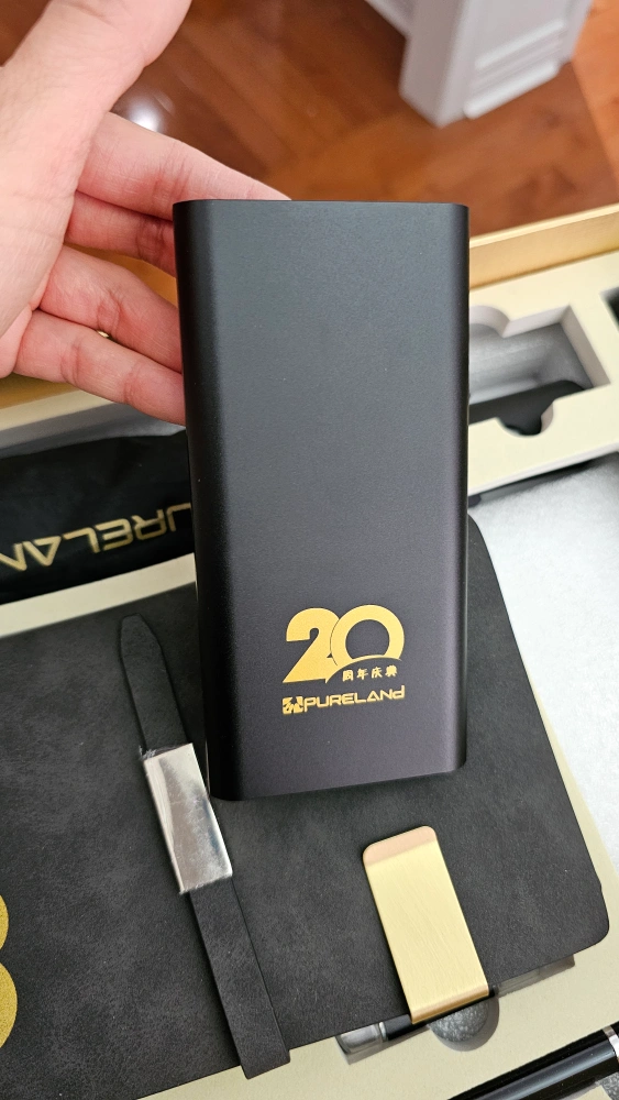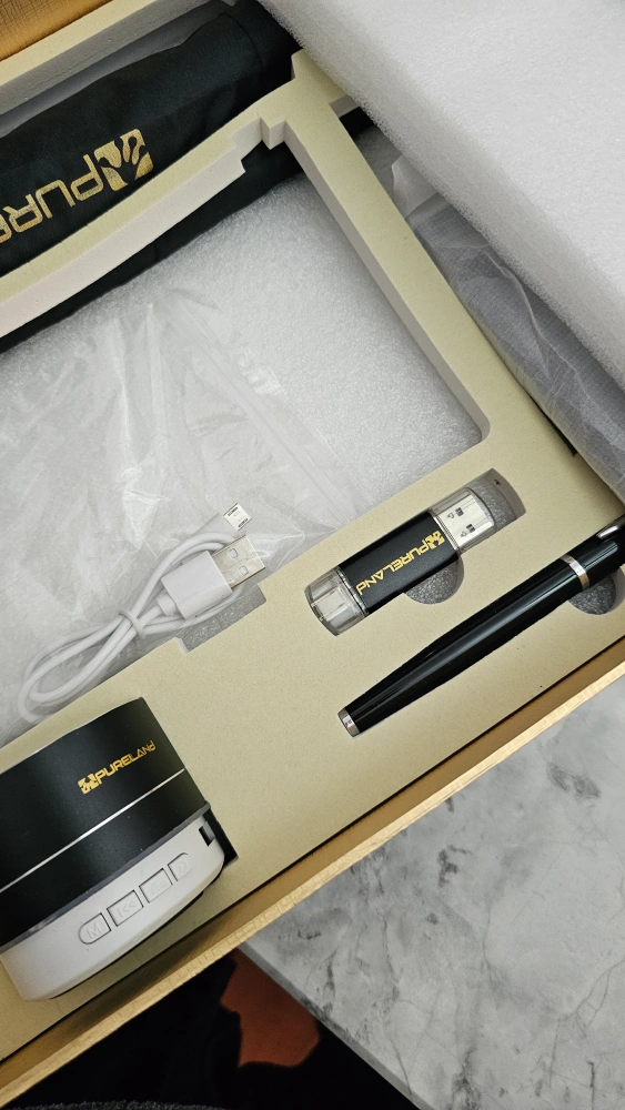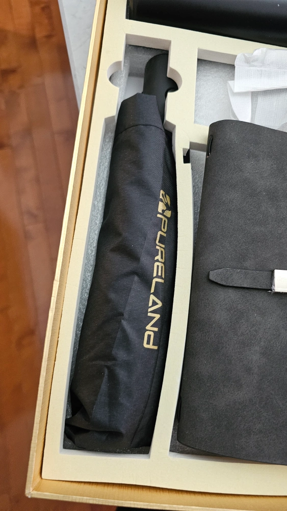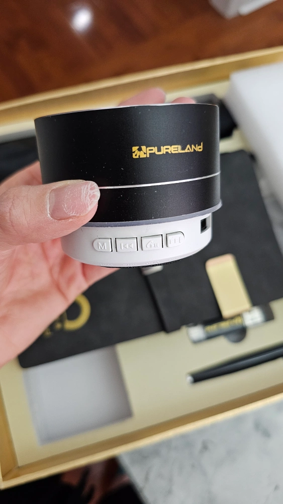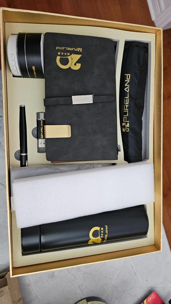 New gift set. Includes a Bluetooth speaker, notebook, pen, USB drive, thermos, powerbank and umbrella. All items are black with gold accents. Comes in a nice box.