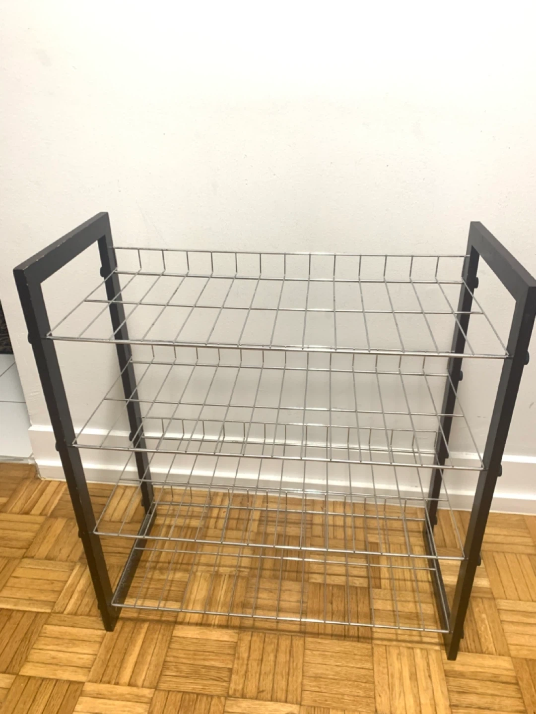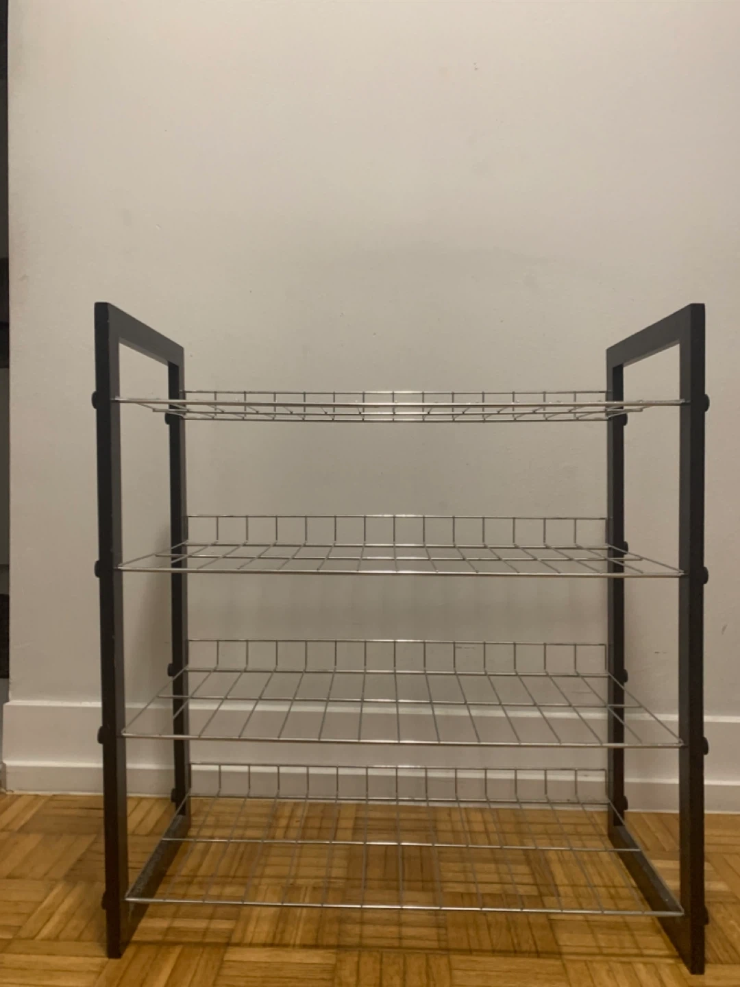 This 4-tier metal wire shoe rack keeps your footwear organized. It's constructed with a black metal frame and silver wire shelves. This rack is great for entryways or closets!