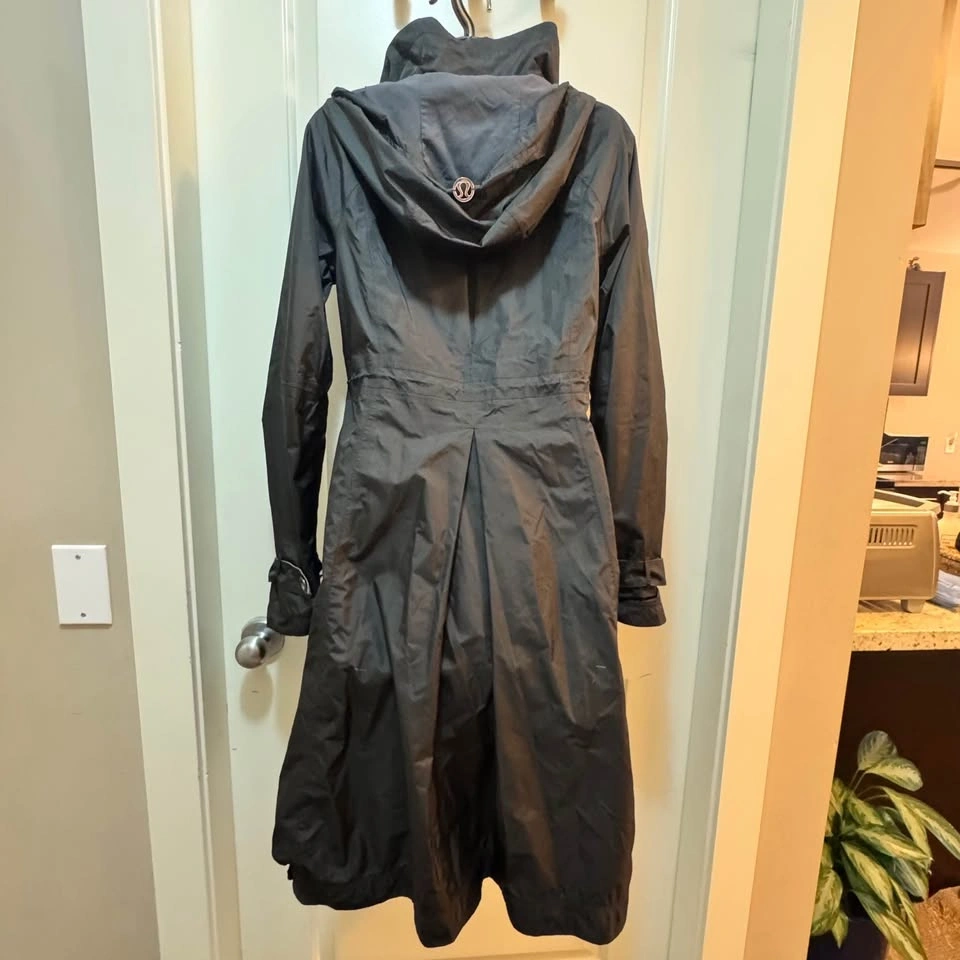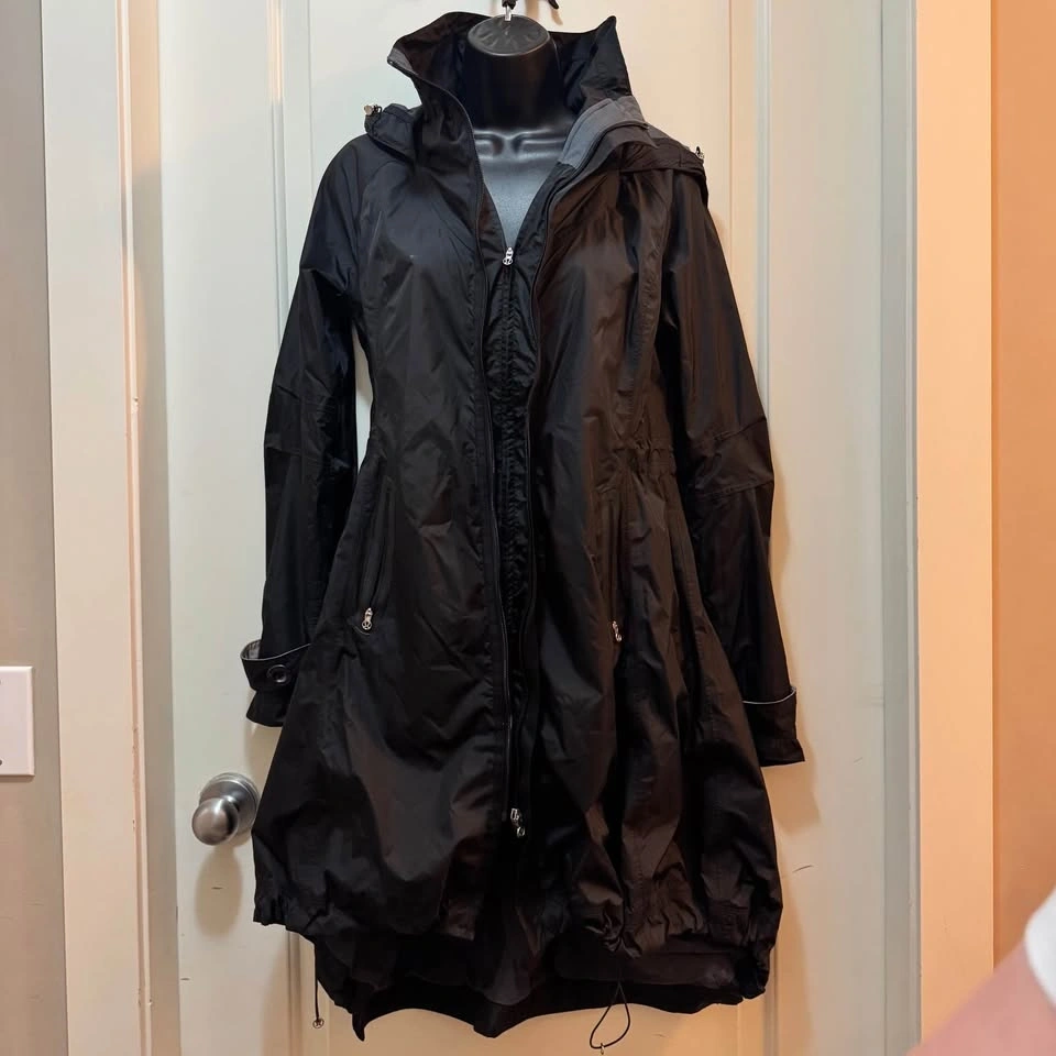 Lightweight hooded trench with a sleek silhouette. Full double front zip and secure zip pockets. Adjustable hem drawcord for a custom fit. Button-tab cuffs add subtle detail. Versatile black color for everyday wear. This high-performance, technical rain jacket is a Lululemon classic designed for the urban commuter. Featuring a sleek, elongated silhouette with a slight high-low hem, it offers superior weather protection without sacrificing style. Brand: Lululemon Color: Black / Gray Lining Size: 4 (Size dot confirmed in photos) Condition: Excellent Used Condition (EUC). Well-maintained with all hardware, zippers, and drawstrings fully functional. No visible flaws or stains. Product Details: Weatherproof Construction: waterproof fabric with sealed seams to keep you dry in heavy rain. Double Zipper System: Two-way front zipper for adjustable ventilation and mobility—perfect for cycling or walking. Signature Details: Features the iconic "ride on! rock on!" inside the collar and the Lululemon logo on the zipper pulls and rear hood. Functional Storage: Multiple secure zippered pockets including a chest pocket. Customizable Fit: Internal waist and hem drawcords to cinch for a more feminine, tailored shape.