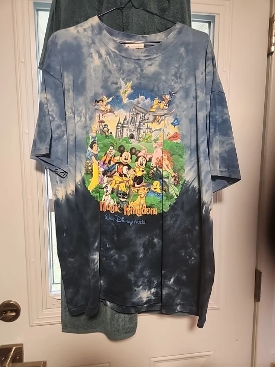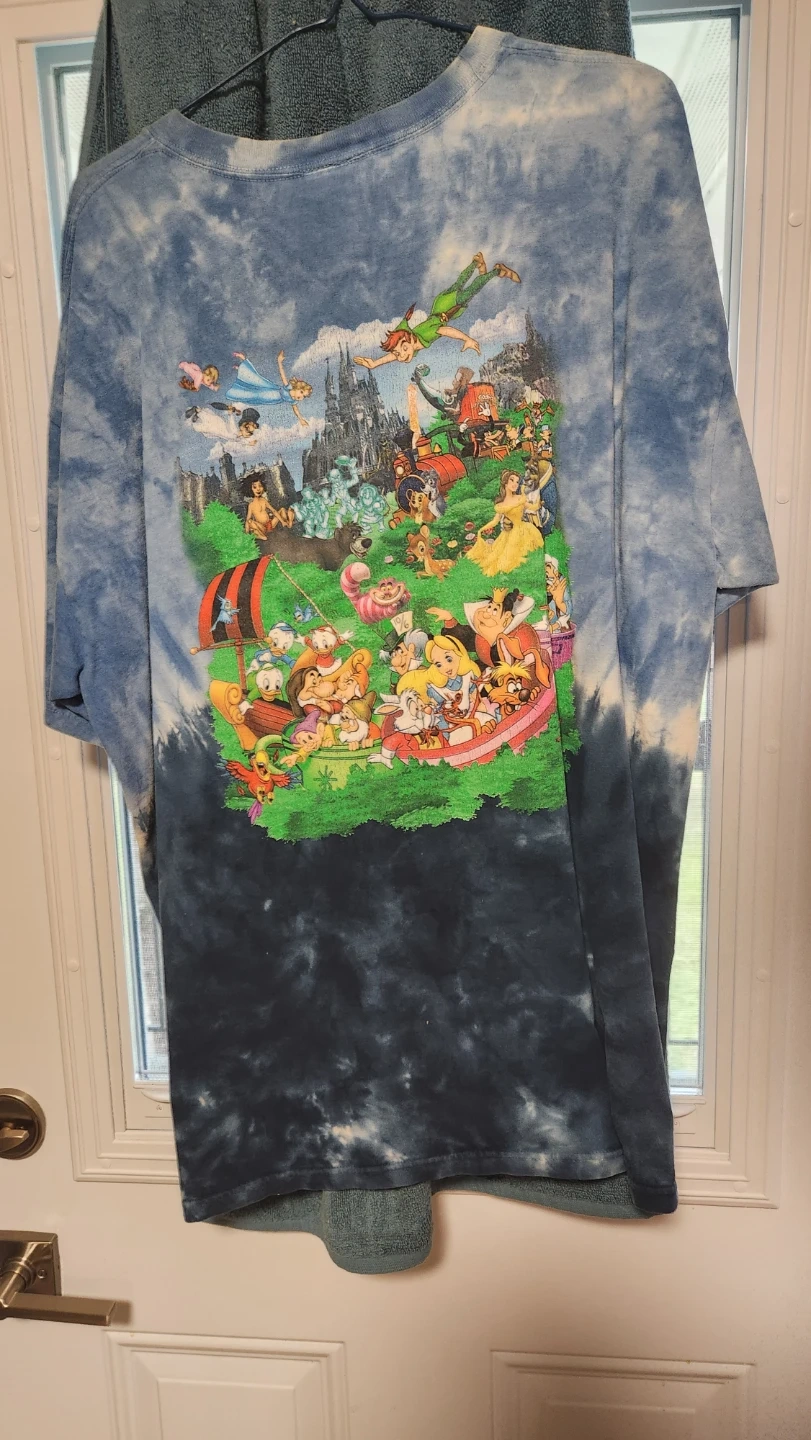 This tie-dye t-shirt features a colourful graphic of Disney characters at Magic Kingdom. It's a size large with a unique blue and white tie-dye pattern. This shirt would be fun for any Disney fan! Never been worn.