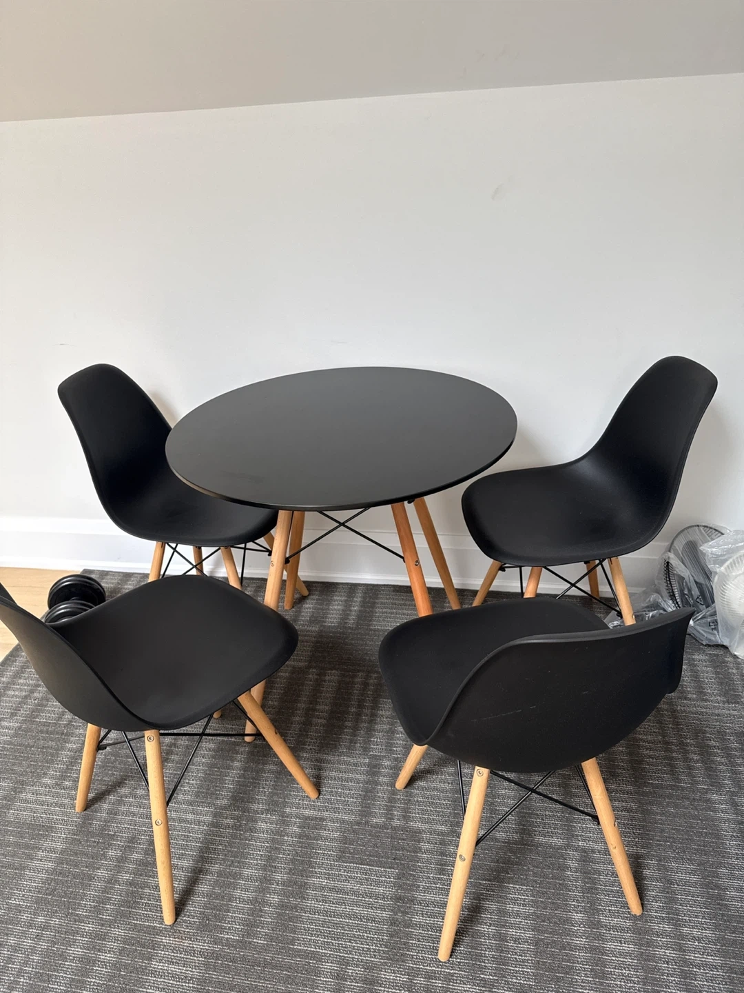 This set includes a black dining table with a round top and four black chairs. The chairs have a distinctive molded design with wooden legs. It's a nice compact set for a smaller space. Chairs are made of plastic material.