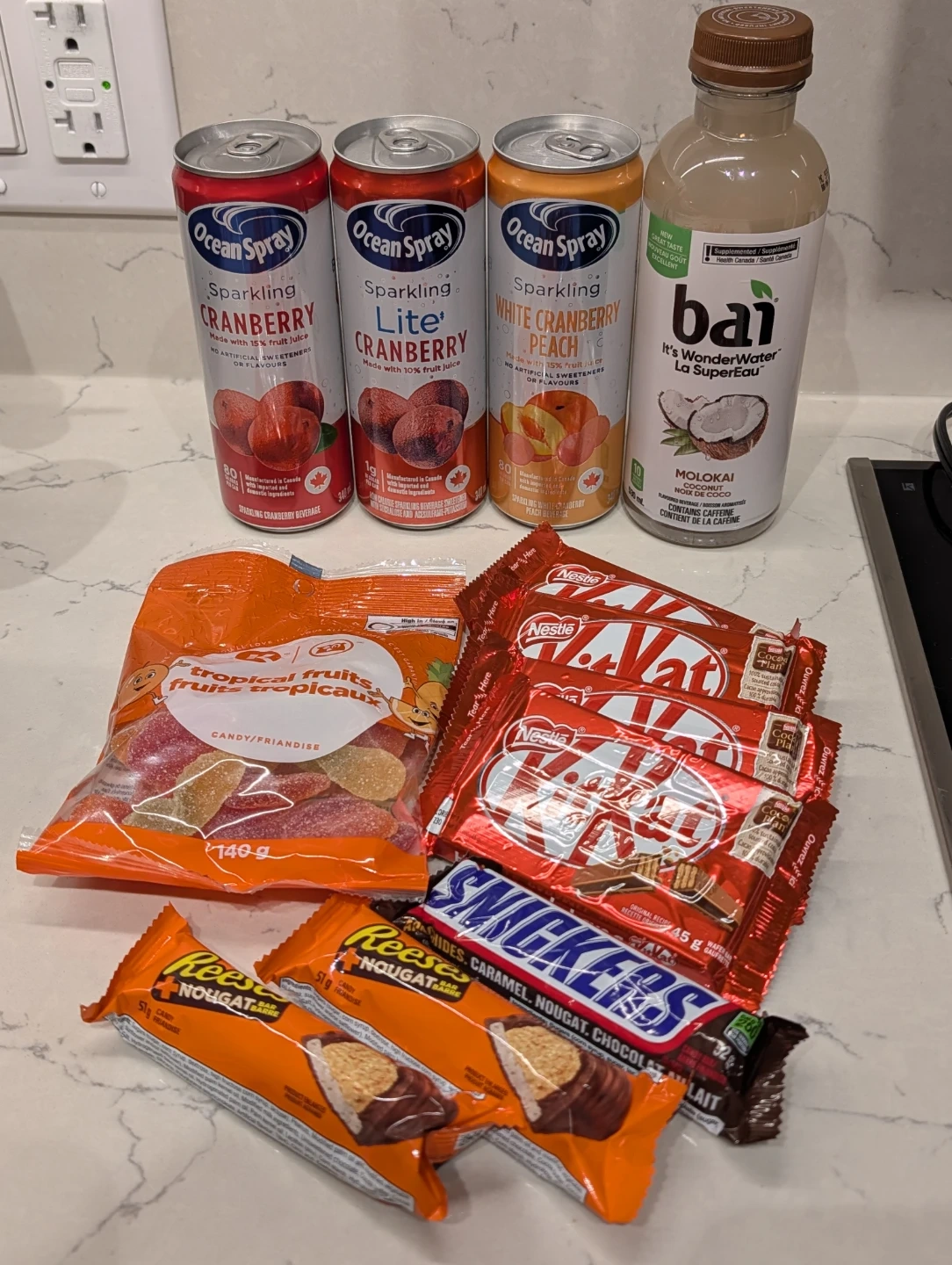 Bundle of assorted beverages and treats.