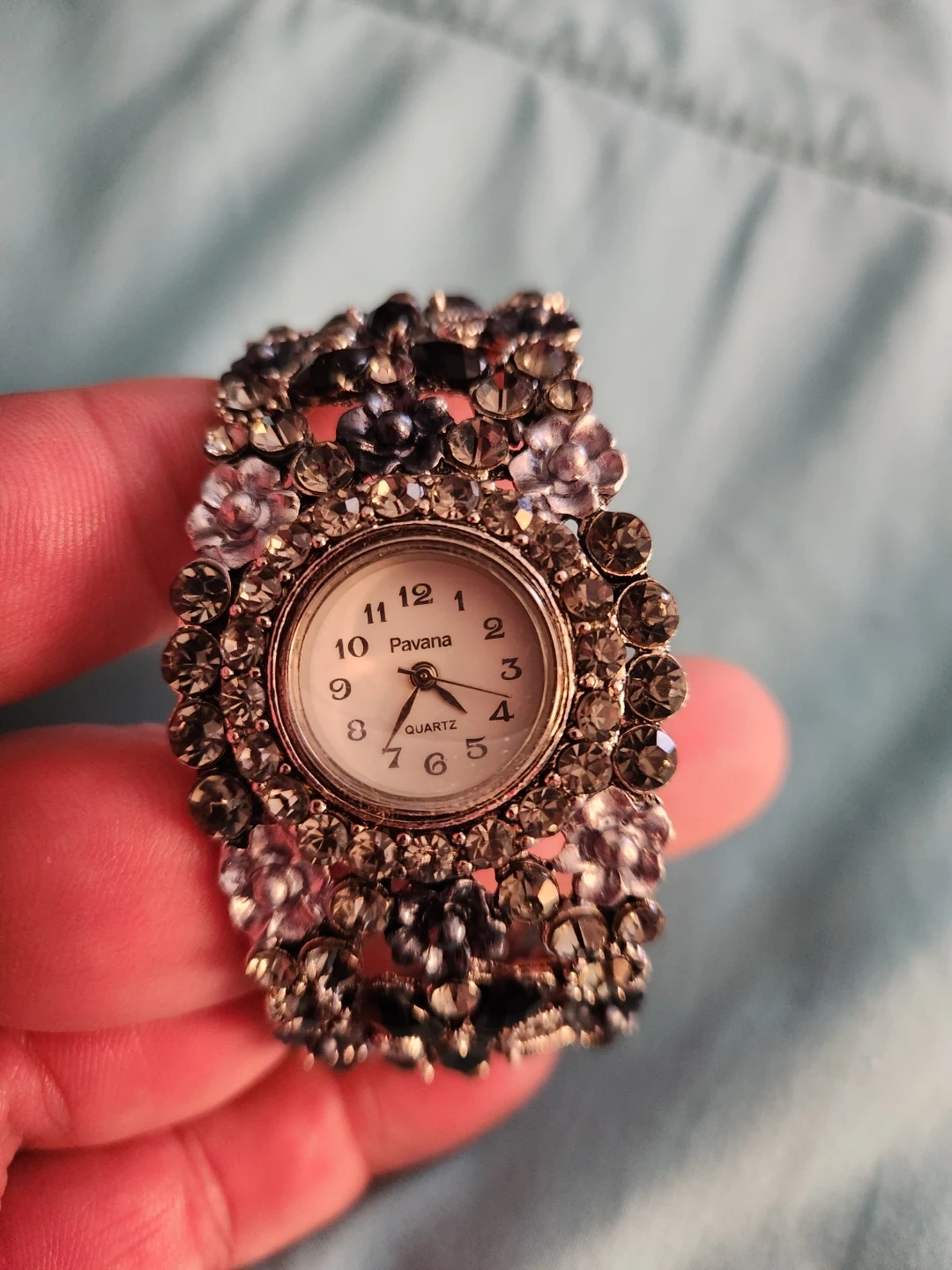 This Pavana women's watch features a quartz movement for reliable timekeeping. It's adorned with sparkling rhinestones and floral accents on the band, giving it a glamorous look. This watch is a stylish accessory for any outfit.