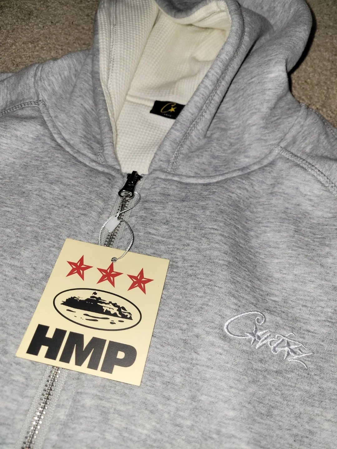 Brand new, this Corteiz HMP set is super comfy. Has a grey full zip hoodie with a white waffle-knit hood lining. Matching grey sweatpants. Both pieces have the Corteiz embroidery. Hoodie still has its HMP tag on.