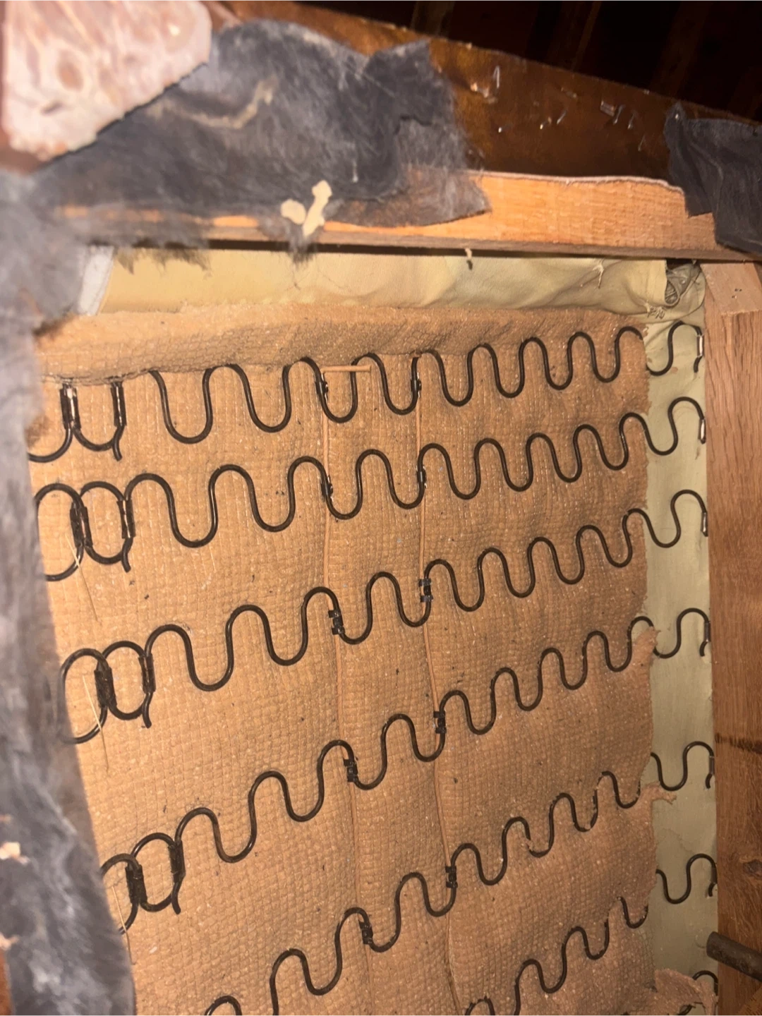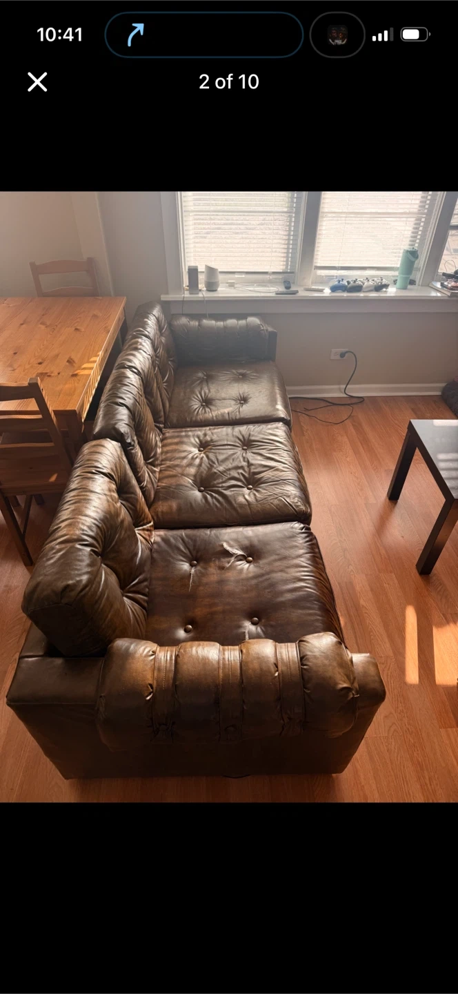 Has some tears . As seen in pictures . (Easy garage pick up) last picture is the underside cloth missing sturdy very comfortable couch