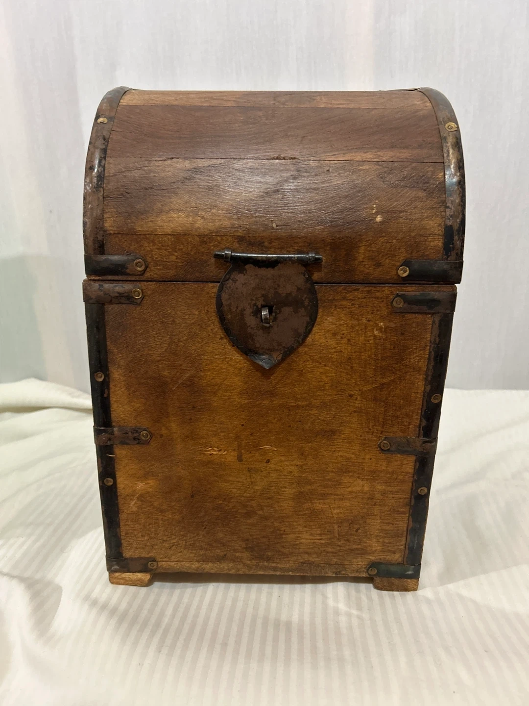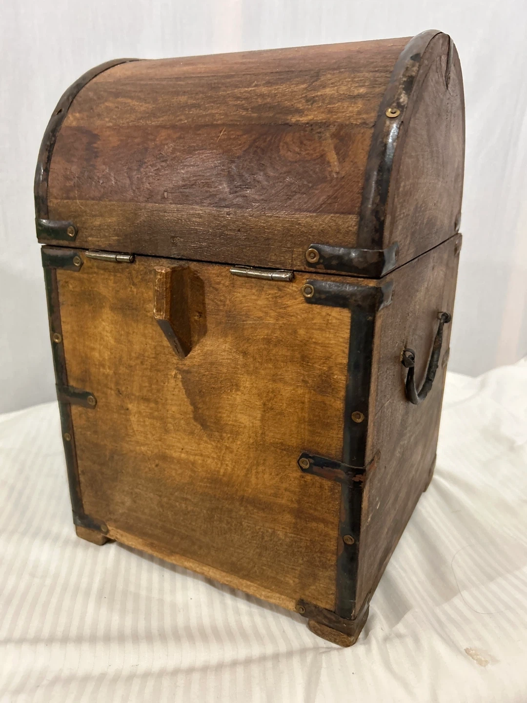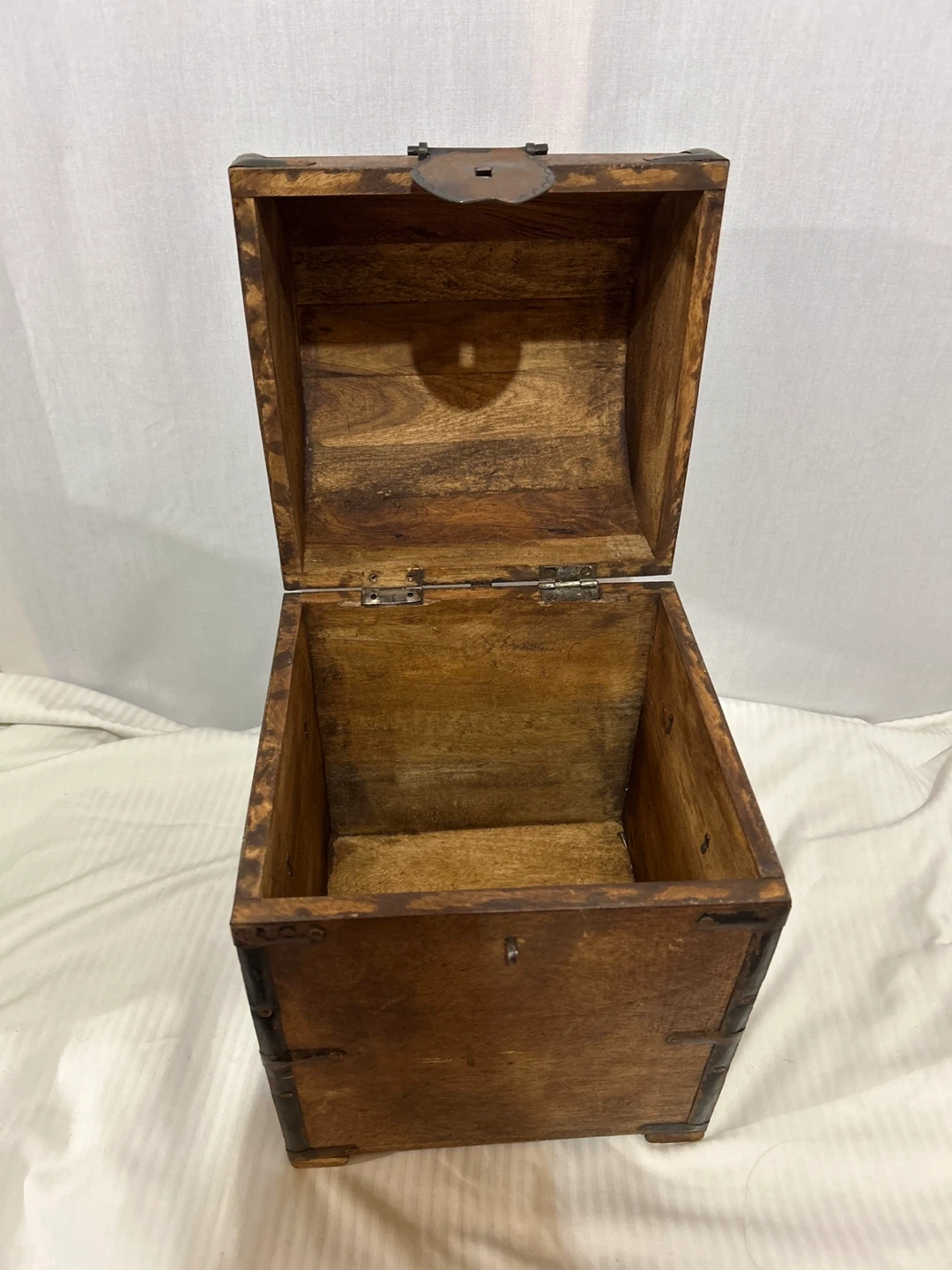 This decorative chest is made of wood with metal accents. It measures approximately 9 inches wide and 14 inches high. Its rustic design makes it a charming addition for storage or display. Two available. $25 each.