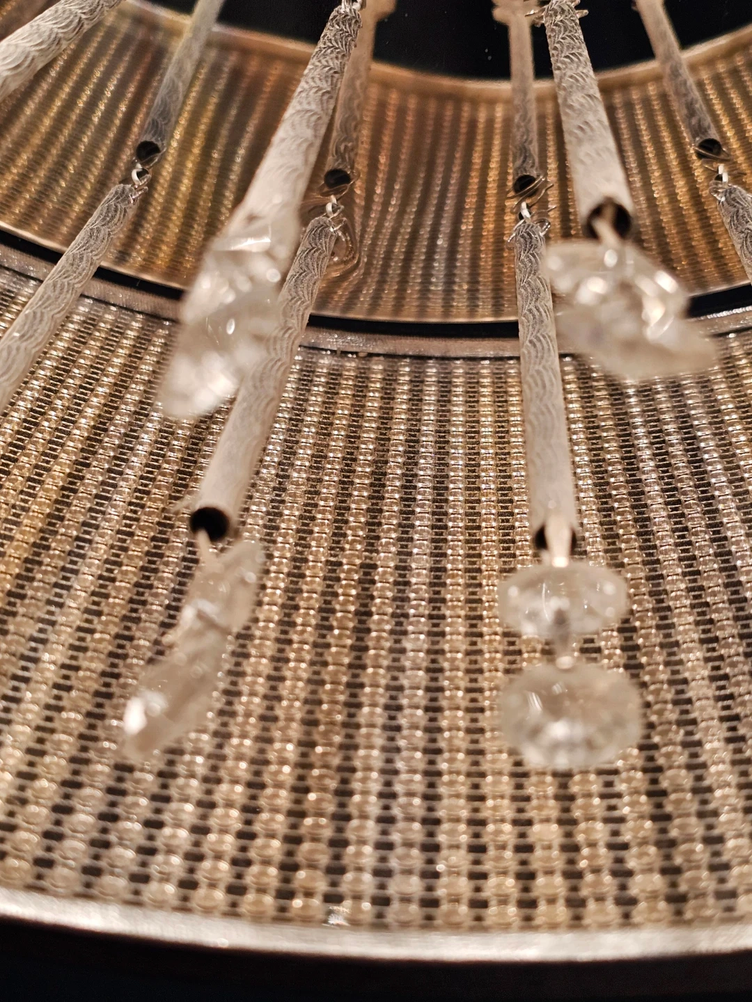 This stylish drum chandelier features a silver-toned metallic mesh shade with intricate crystal droplet accents. It hangs from a metal cord and provides a warm, inviting light. Perfect for adding a touch of glamour to any room! Rim is 8" tall, diameter is 17". Overall hanging height is variable depending on your preferences.