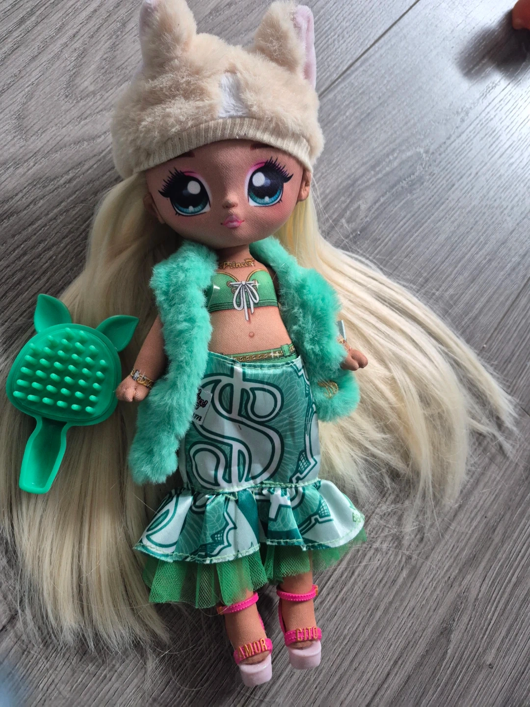 20Selling a Na! Na! Na! Surprise doll. She has long blonde hair and is wearing a green outfit with dollar sign patterns. She also comes with a green brush