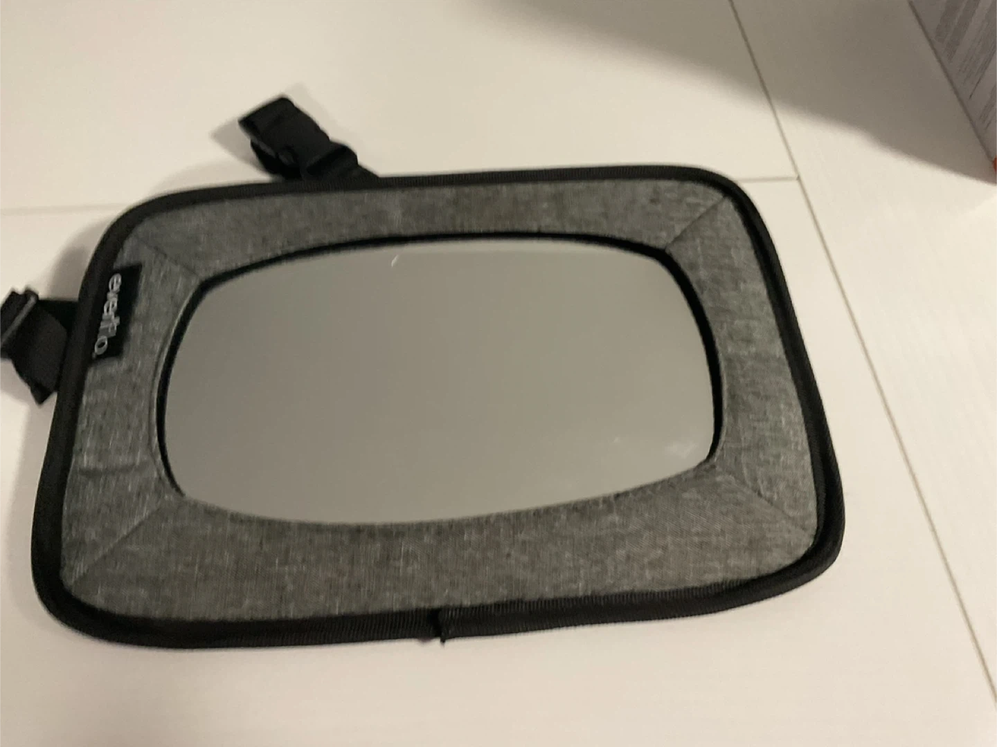 This is an Evenflo car seat mirror. It's made with a grey fabric frame and has adjustable straps for easy attachment. It allows you to see your child in the back seat.