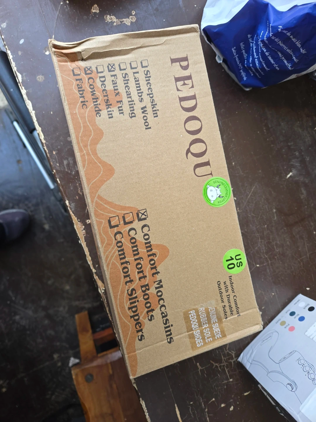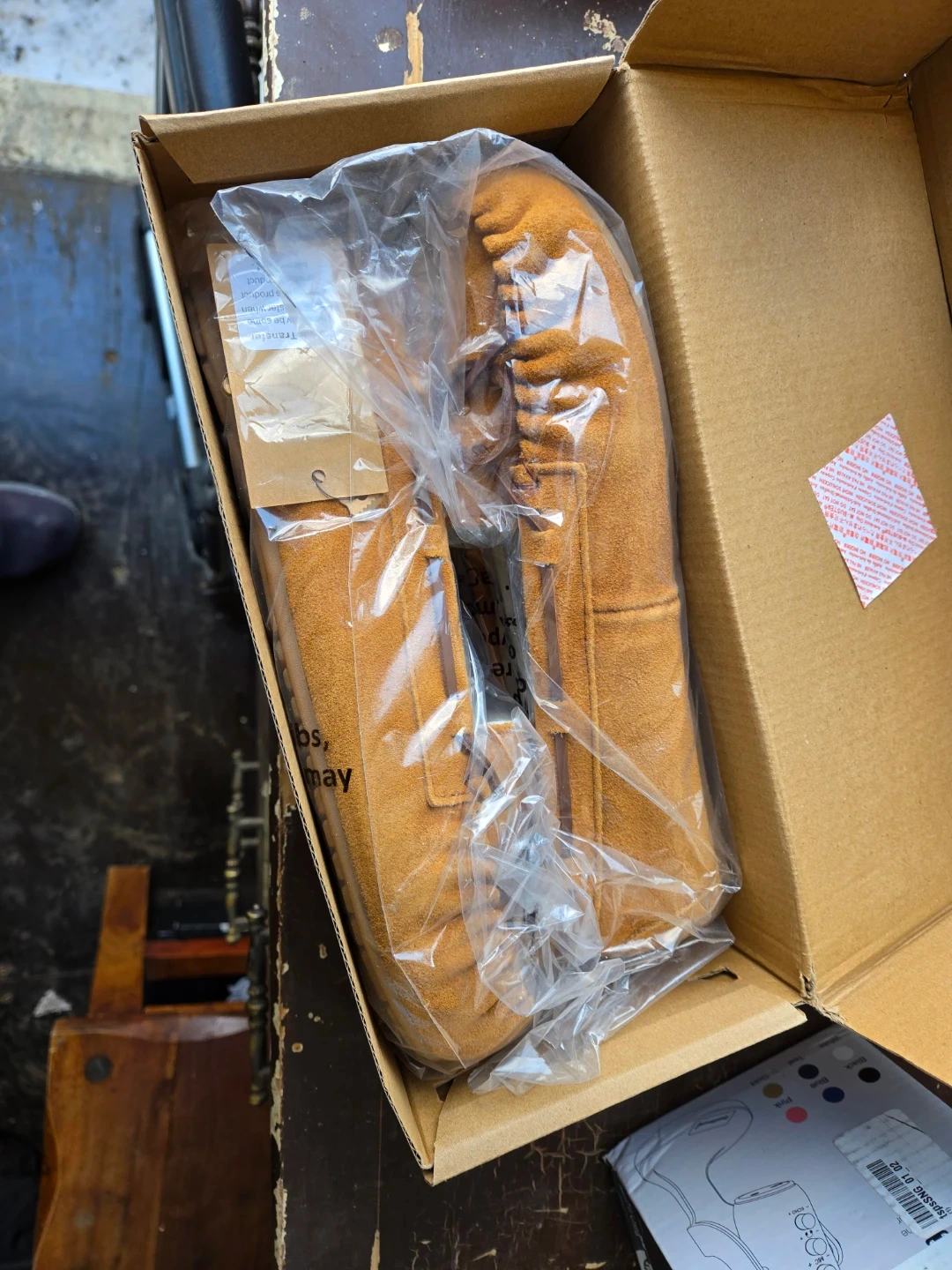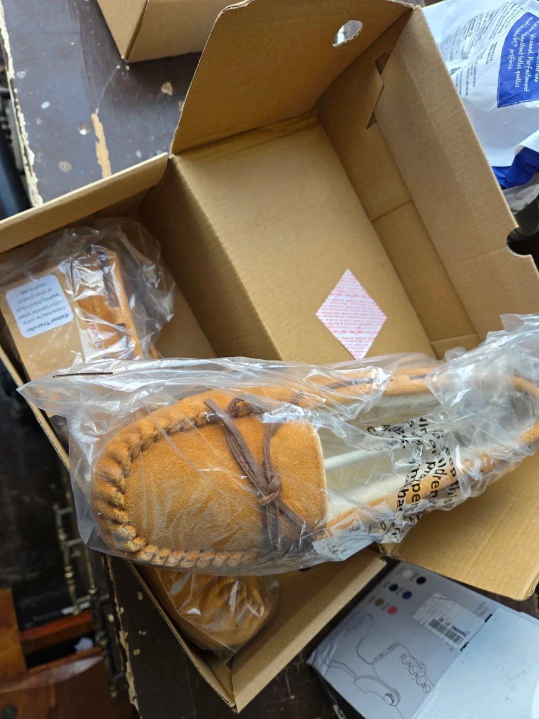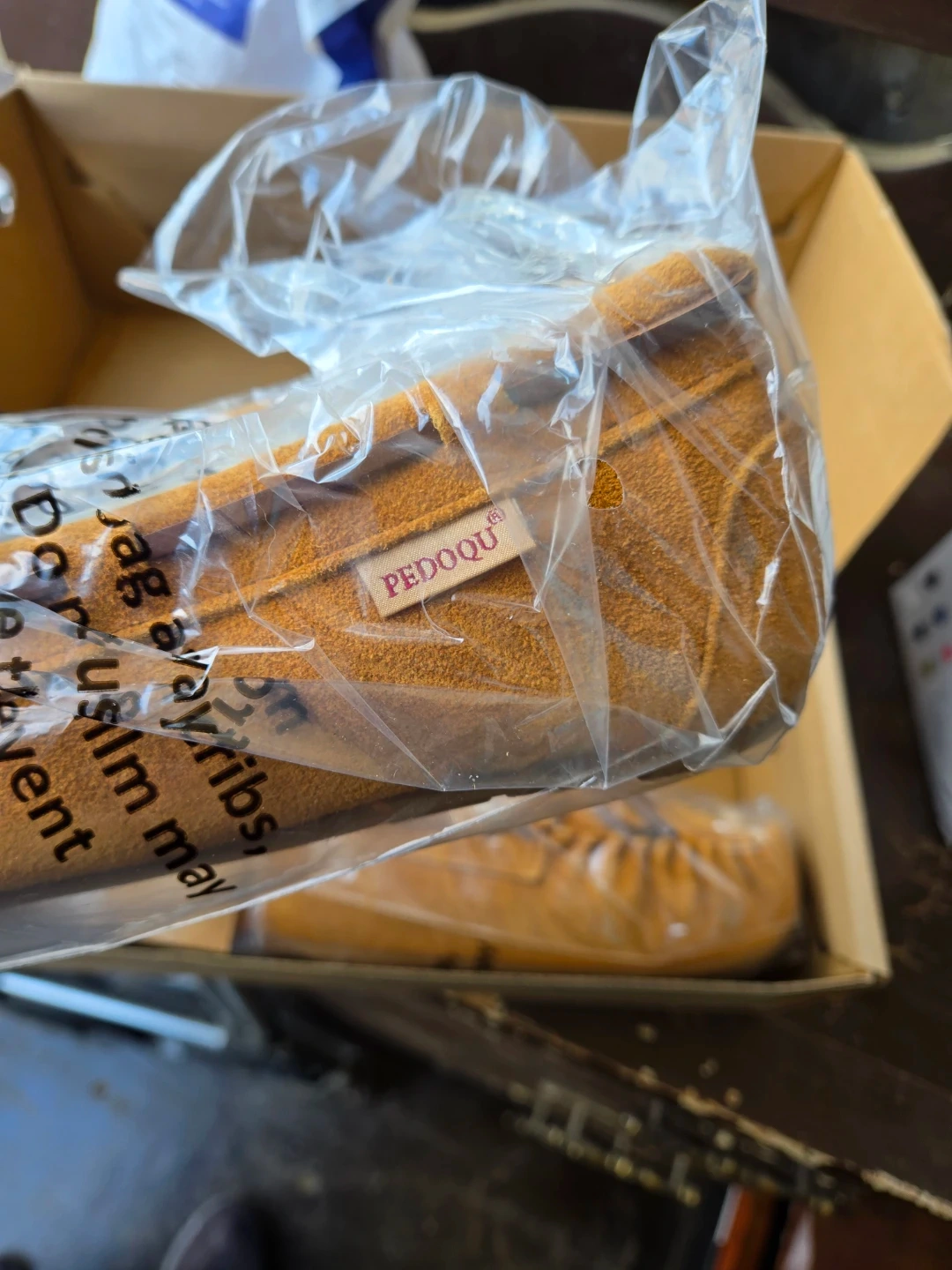 Brand new PEDOQUU indoor comfort moccasins. These are a tan suede, size 10 US, with a durable rubber sole. They're perfect for keeping your feet cozy at home!