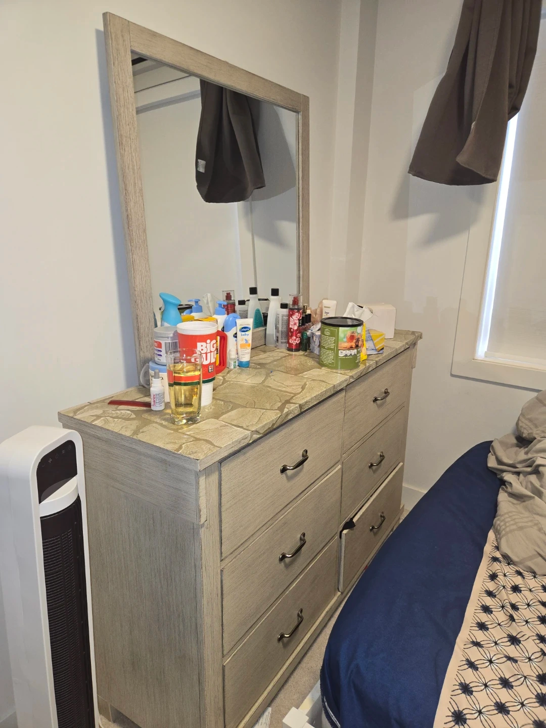 This is a six-drawer dresser with a stone-patterned top and a matching mirror. It's made of light wood and has metal drawer pulls. The dresser is a neutral colour, fitting well in many bedroom decors.
