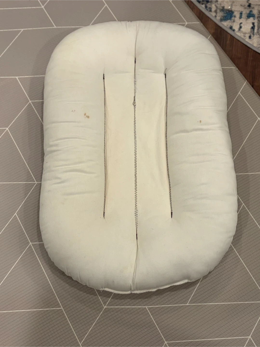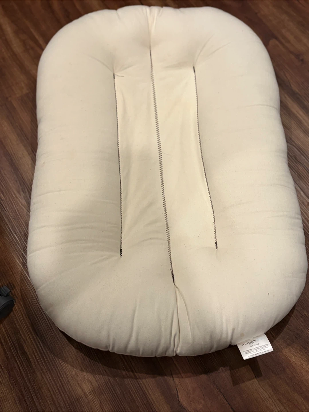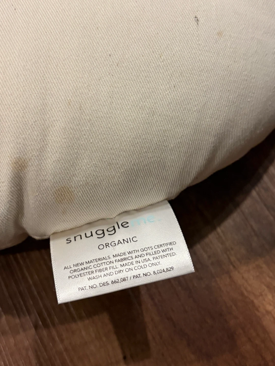 This is a Snuggle Me Organic baby lounger. It's made with GOTS certified organic cotton fabrics and polyester fiber fill.