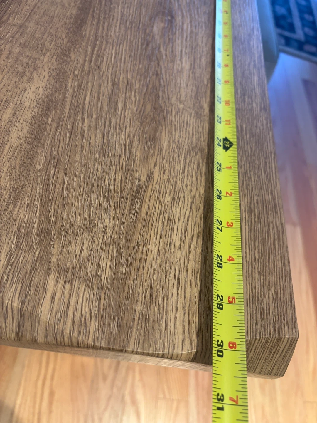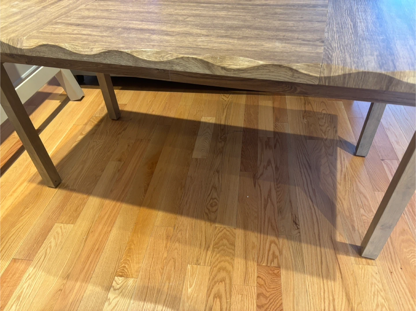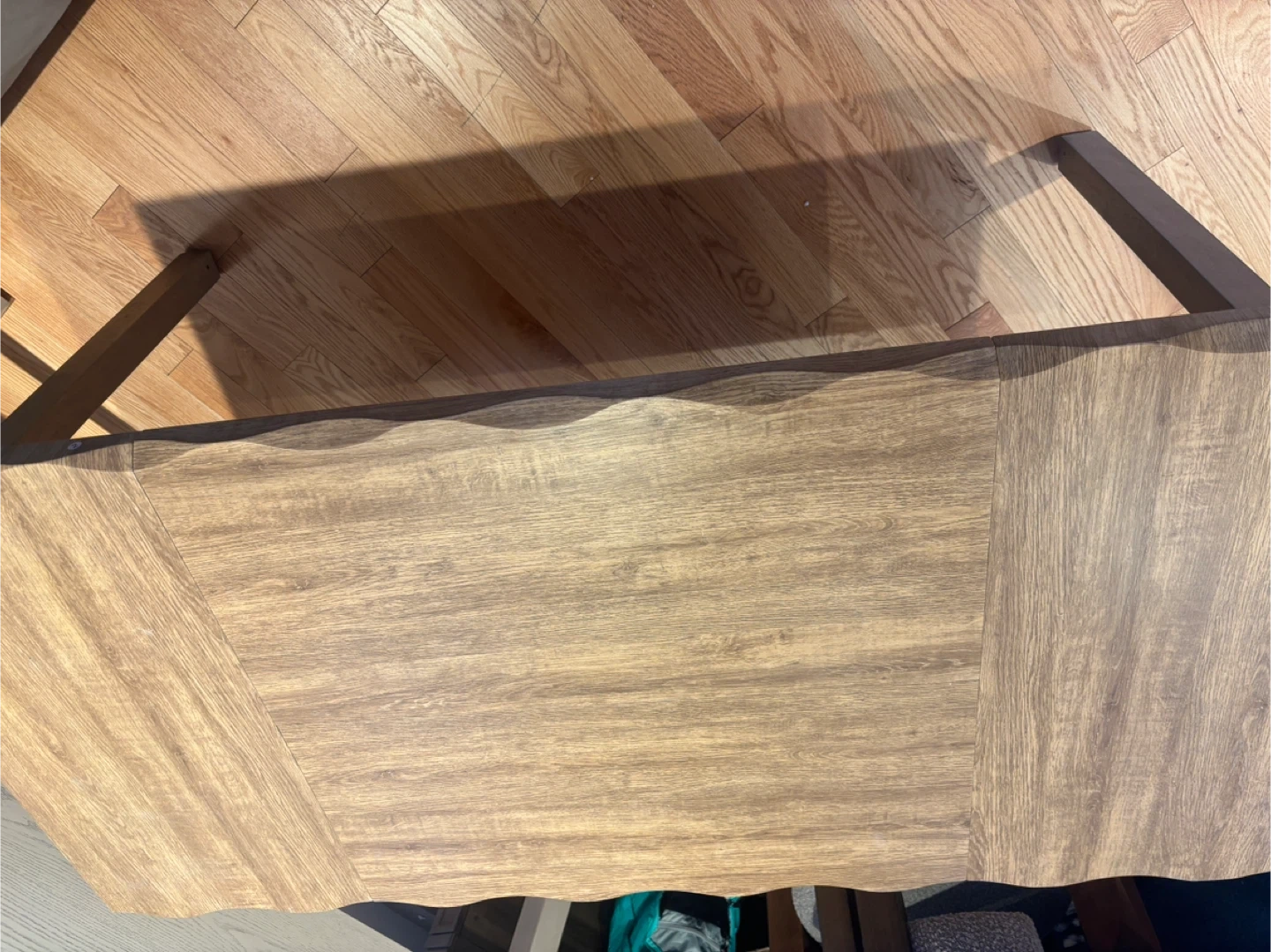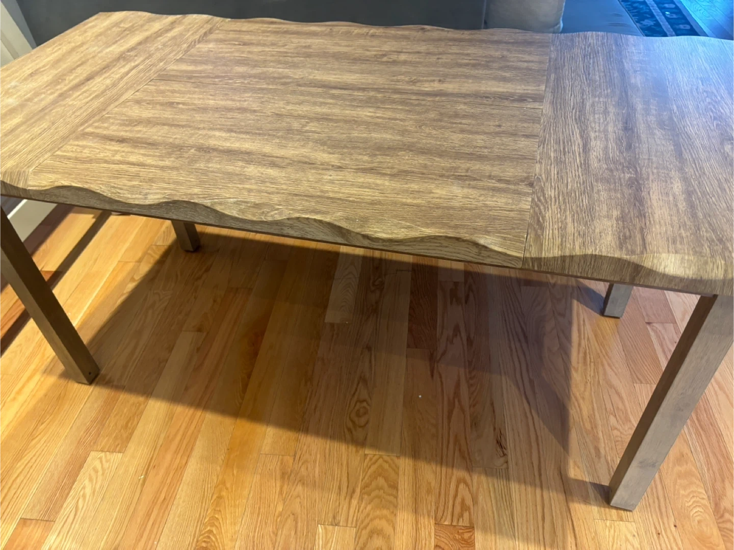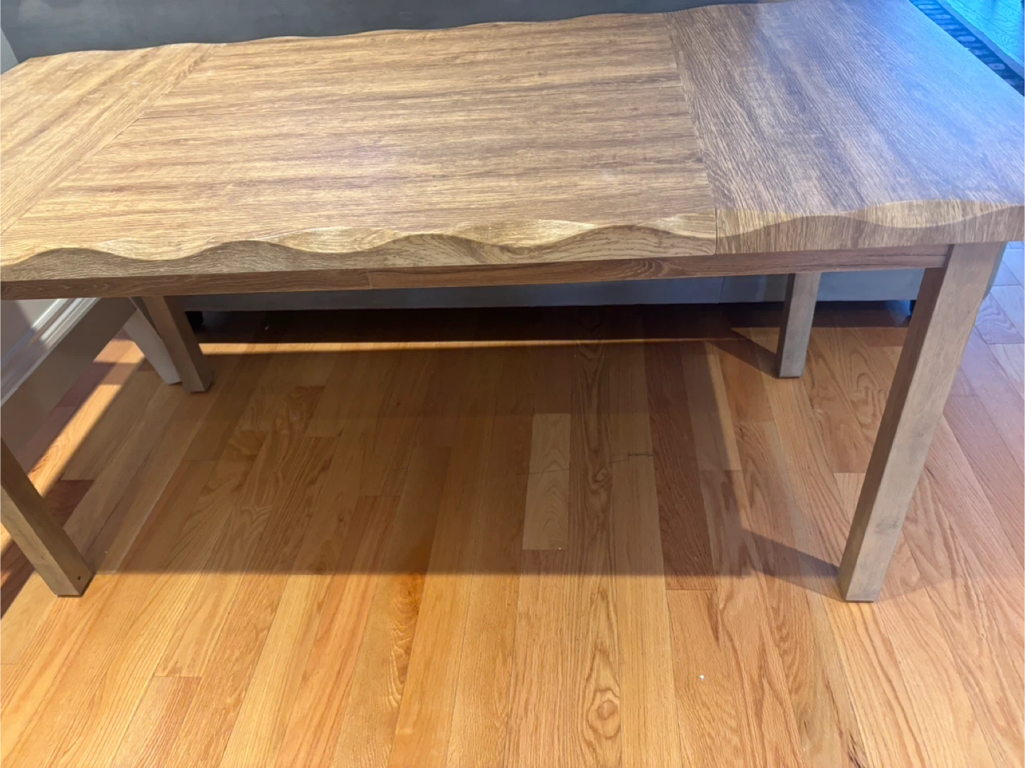 A sturdy wooden dining/Computer table with a curved wood finish. It has a wavy edge detail and a drop leaf extension. The table measures 30 inches in height.
