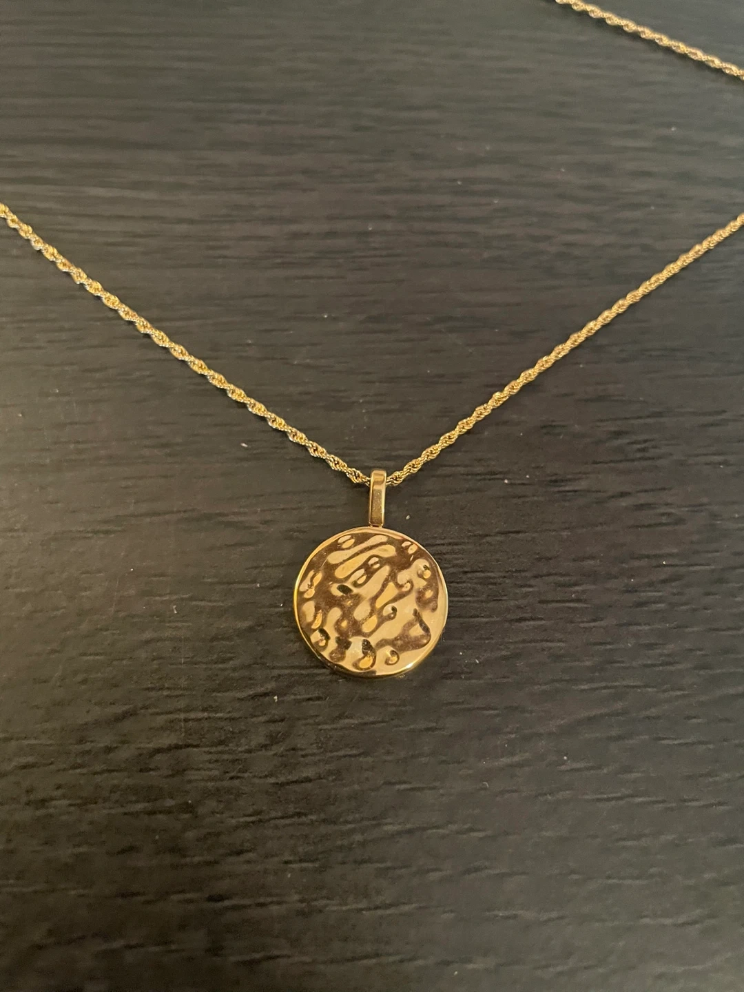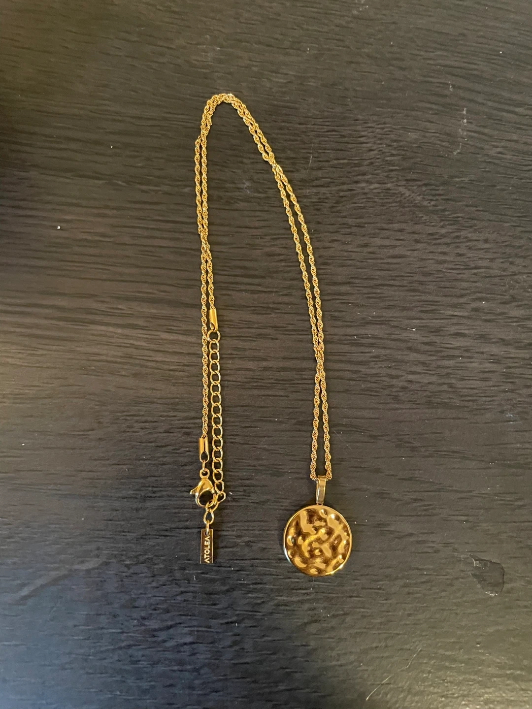 This is the Atolea Sorella Necklace. It features a hammered gold-toned pendant with a unique, organic texture. Comes with its original pouch. Waterproof jewelry.