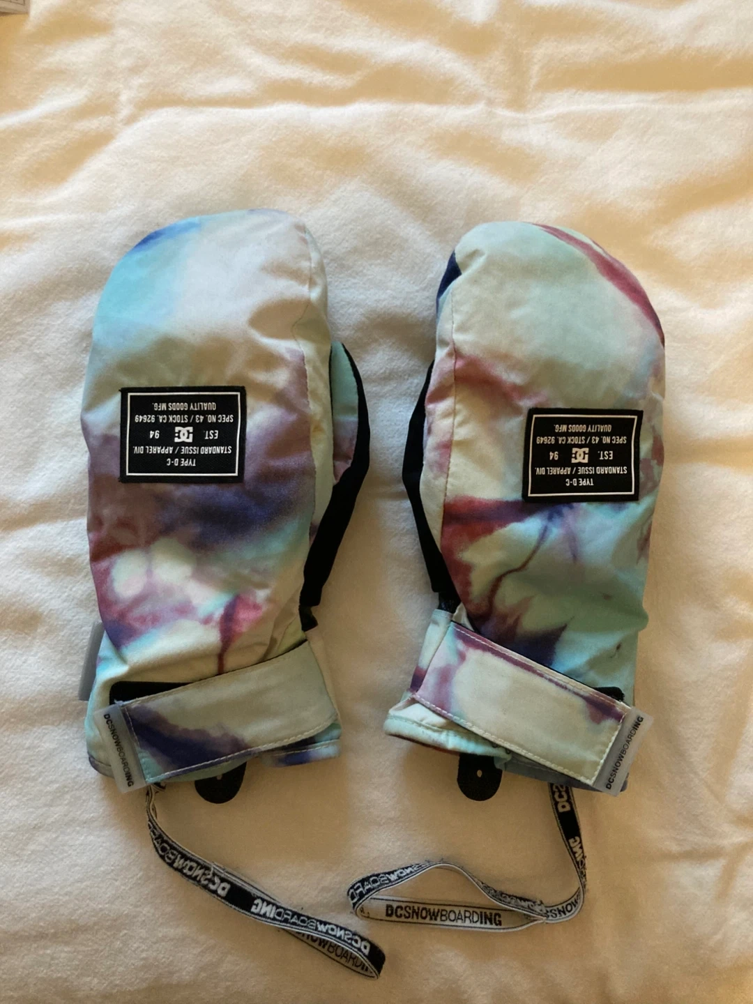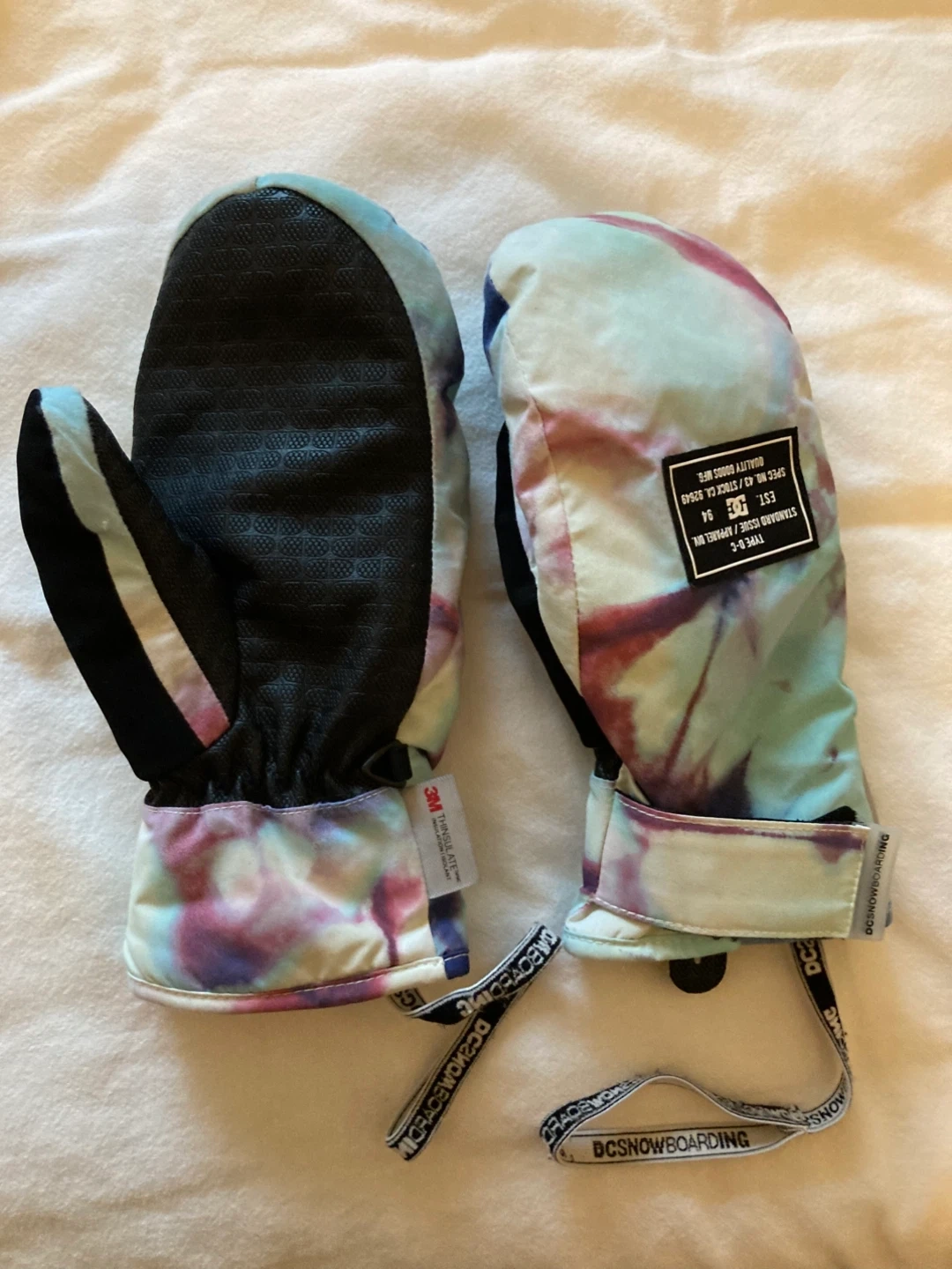 Selling a pair of DC snowboarding mittens. They're in great shape and ready for the slopes! Tie dye design, mint condition, perfect for keeping your hands warm and dry while you enjoy your winter adventures.