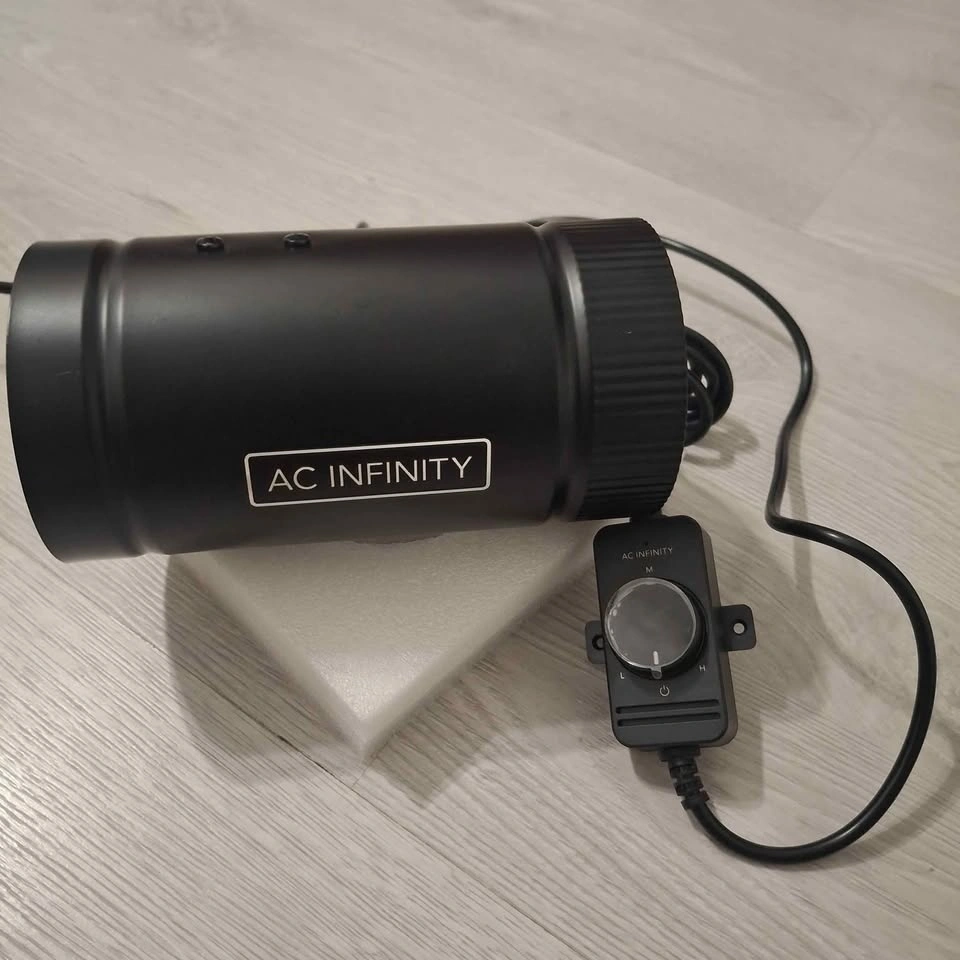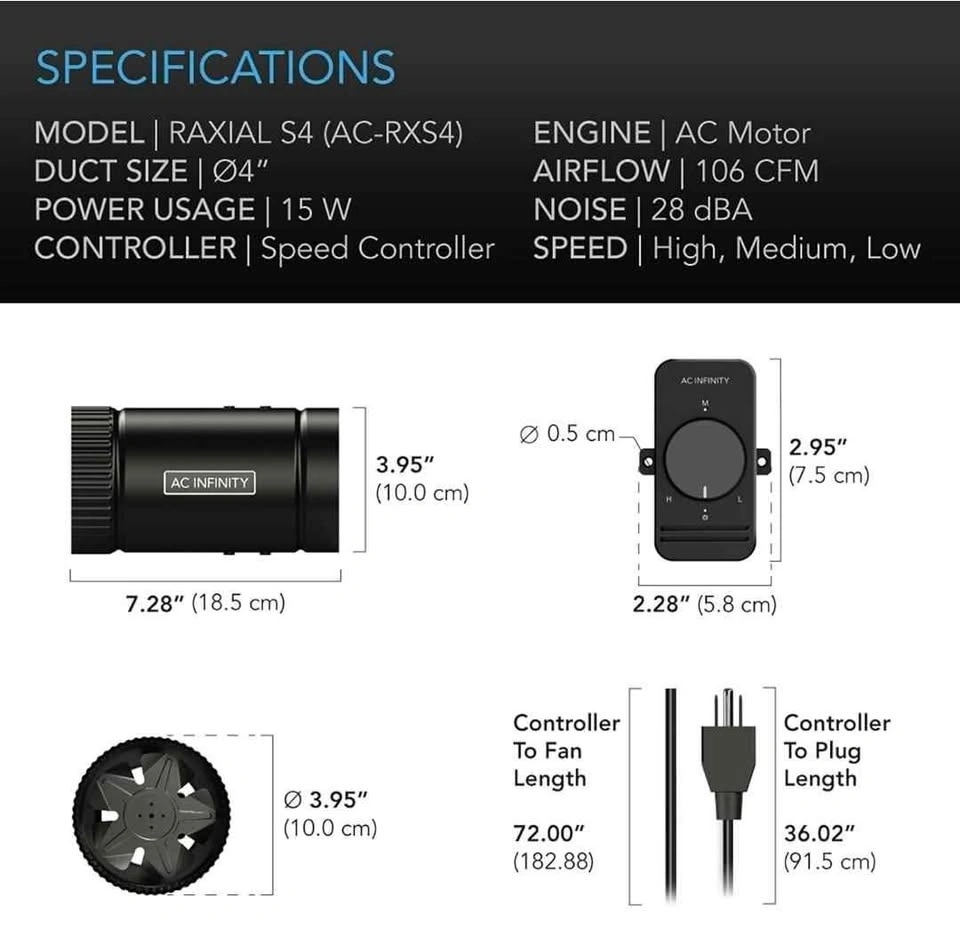 The inline variable speed controller can control the can fan’s speed and turn it on or off. Turning the knob will increase or decrease the fan speed and optimize airflow and noise levels for your application. Its speed range includes a low, medium, and high threshold, producing up to 106 CFM and 28 dBA in noise.