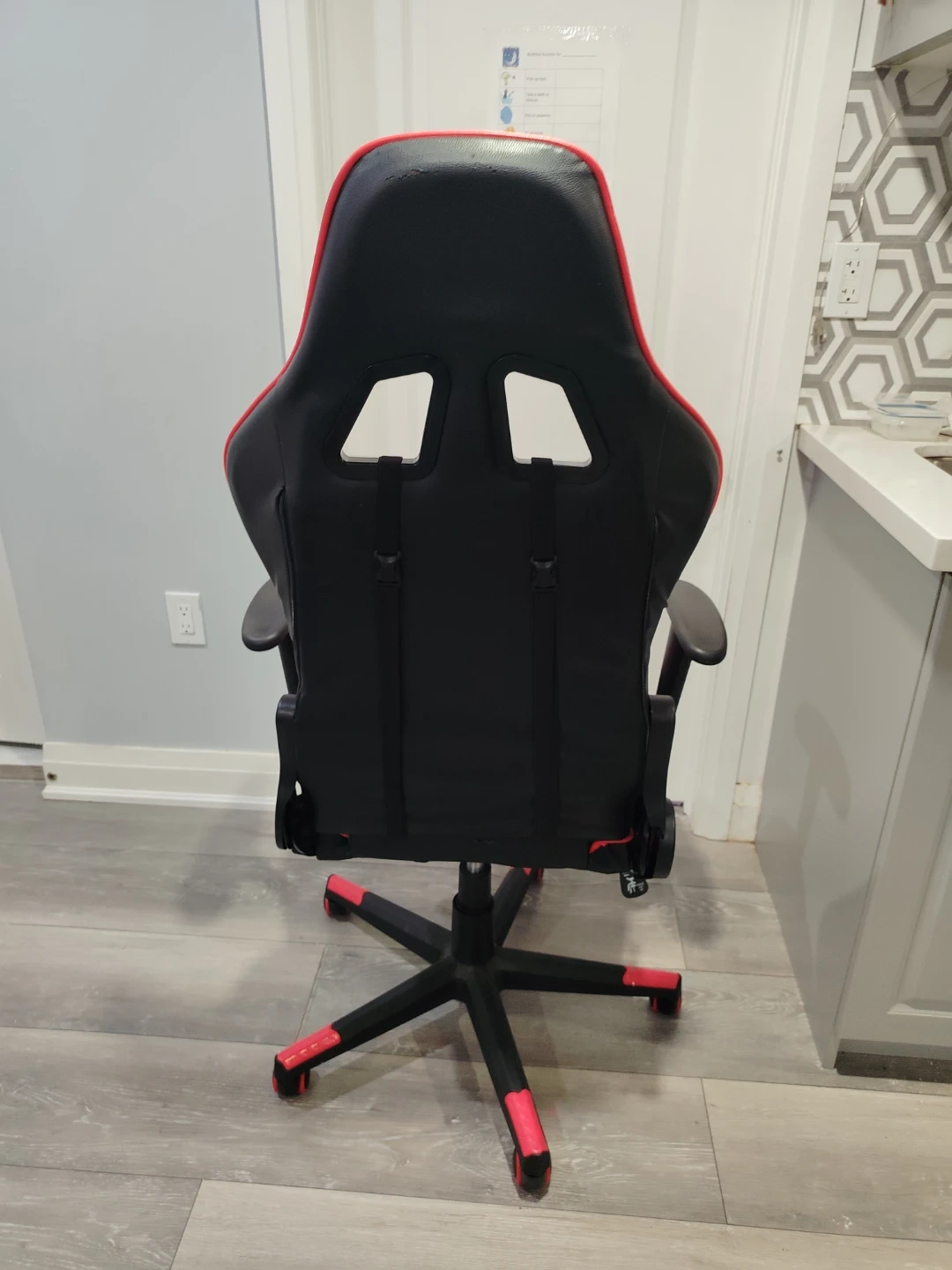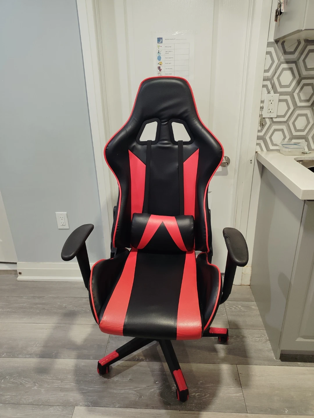 Selling a gaming chair in red and black. It has a comfortable design and is perfect for long gaming sessions or working from home. The chair is in good condition. Back support cushion is movable up and down and also has a massager - USB connected. It's also removable. 52 inches total height.