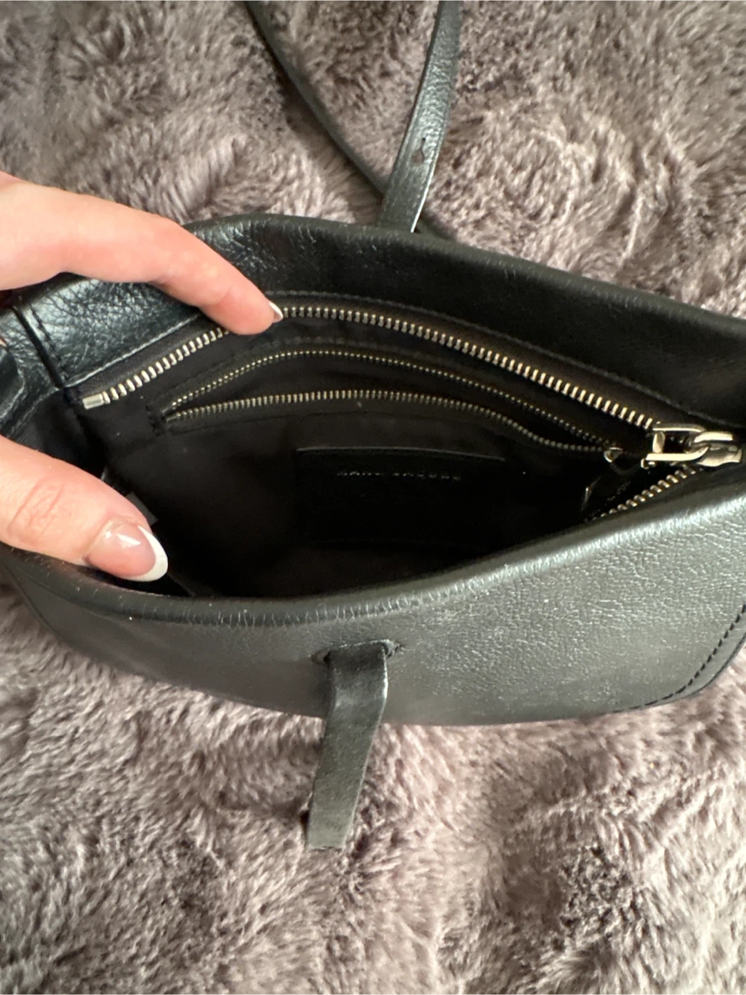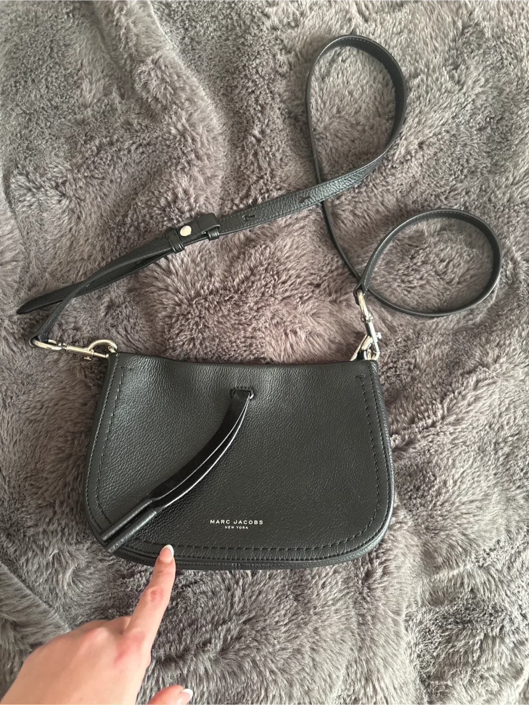 This is a black leather crossbody bag from Marc Jacobs. It has a zip closure and an adjustable strap. Made in Italy.