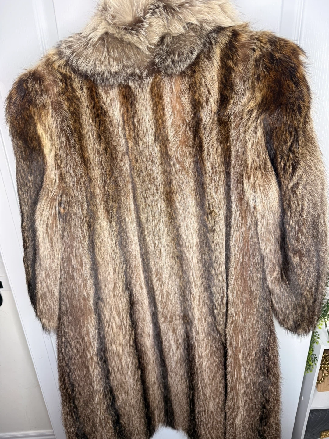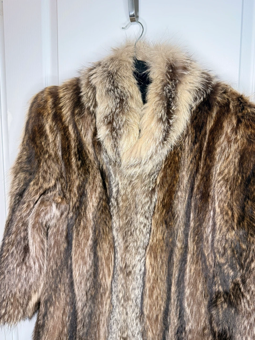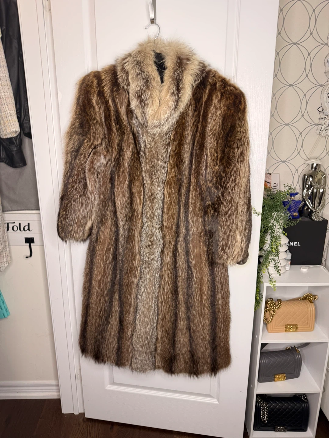 Elevate your style with this luxurious brown fur coat. Perfect for adding a touch of elegance to any outfit. Has outer pockets Shoulder padding Built in scarf, the top piece can be worn open or closed No rips The size is not noted but I believe it’s 10-12 PTP 22” Waist 27” length 45” Sleeve 22” Fur is not noted but I believe it’s Raccoon Appearance: Raccoon fur typically has a soft, dense undercoat with longer guard hairs. The color can vary, often featuring shades of grey and silver with darker stripes, especially noticeable on the tail. A reddish-colored variation, known as 'Tanuki', is also seen. Durability and Warmth: The fur is dense and the leather is strong, making raccoon fur coats very warm and durable, often lasting for many decades with proper care. Usage: It is frequently used in full-length coats, car coats, and jackets, and can also be found as trim on other garments.