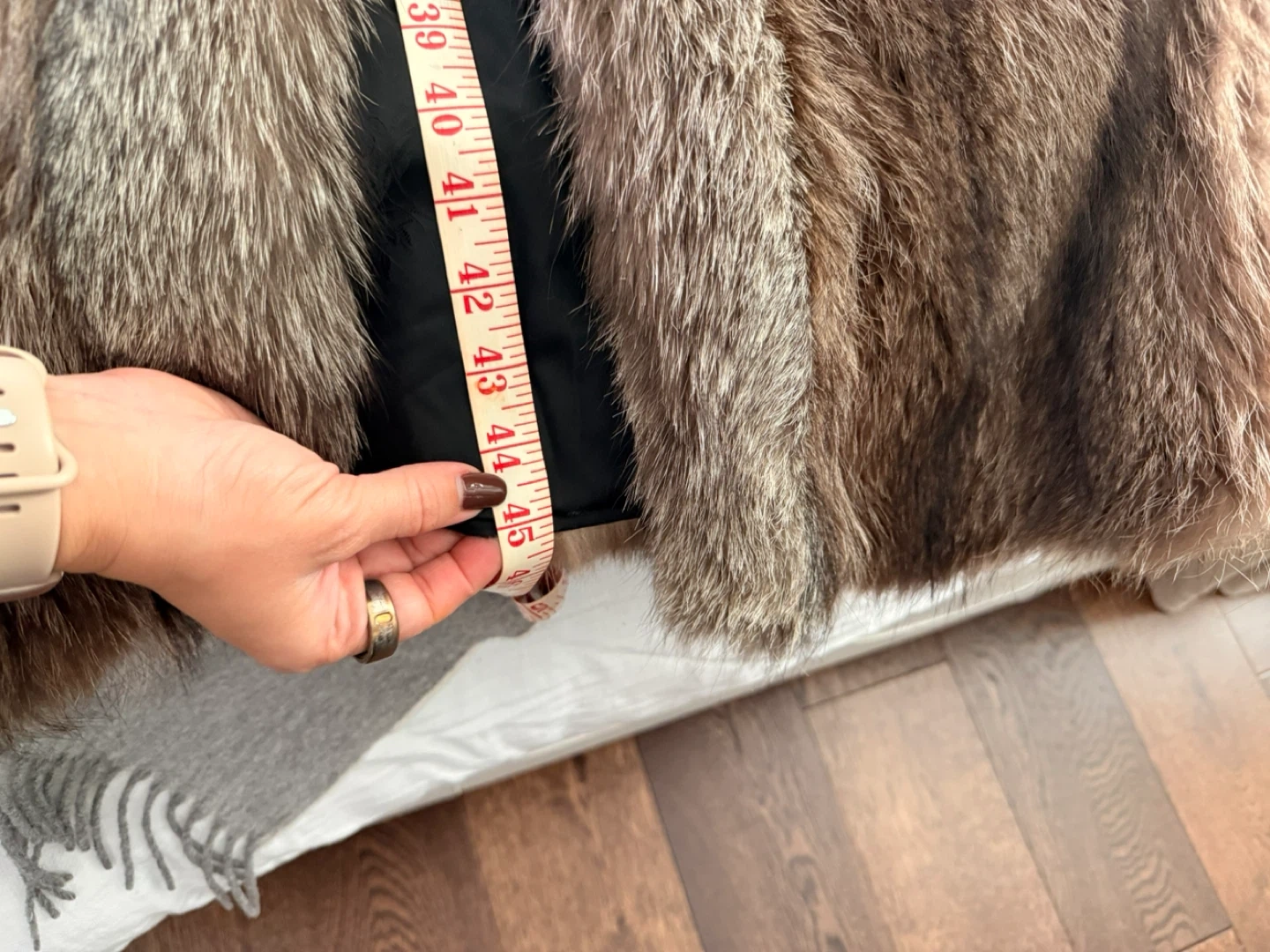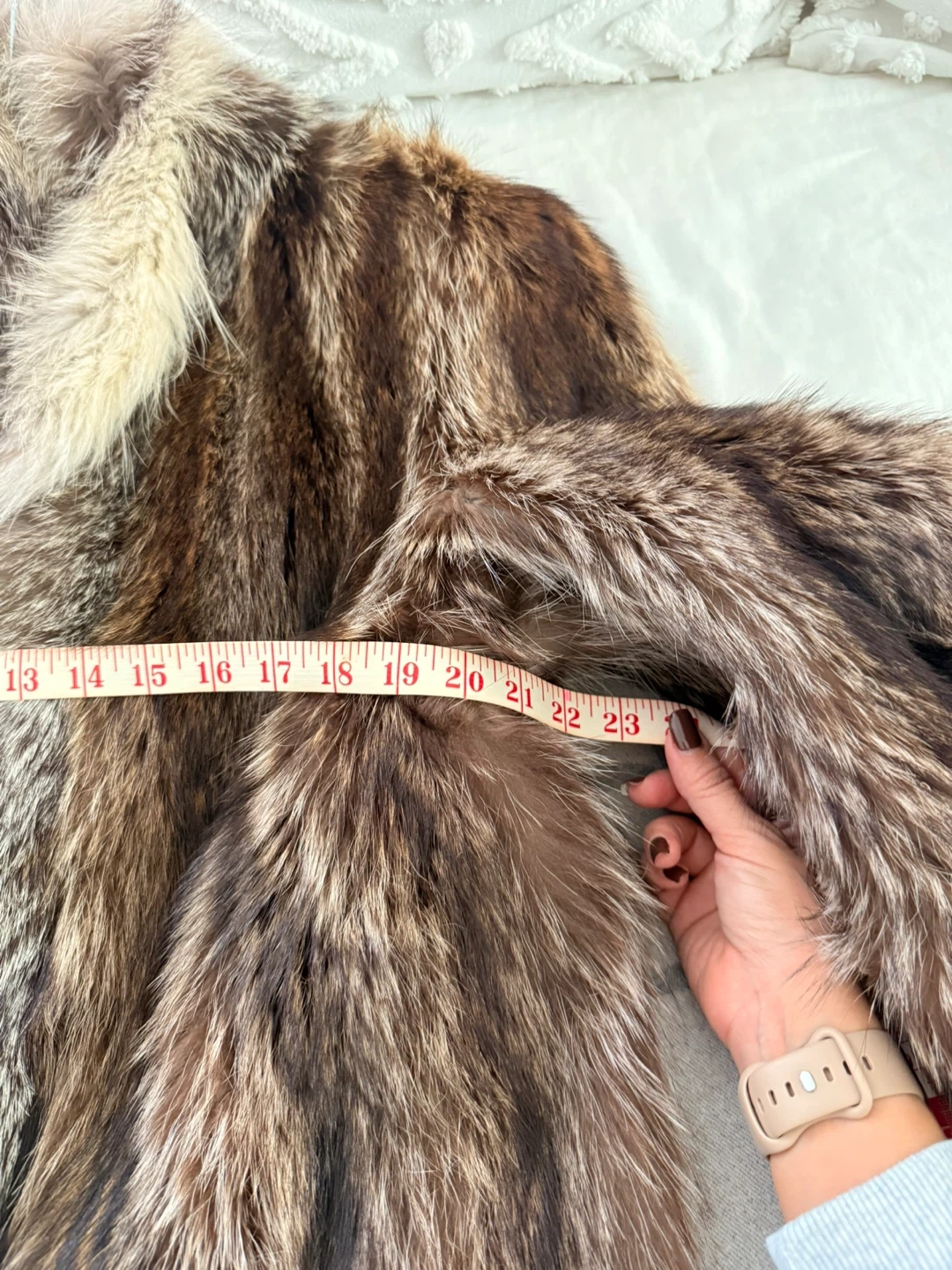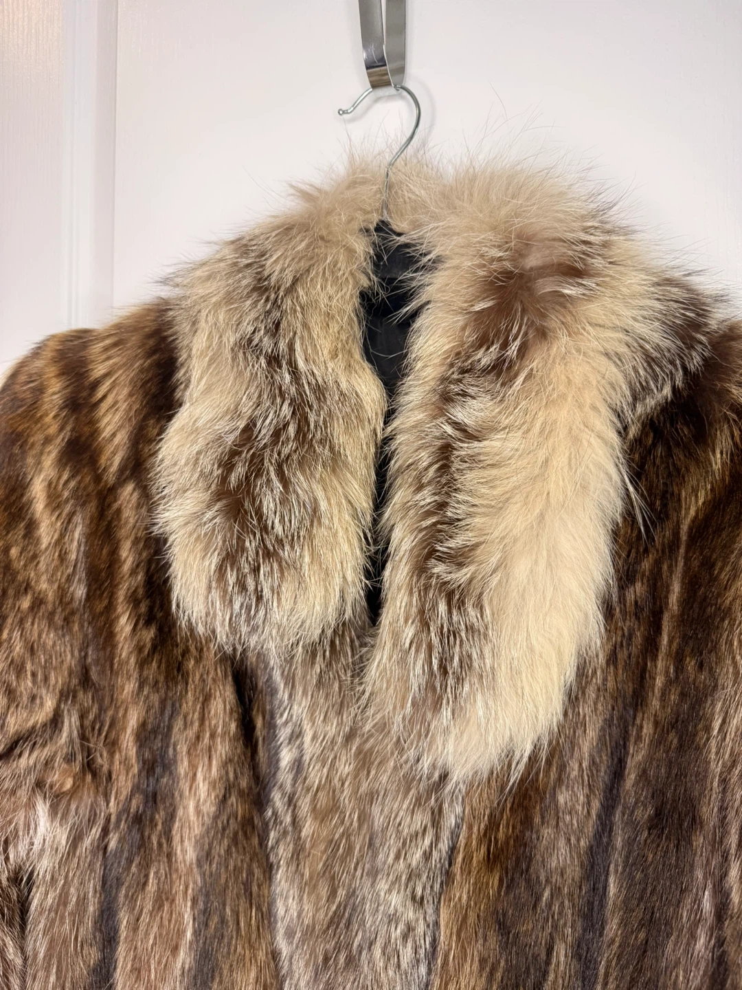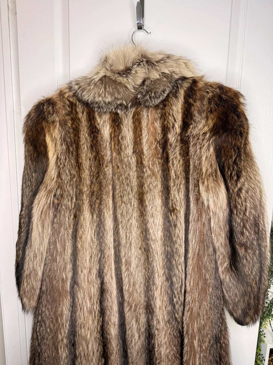 Elevate your style with this luxurious brown fur coat. Perfect for adding a touch of elegance to any outfit. Has outer pockets Shoulder padding Built in scarf, the top piece can be worn open or closed No rips The size is not noted but I believe it’s 10-12 PTP 22” Waist 27” length 45” Sleeve 22” Fur is not noted but I believe it’s Raccoon Appearance: Raccoon fur typically has a soft, dense undercoat with longer guard hairs. The color can vary, often featuring shades of grey and silver with darker stripes, especially noticeable on the tail. A reddish-colored variation, known as 'Tanuki', is also seen. Durability and Warmth: The fur is dense and the leather is strong, making raccoon fur coats very warm and durable, often lasting for many decades with proper care. Usage: It is frequently used in full-length coats, car coats, and jackets, and can also be found as trim on other garments.