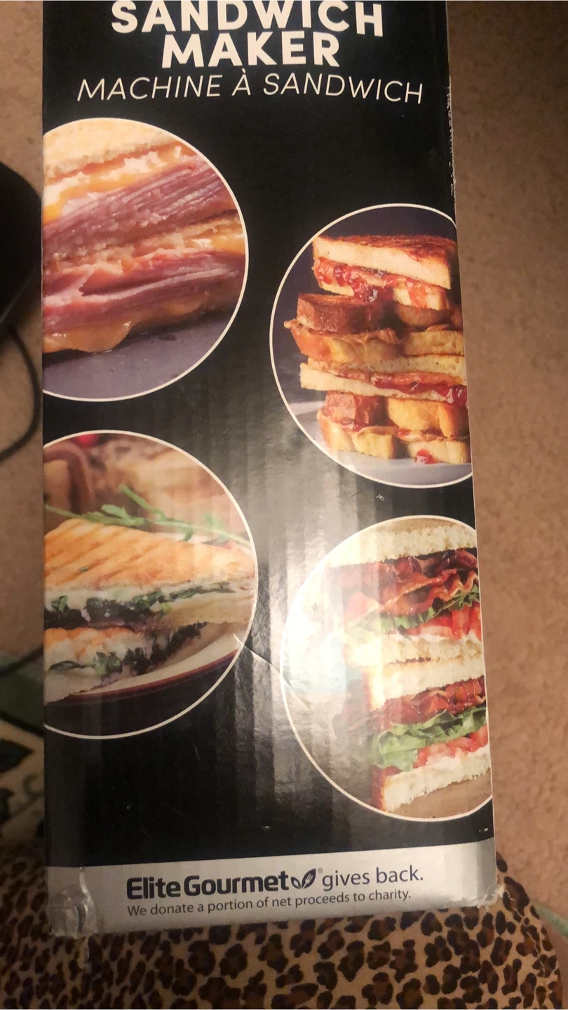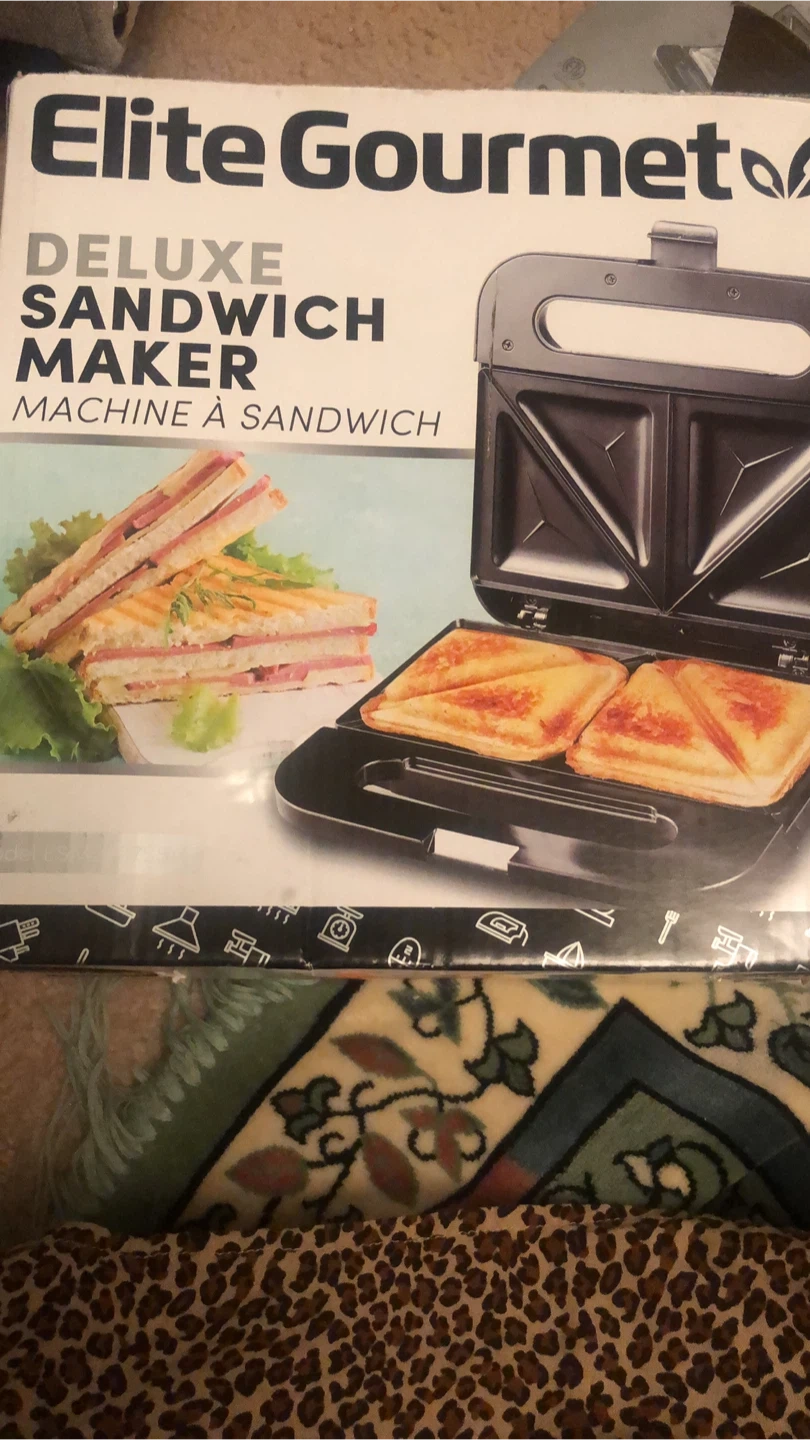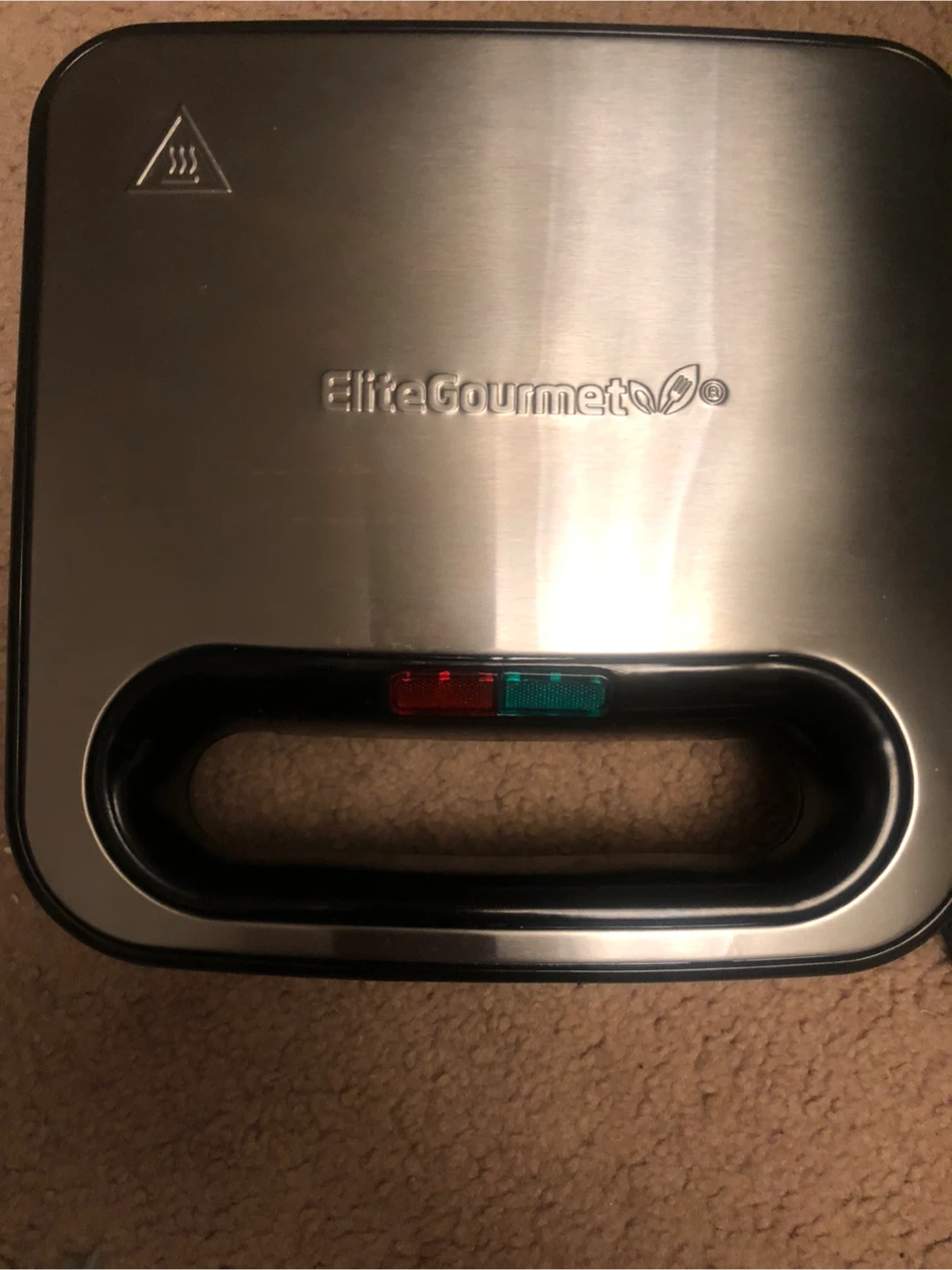This Elite Gourmet Deluxe Sandwich Maker is designed for quick and easy sandwich preparation. It features non-stick cooking plates for simple cleanup and a stainless-steel top cover. Red and green indicator lights let you know when it's powered on and ready to cook.
