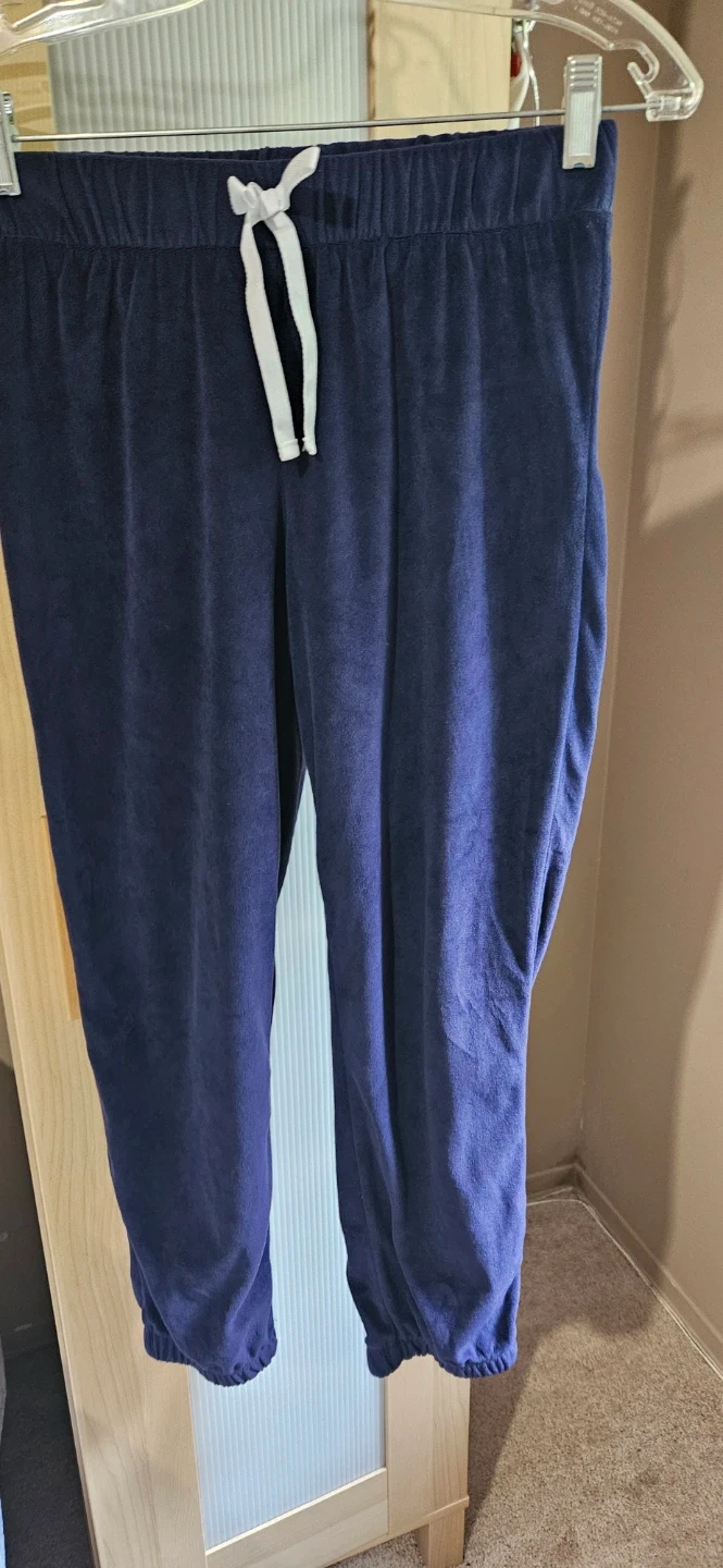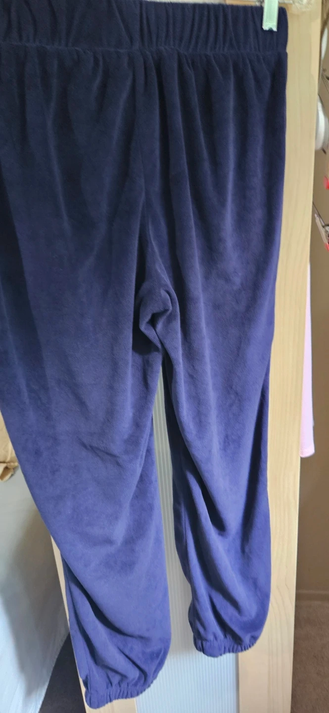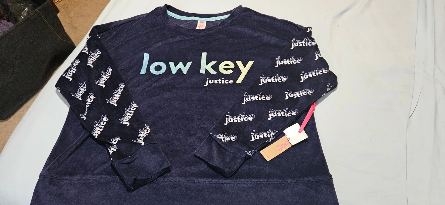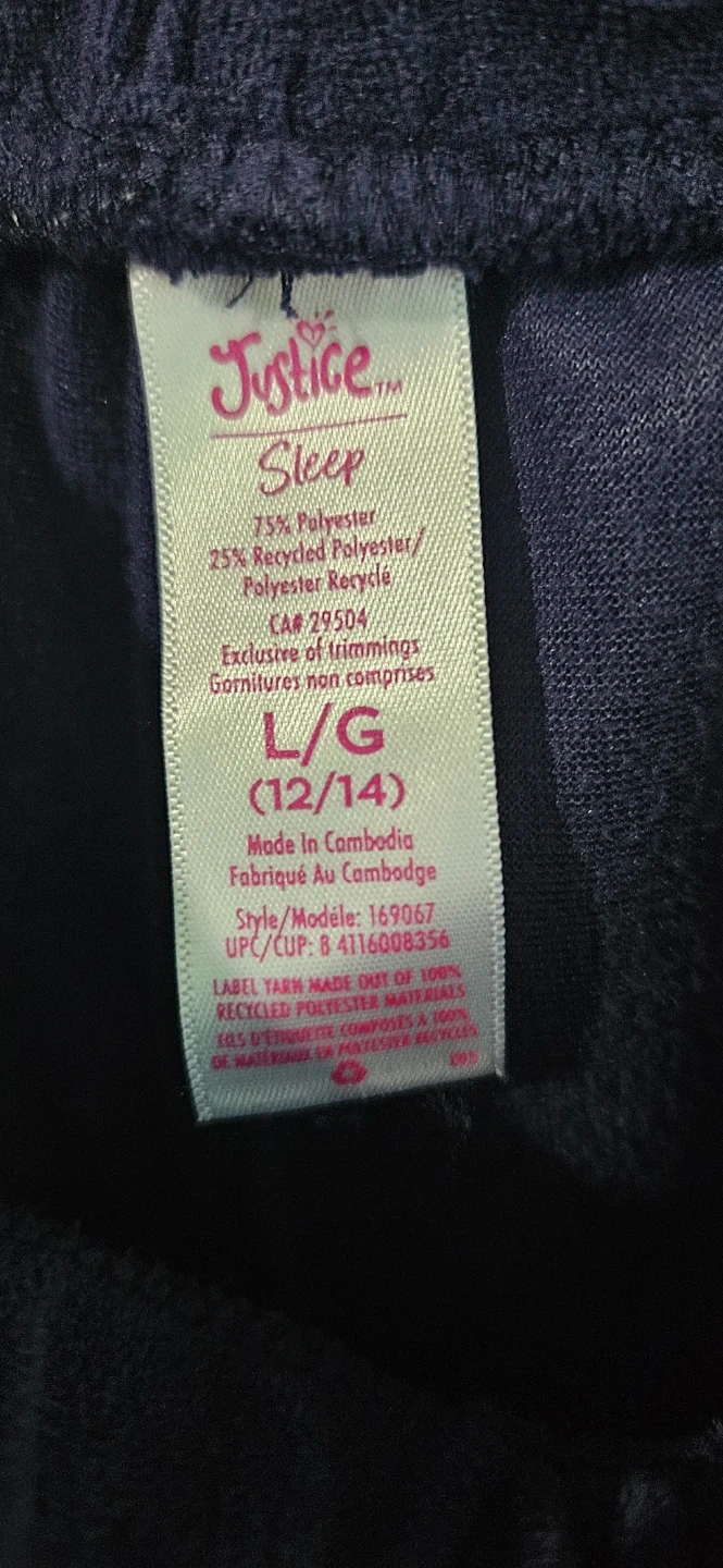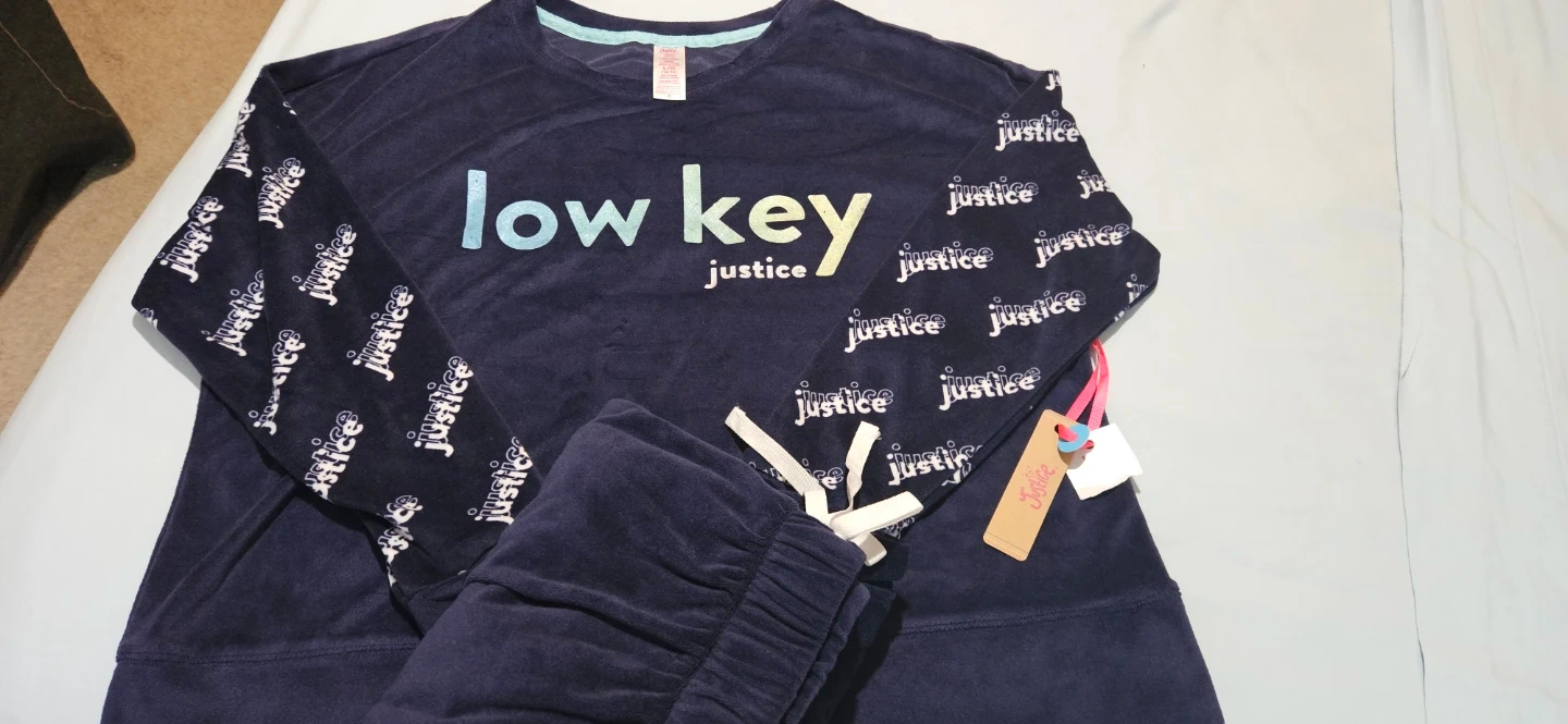 This navy velour sleep set features the "Low Key" graphic on the front with "Justice" repeated on the sleeves. It's a size L/G (12/14). Made with 75% polyester and 25% recycled polyester. Elastic waistband on pants.