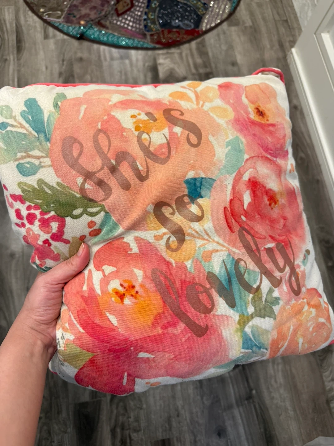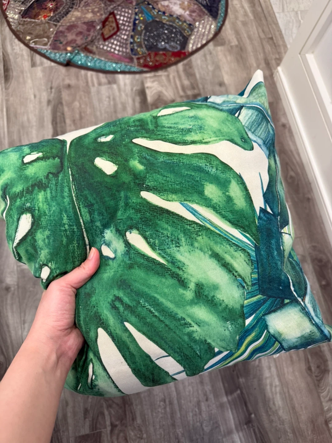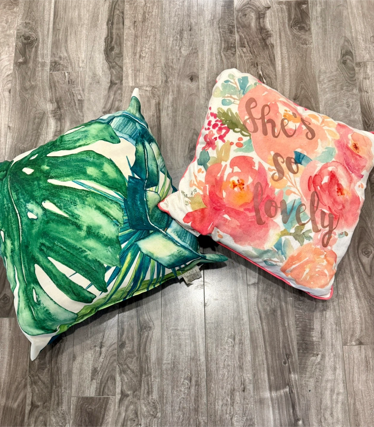 Two decorative throw pillows featuring vibrant floral and tropical leaf prints. One pillow has a 'She's so lovely' floral design, and the other has a large green monstera leaf pattern. They'll add a pop of colour and style to any room!