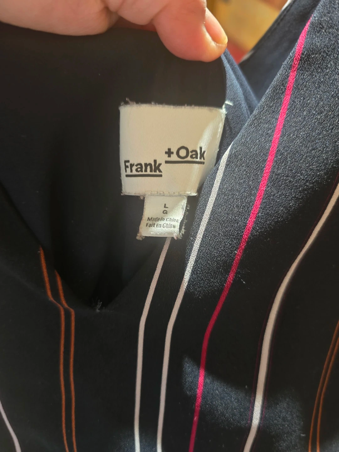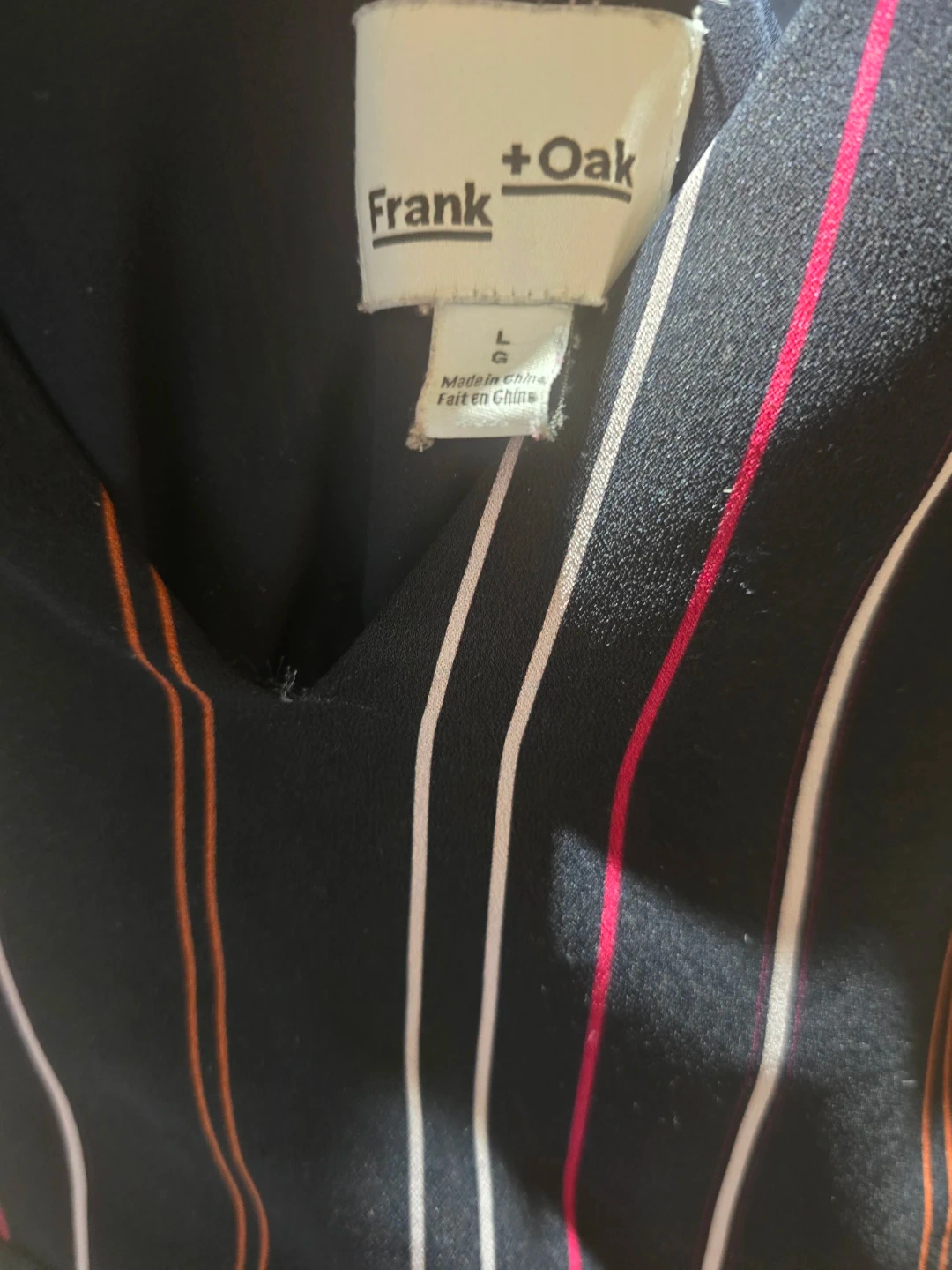 This Frank + Oak jumpsuit features a black base with multicoloured vertical stripes. It's a size large with an elasticated waist. The fabric appears to be a lightweight material, perfect for all seasons.