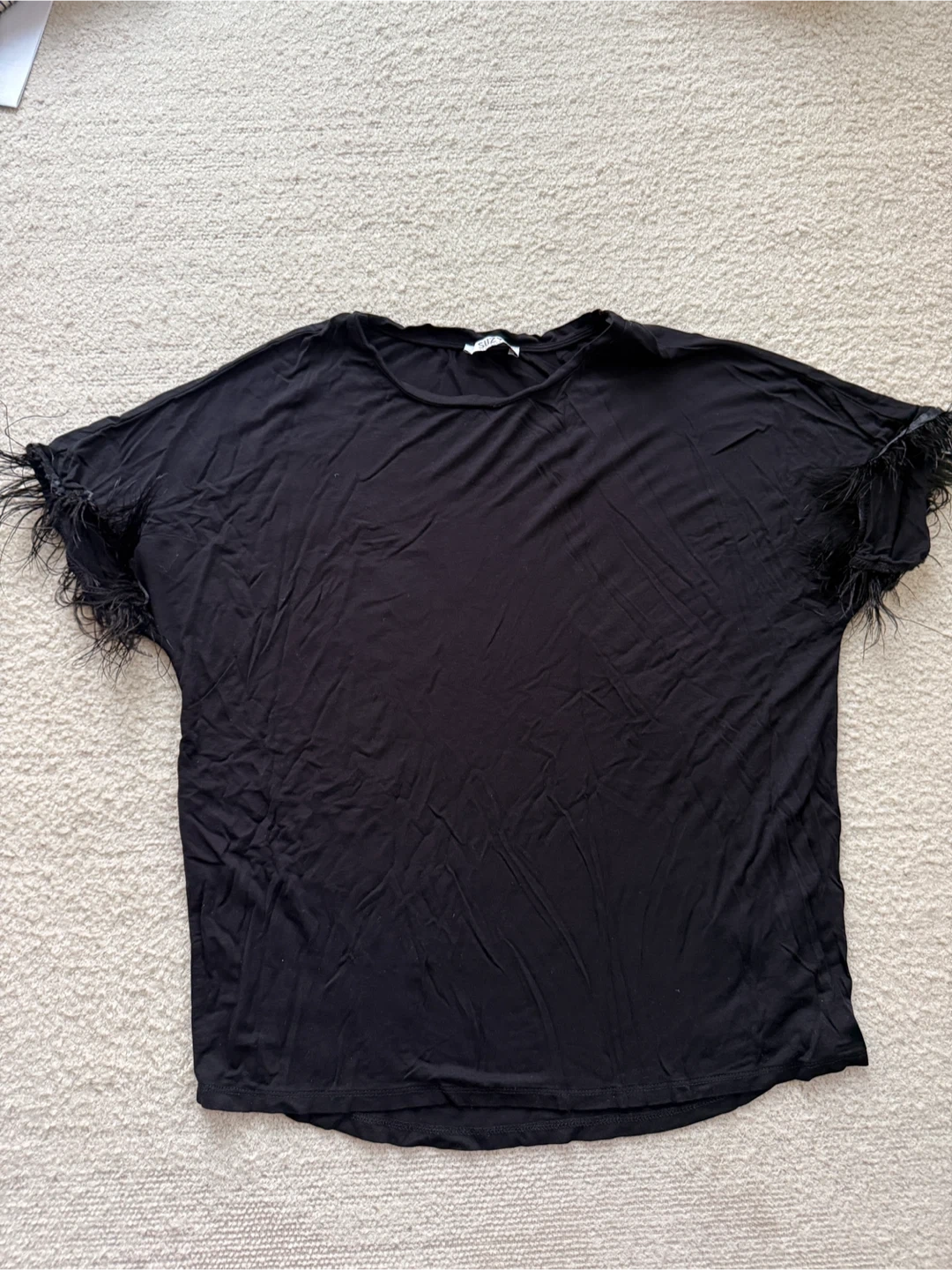 This black t-shirt features a relaxed fit and decorative feather trim on the sleeves. It's made of a soft, comfortable fabric. This top is great for adding a touch of flair to a casual outfit!