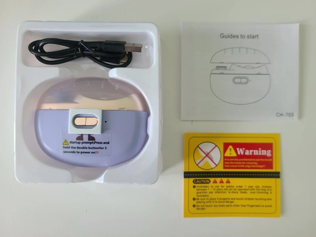 Selling a brand new multifunctional electric nail clipper that trims and clips. It has safety and shield features, lighting, and nail chip storage. The clipper includes a polish plate and an alloy cutter head. It has an ultra-long battery life and two speeds, plus it comes with a Type-C charger.