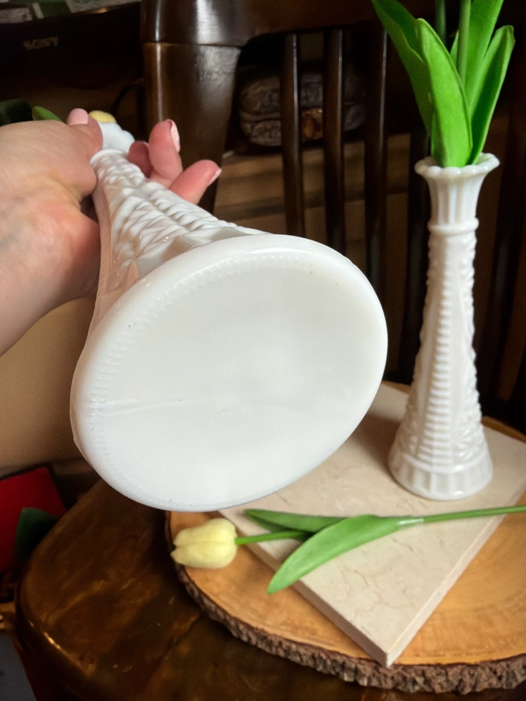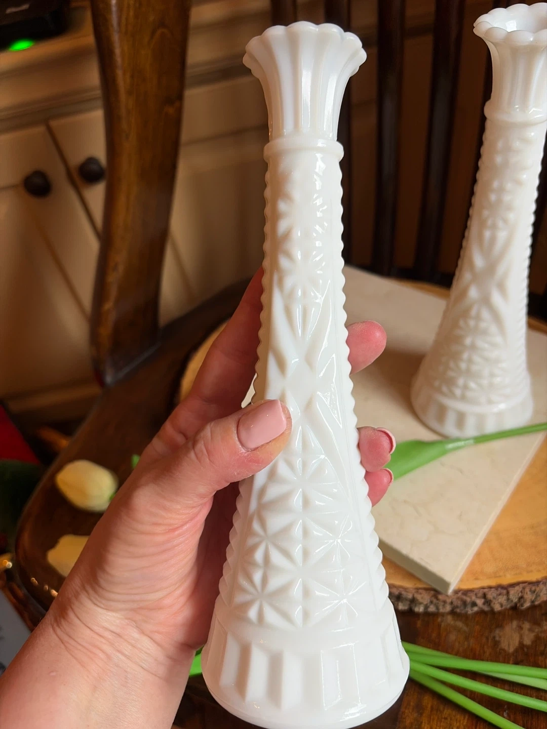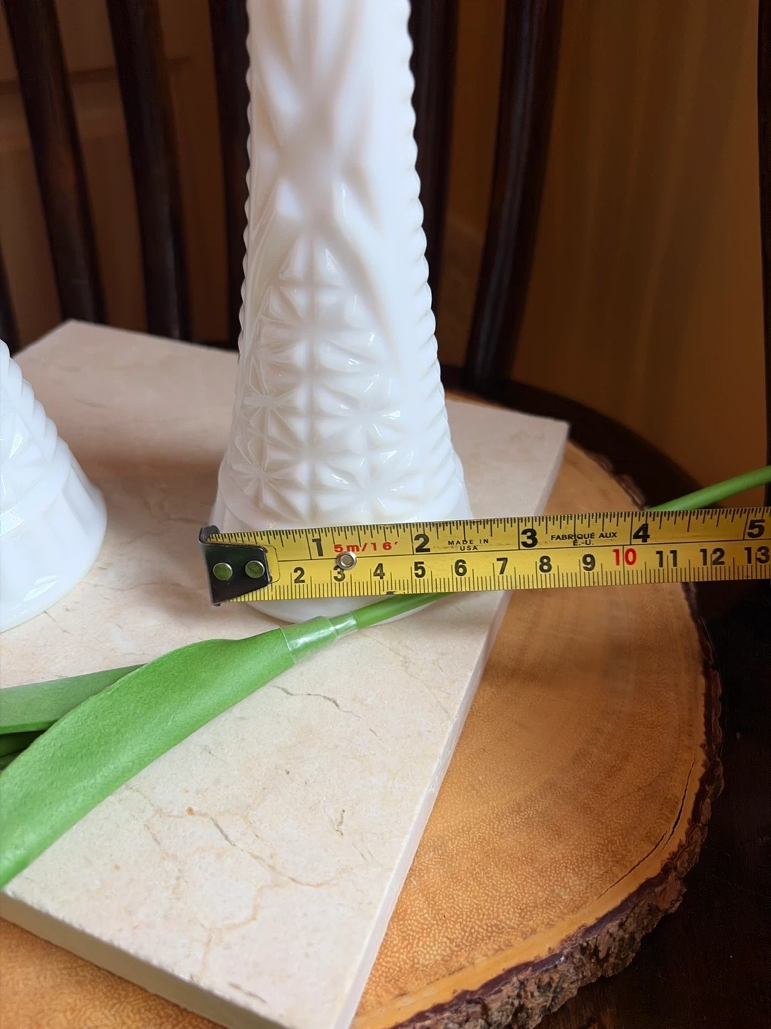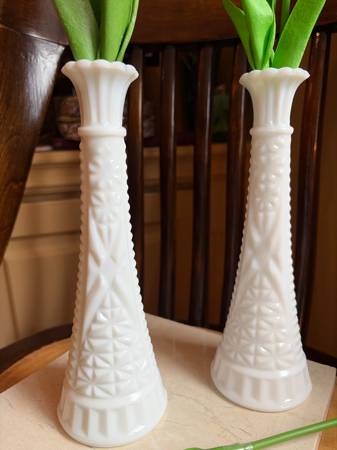 Two elegant vintage Anchor Hocking white milk glass vases with a textured pattern called Stars and Bars. These vases stand tall at 10β and have a flared rim. They're perfect for displaying flowers in any room and go with any decor colour scheme. No chips or cracks. Ready for some beautiful flowers for your tablescape! π·π·π·