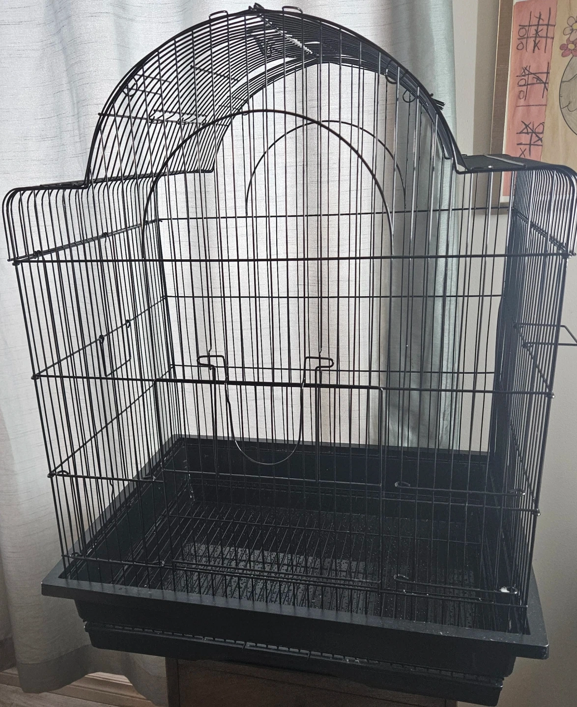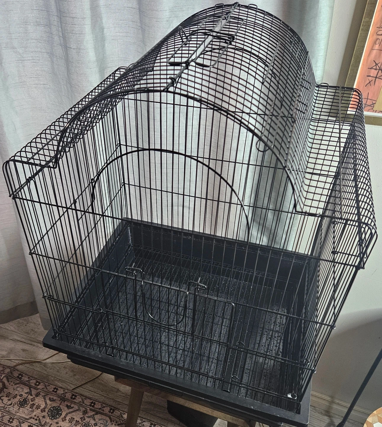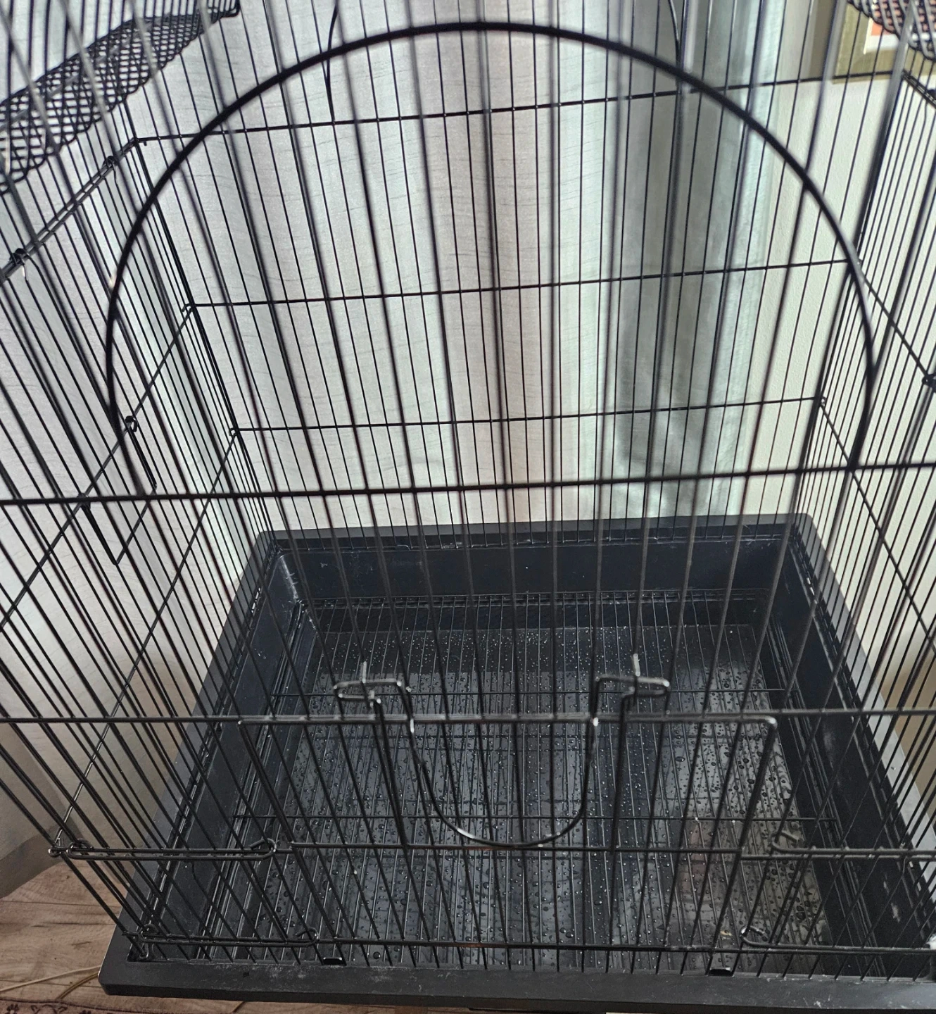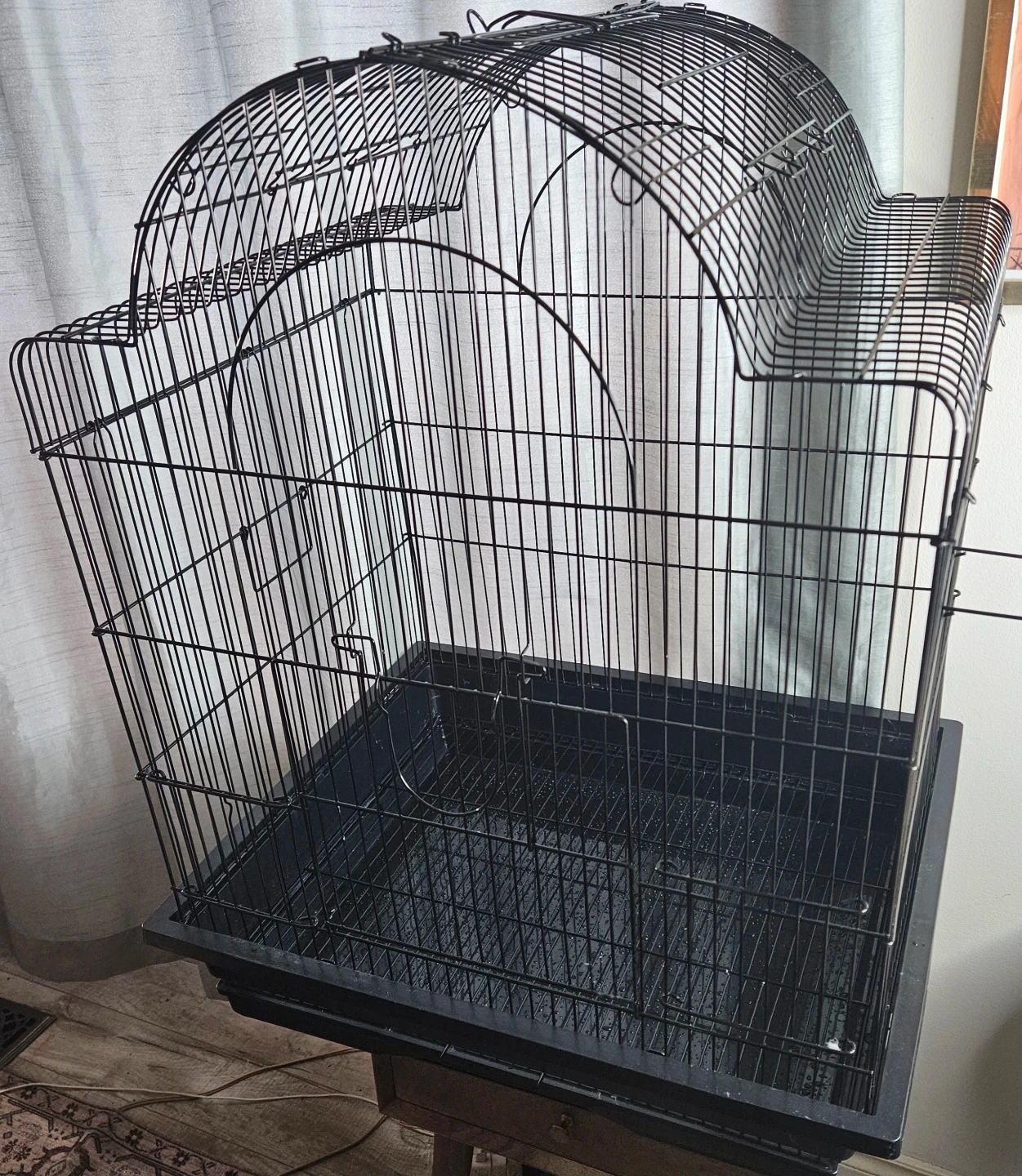 This is a black bird cage with a removable tray for easy cleaning. It's made of sturdy wire. It would be suitable for smaller birds.