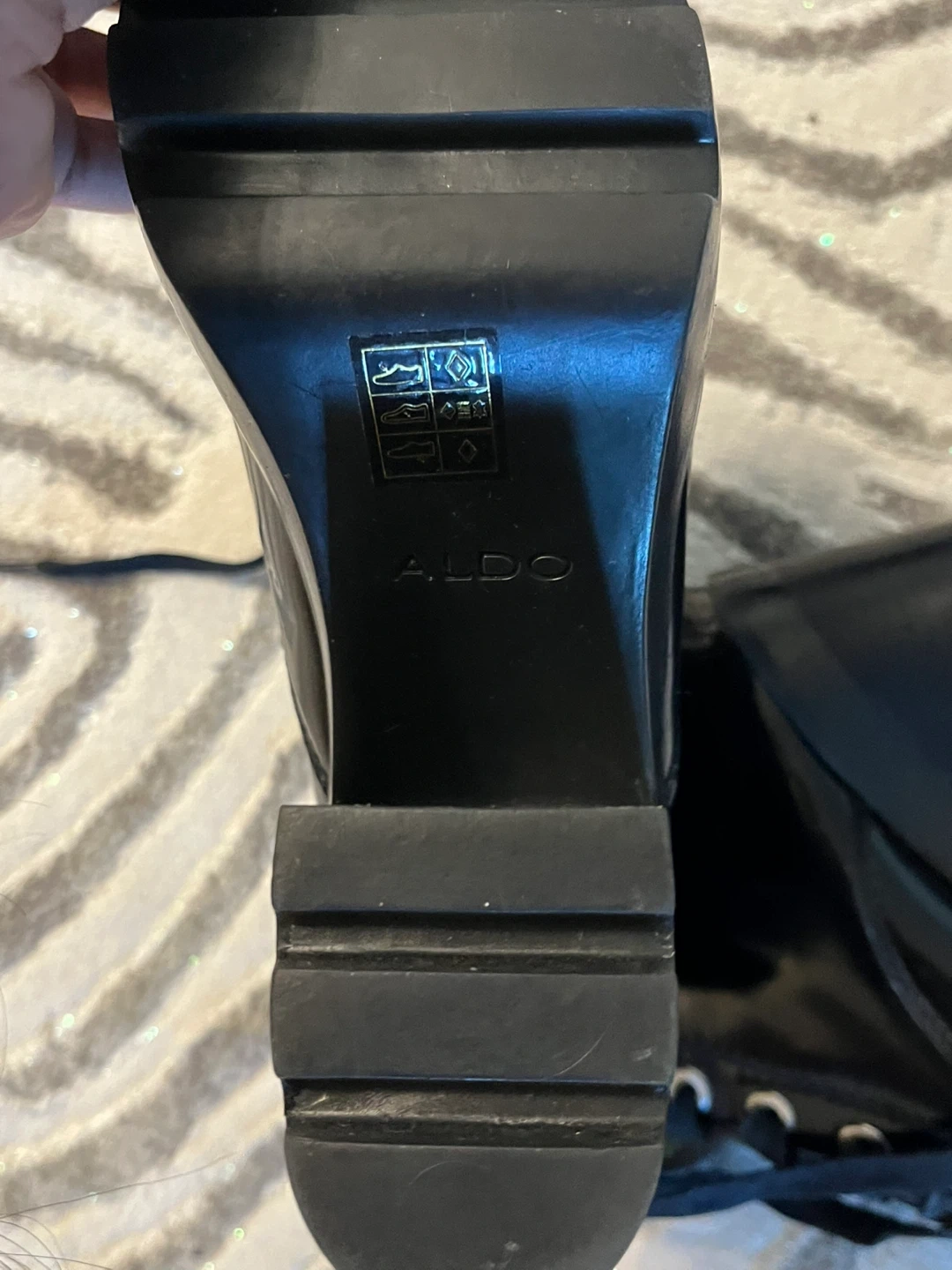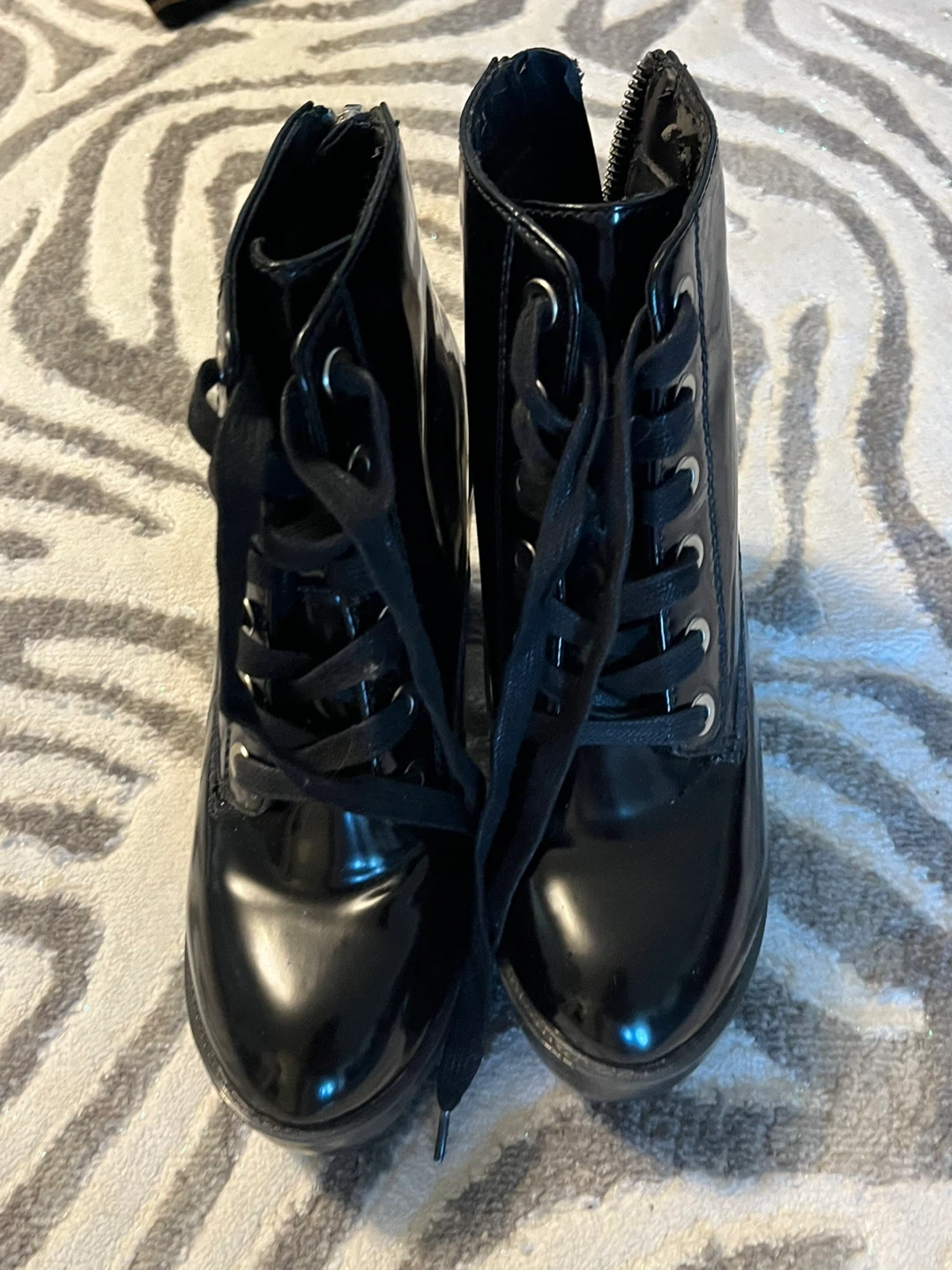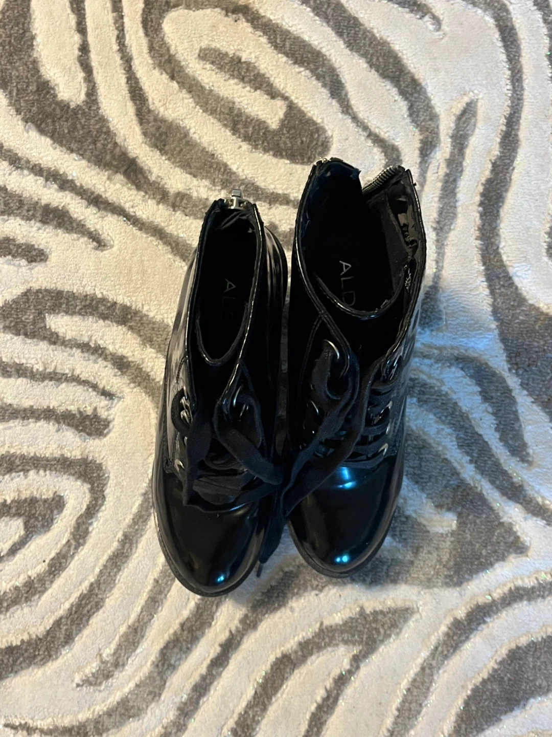 Selling a pair of ALDO black patent ankle boots! They have a lace-up design. Great for adding a bit of edge to any outfit!