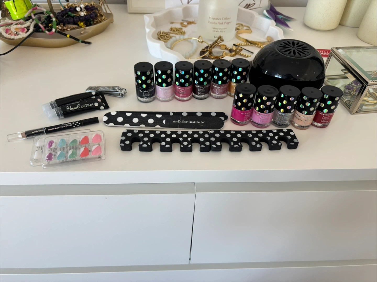 Used a couple of times, but in perfect condition Nail filer used a little bit Comes with a nail clipper, hand lotion, toe separators, nail whitening pencil, nail dryer and plain press on nails (sticky kind) All for $10 Pickup in Oakville
