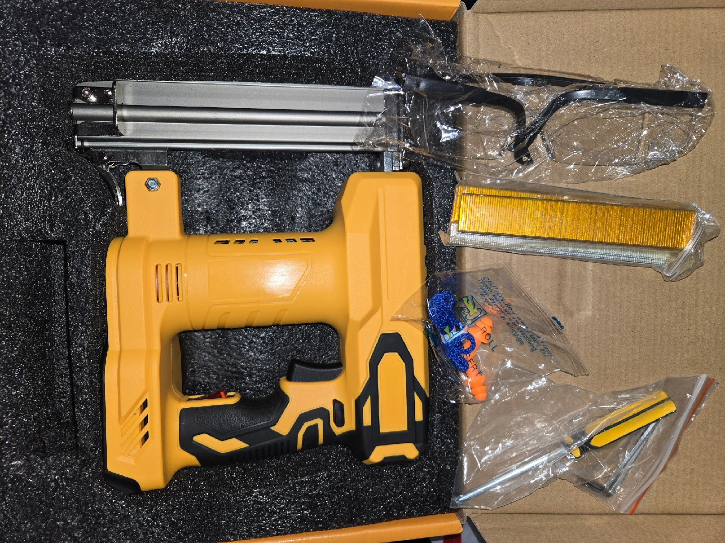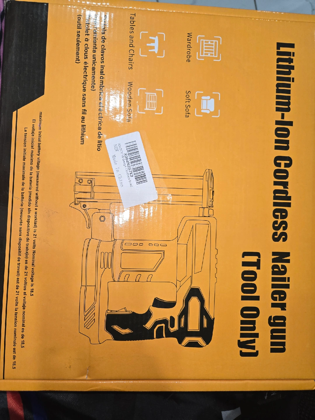 48Selling a Nairer lithium-ion cordless nailer gun. It comes with: - Earplugs - Allen keys - 18GA Brad nails - 18GA Narrow Crown Staples - Screwdriver - Protective Goggles It's perfect for woodworking projects and more