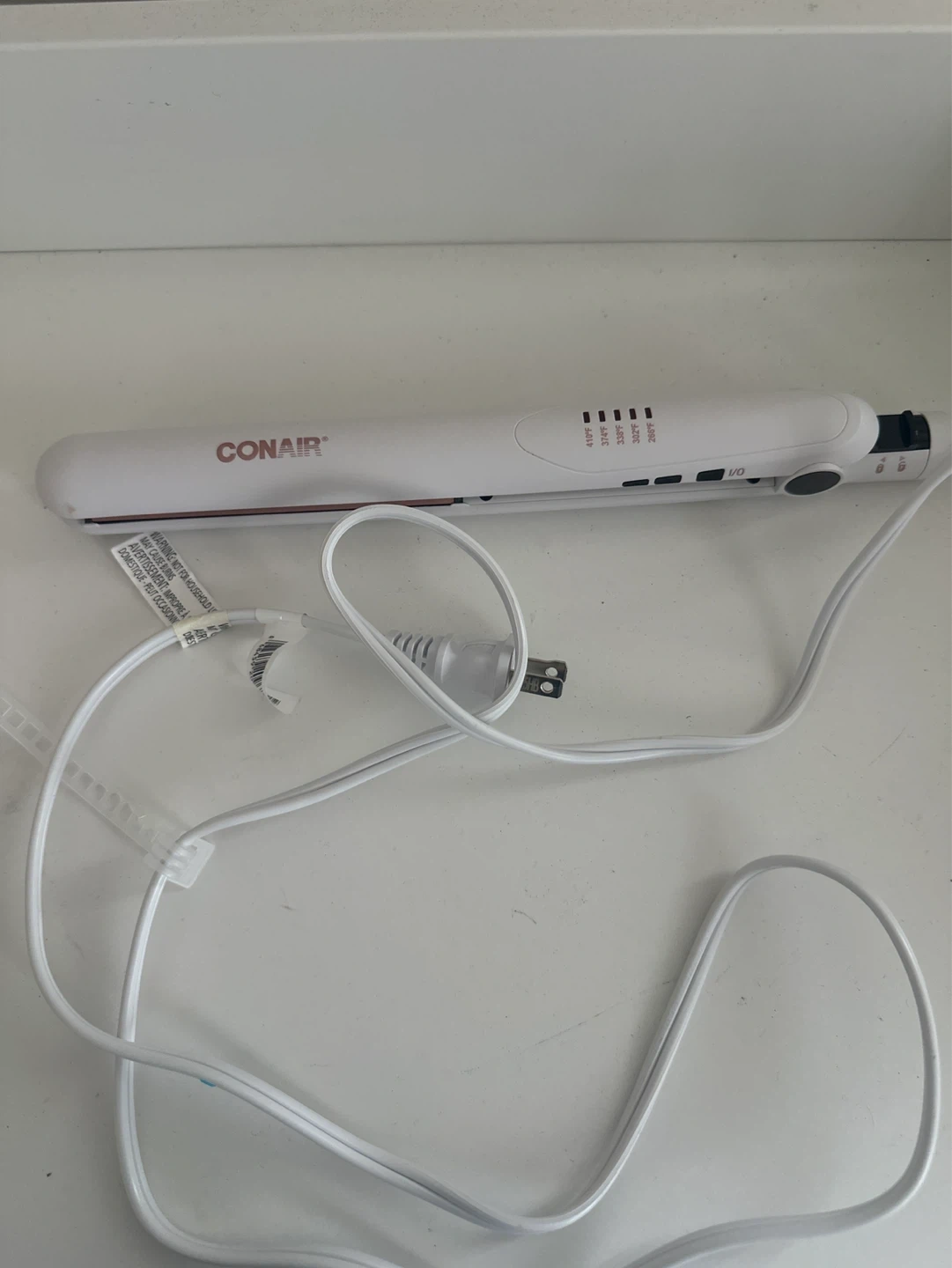 Conair white hair straightener with multiple heat settings. Temperatures range from 266°F to 410°F. For professional use only.