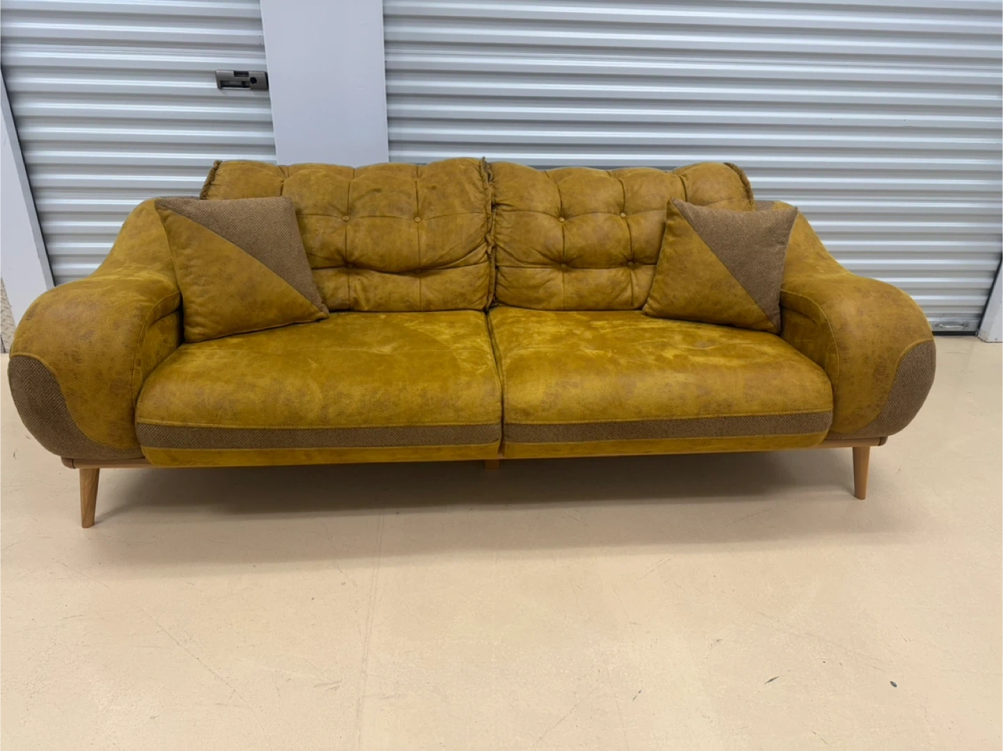 A stylish yellow sofa featuring deep tufting on the back cushions and seat. It comes with two accent pillows. The sofa has rounded arms and wood legs. Upholstered in a textured fabric, it adds a pop of colour to any living space!home delivery available