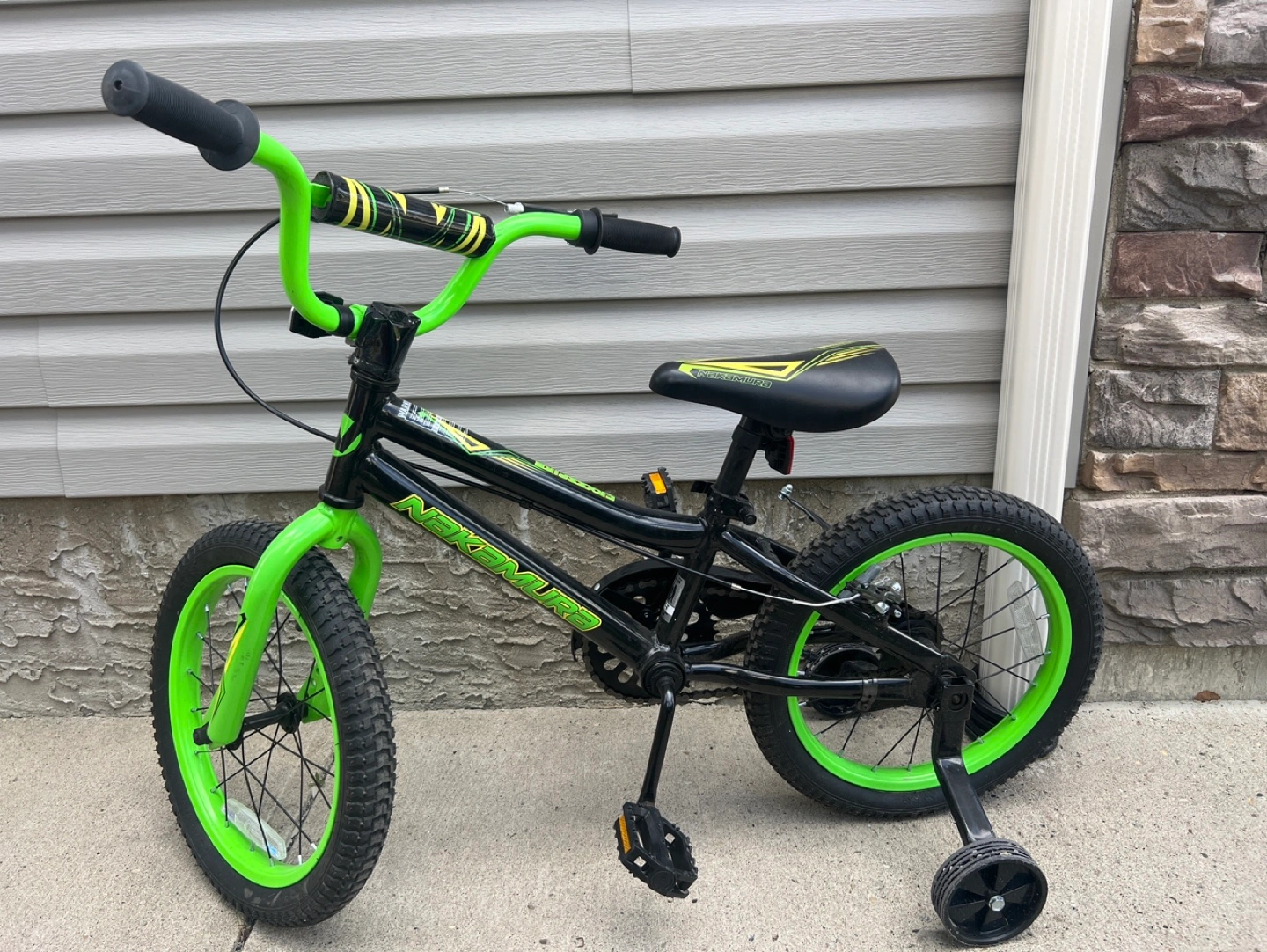 38Black and lime green kids' bike. 16-inch wheels. Includes training wheels. Great for learning to ride.