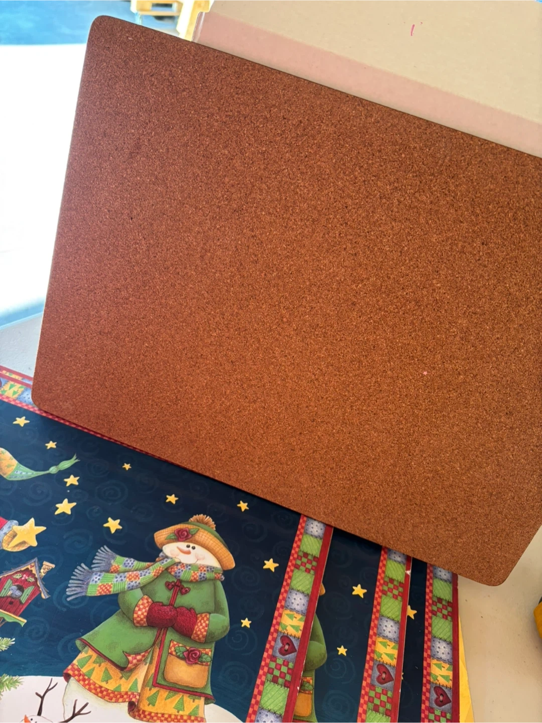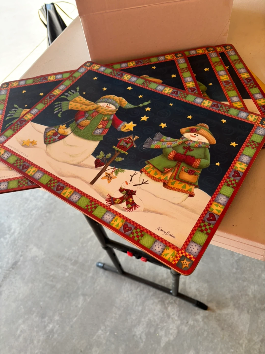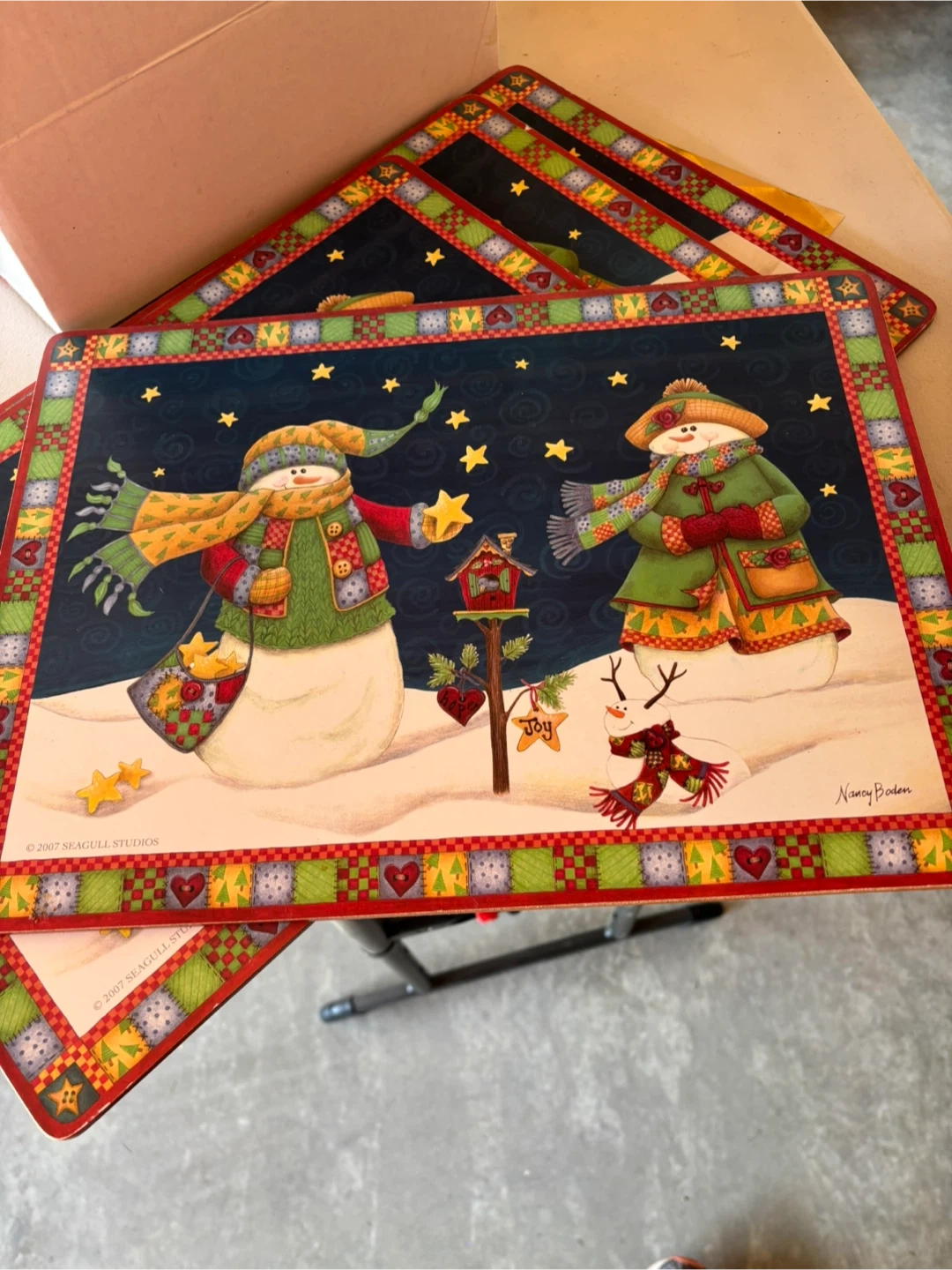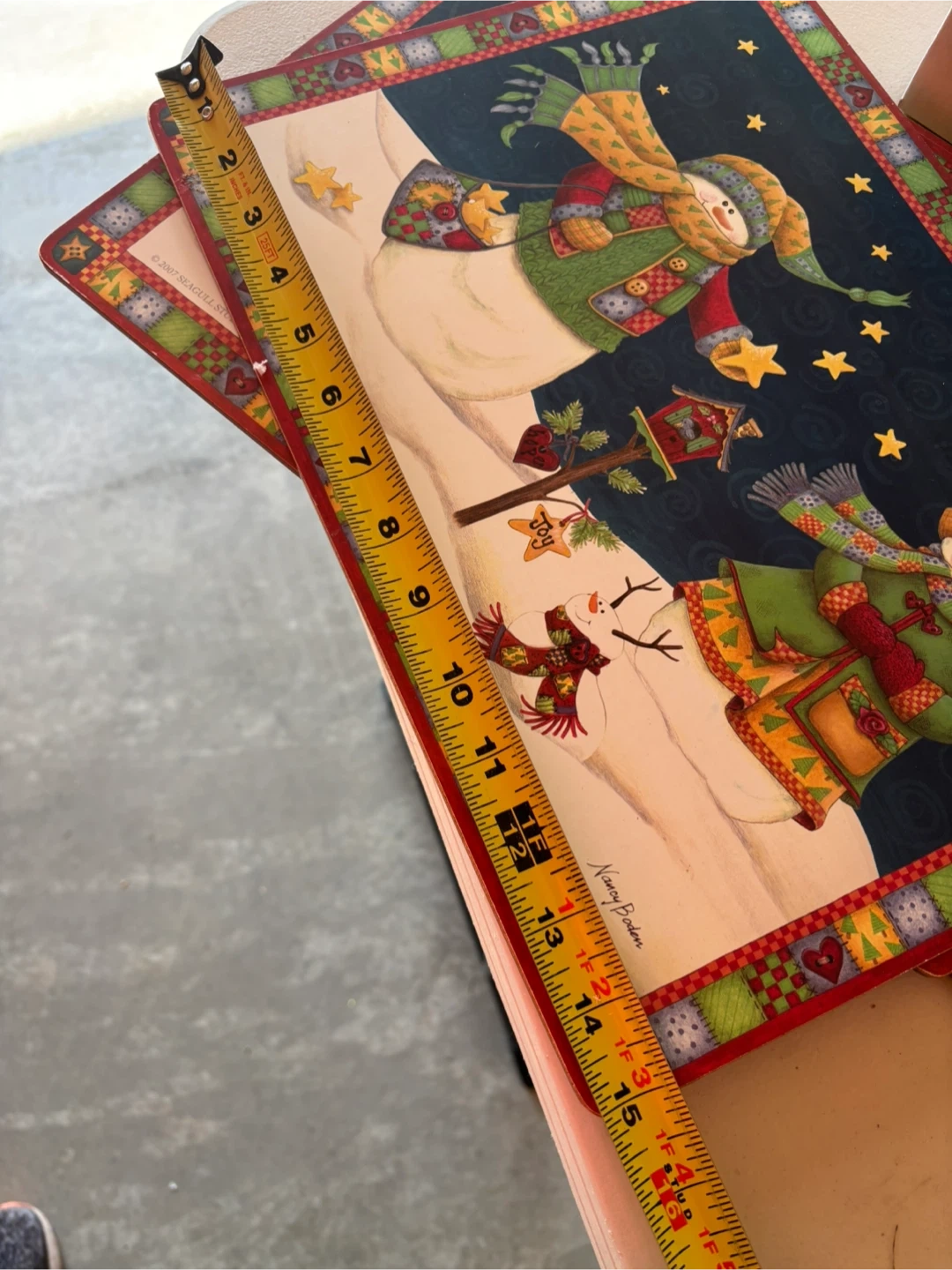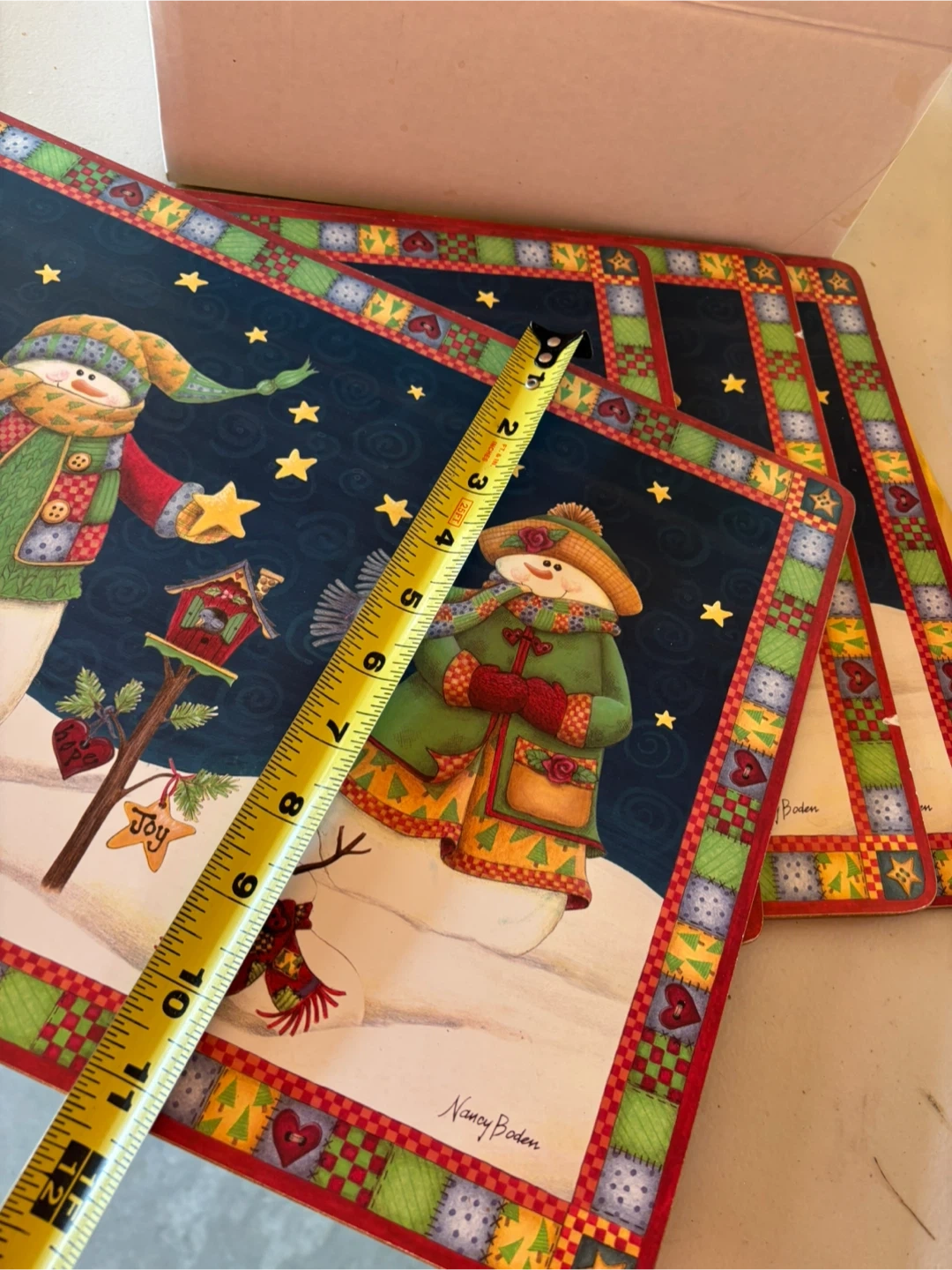 Here's a set of four festive placemats designed by Nancy Boden! They feature a charming snowman design, perfect for adding a touch of winter cheer to your dining table. Each placemat measures approximately 17 inches in length and 11.5 inches in width.