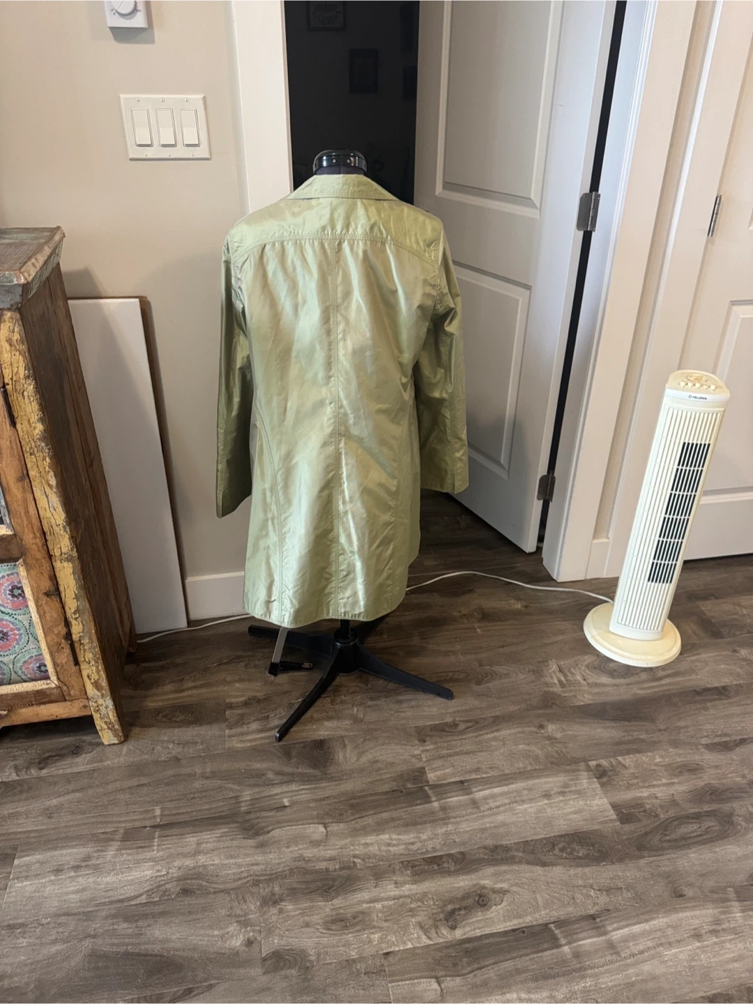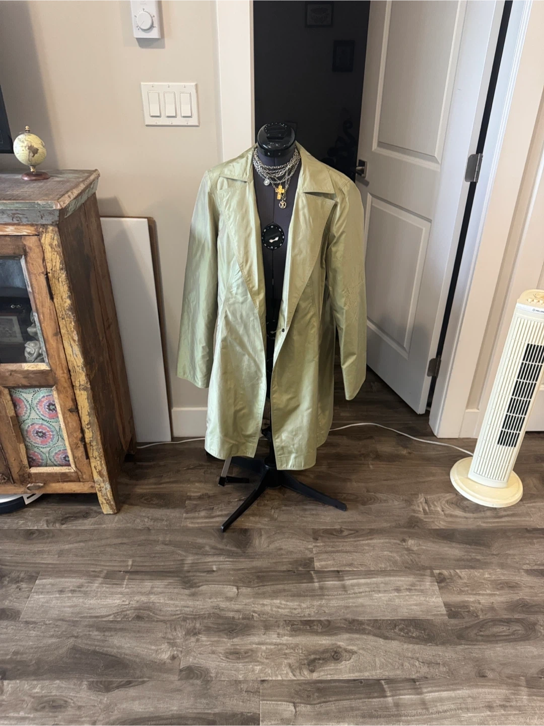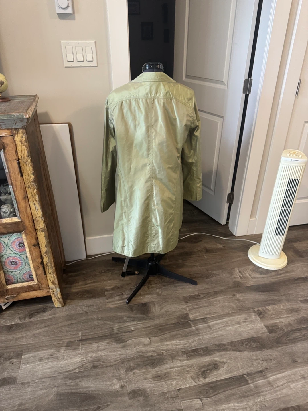 Nancy lord Light Green Trench Coat - estimated small Elevate your wardrobe with this stylish light green iridescent trench coat. Unknown material feels like taffeta. One button closure. A mark by colar & two small holes reflecting in price. Retail $700-$1200 Length 35” Sleeves 24” Pit to pit 20”