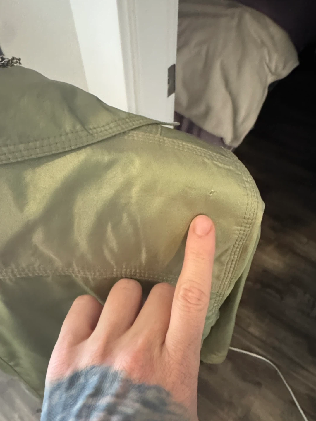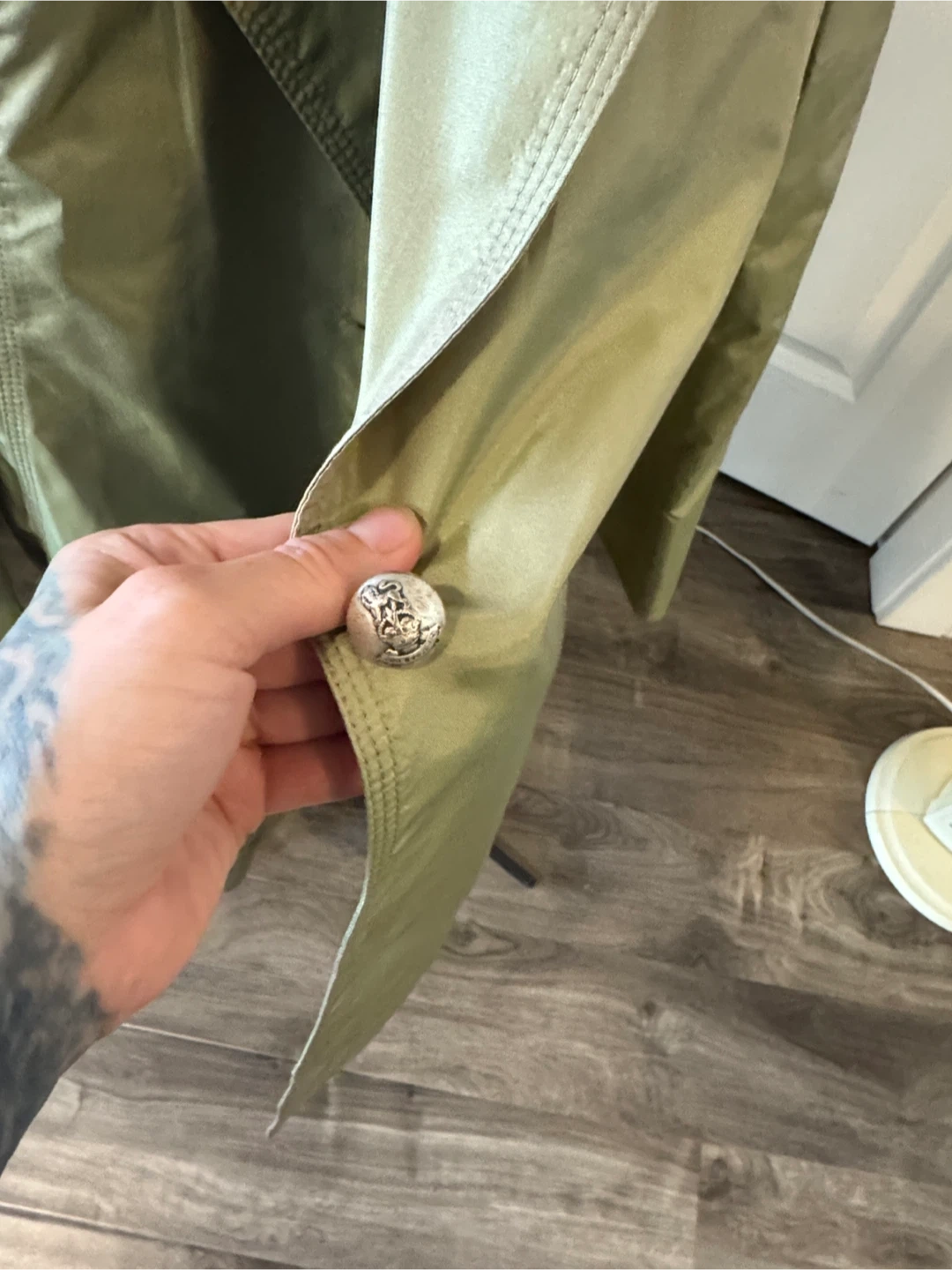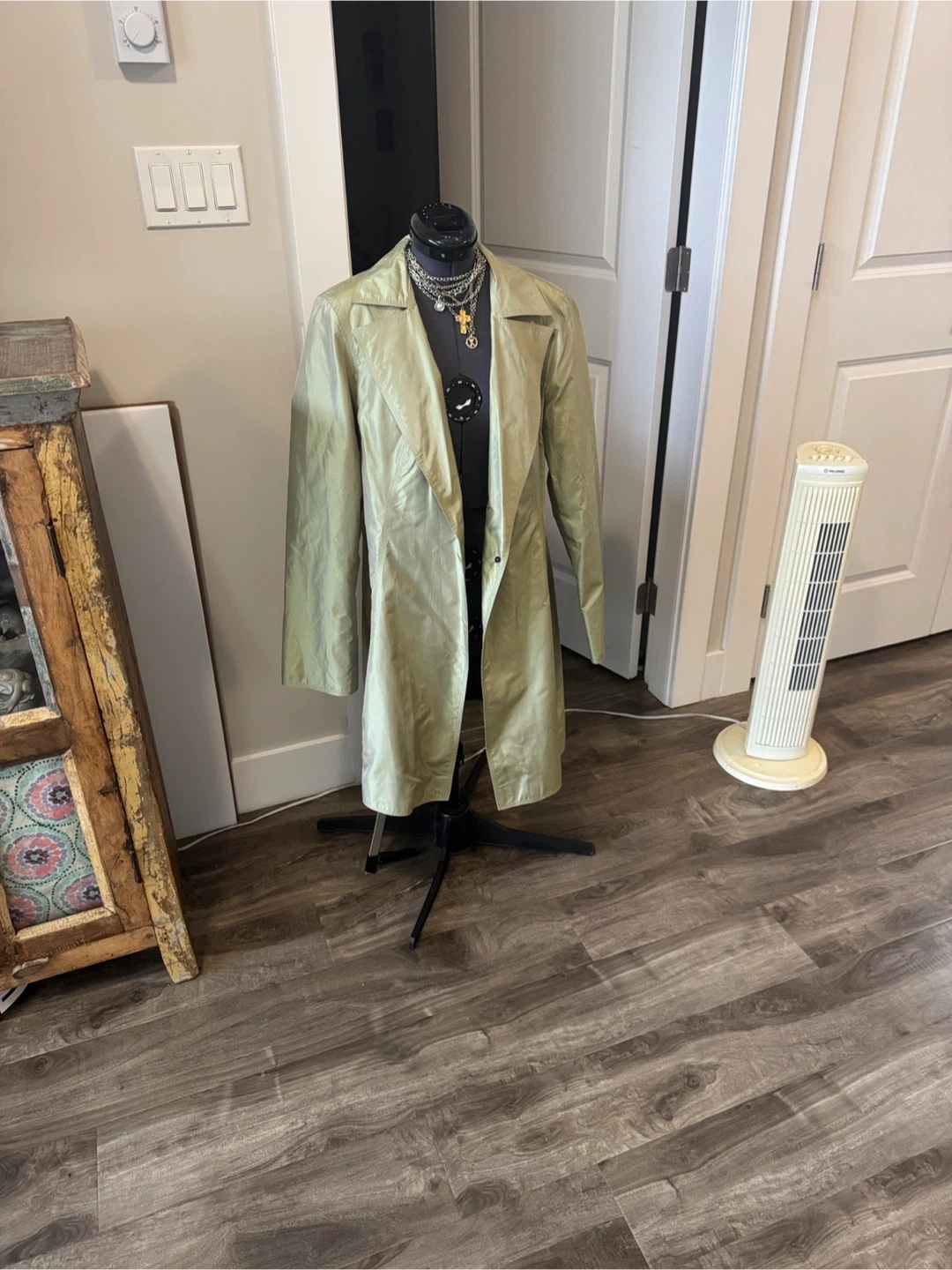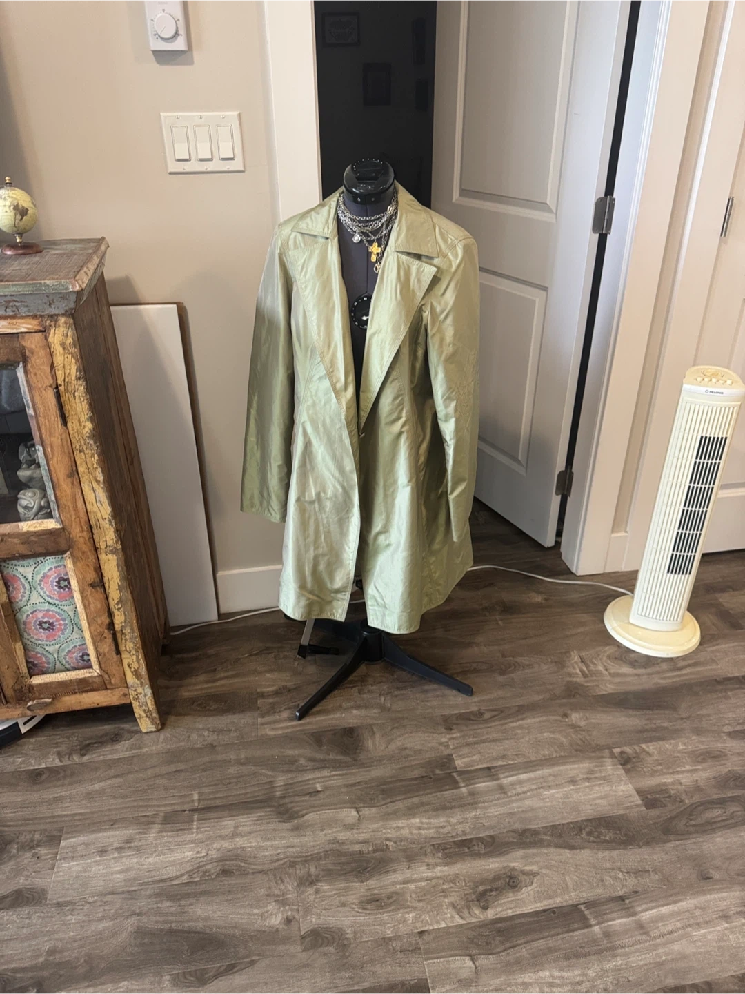 Nancy lord Light Green Trench Coat - estimated small Elevate your wardrobe with this stylish light green iridescent trench coat. Unknown material feels like taffeta. One button closure. A mark by colar & two small holes reflecting in price. Retail $700-$1200 Length 35” Sleeves 24” Pit to pit 20”