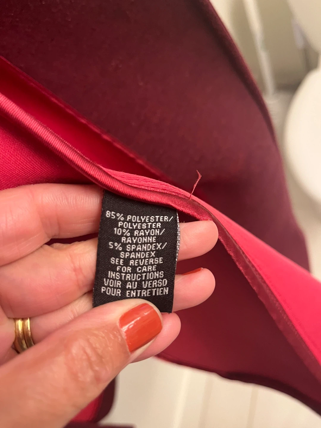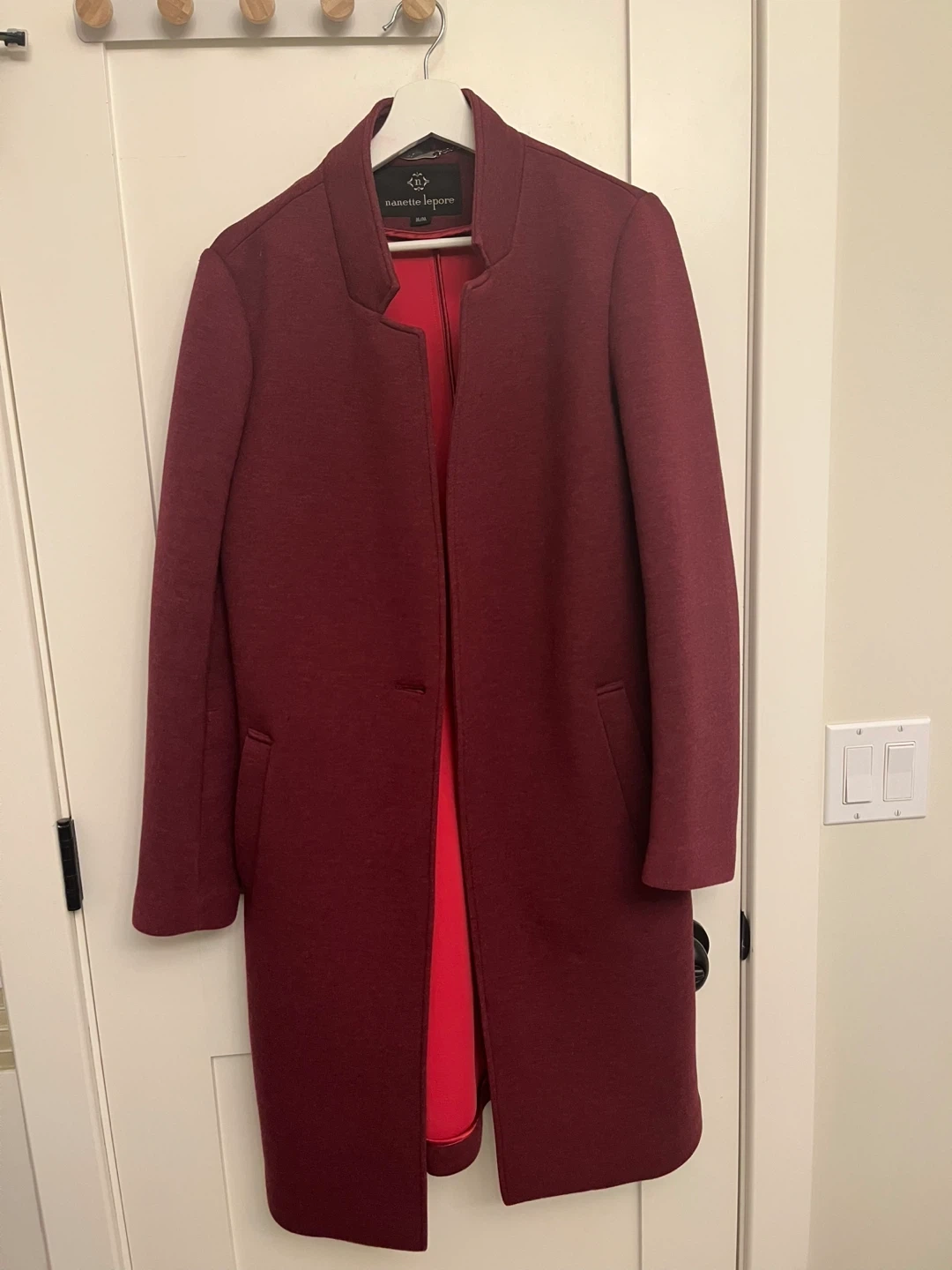 81Selling a Nanette Lepore coat in size medium. It's a beautiful burgundy color and made of 85% polyester, 10% rayon, and 5% spandex. Scuba fabric. Warm, heavy, and soft. Excellent used condition. But button missing.