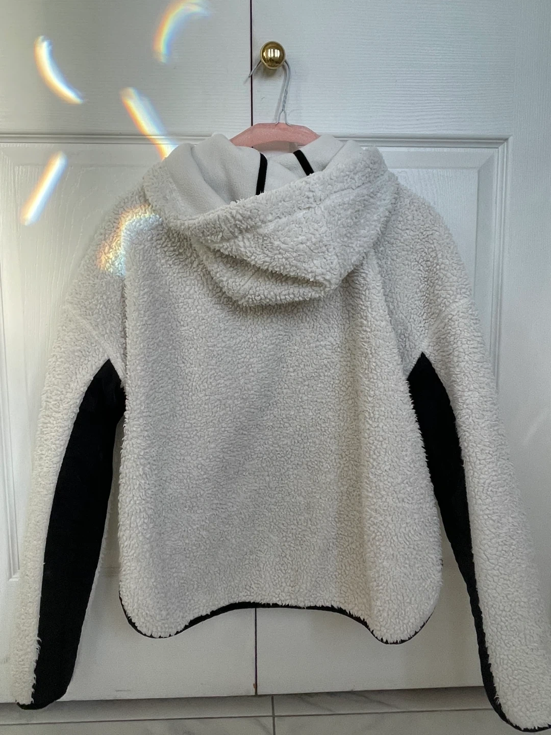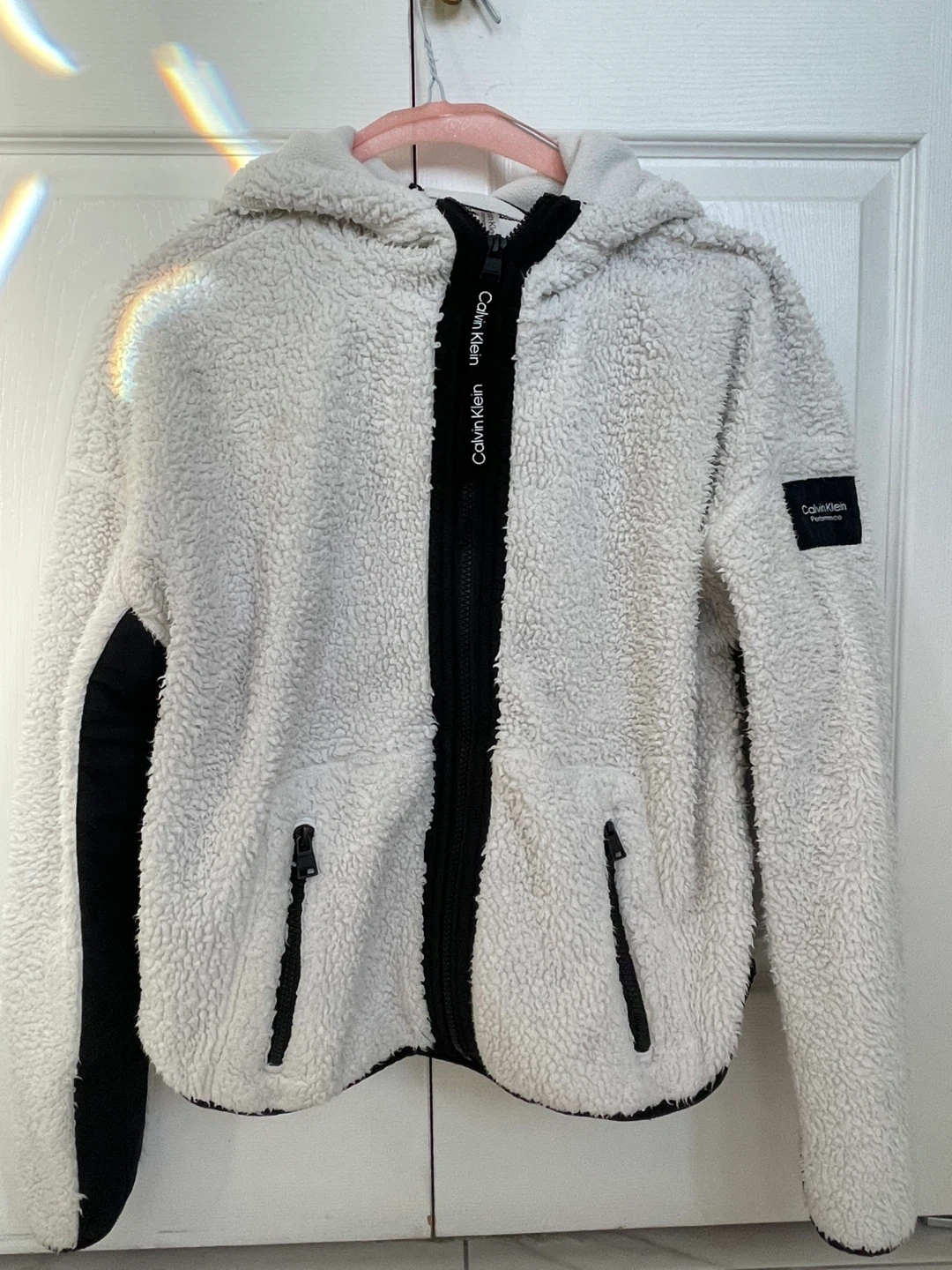Cozy white teddy fleece full-zip hoodie by Calvin Klein Performance. It's a size medium with black contrast panels on the sleeves and sides. Perfect for layering on cooler days!