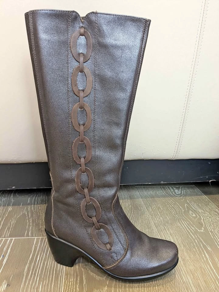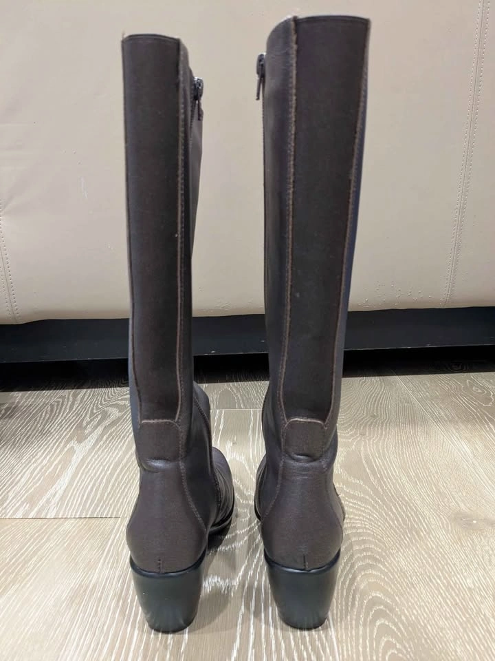 EUC gorgeous NAOT tall boots, size 35. Shiny brown leather, with matte leather detail down the side. Zipper on the other side. Elasticized section down the back to the ankle for extra stretch around the calf. Very comfortable footbeds. Thinly lined on the inside. 2.25" heel, 13" shaft (measured from heel), 14.25" circumference at top of shaft. Minor scuffs on the toes (see pics). Everything else is in excellent condition. Location: near Promenade Mall in Thornhill.