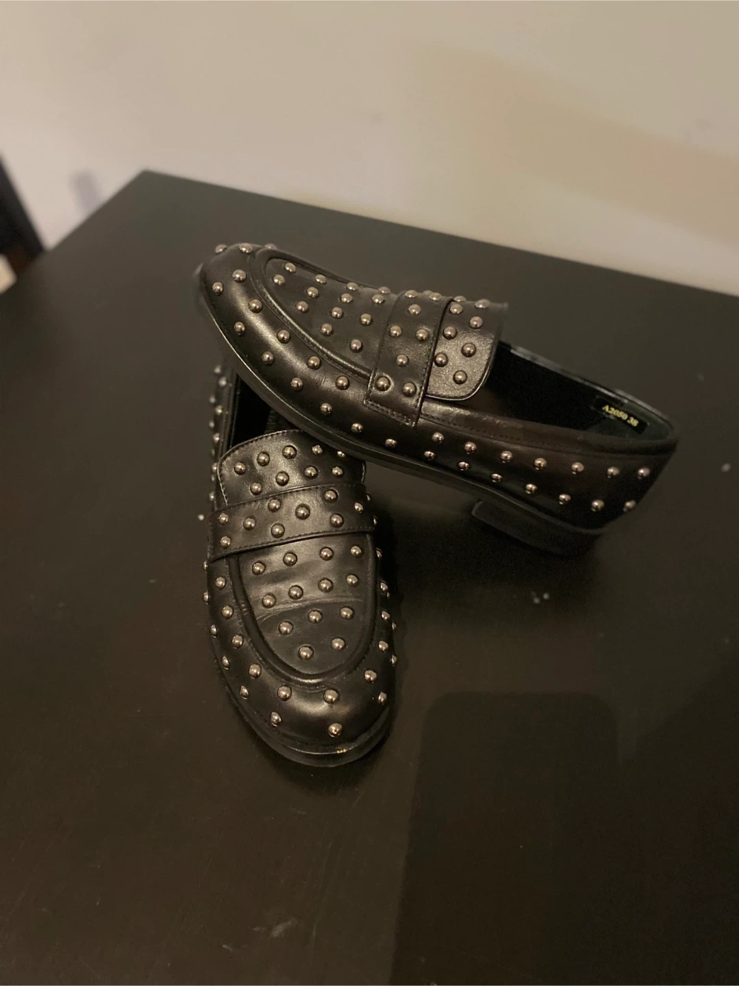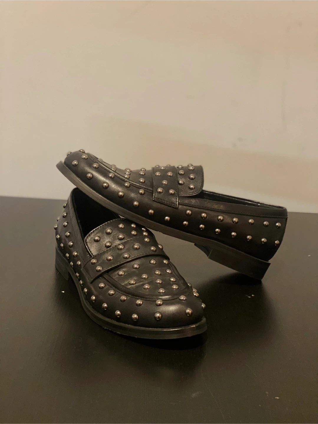 10USED 1 TIME. Selling a pair of Napoleoni loafers in black leather. These stylish loafers feature a studded design and are made in Italy. The size is 38. Real Italian leather