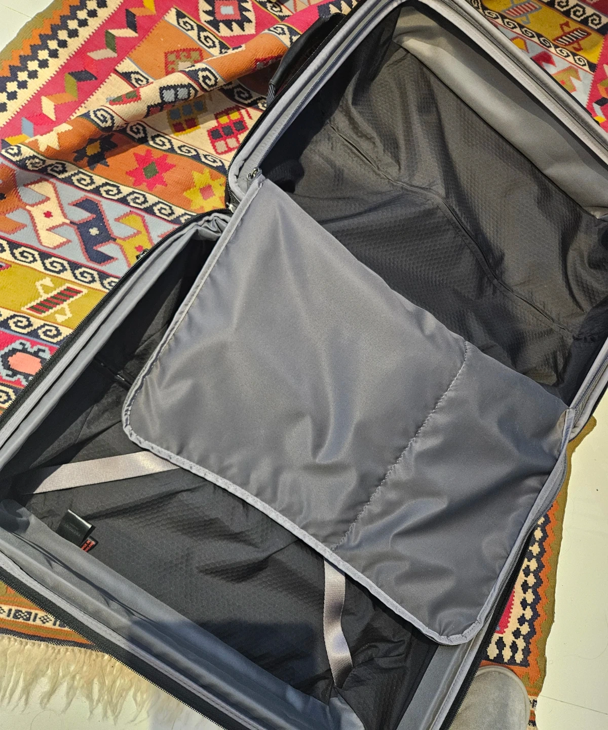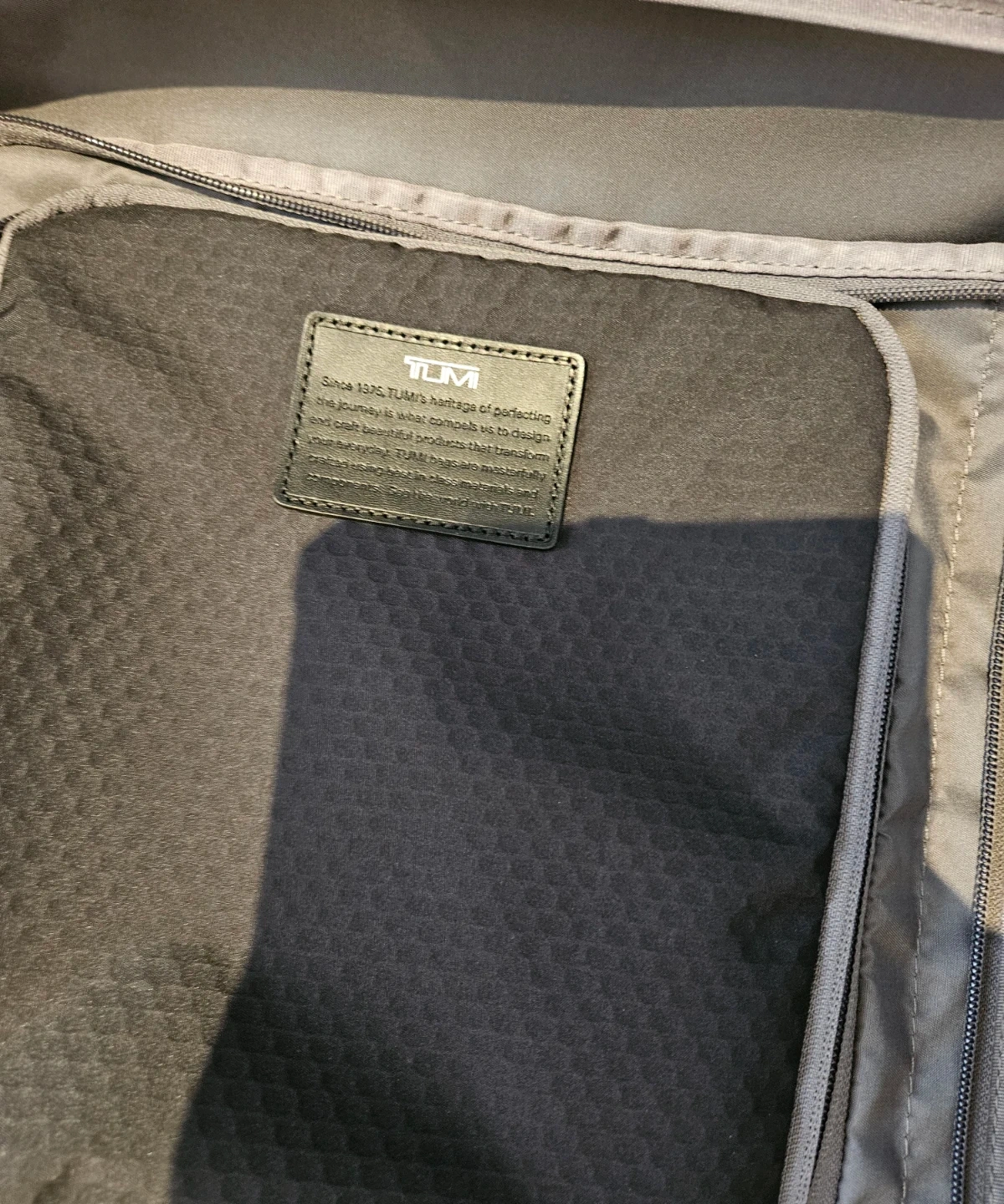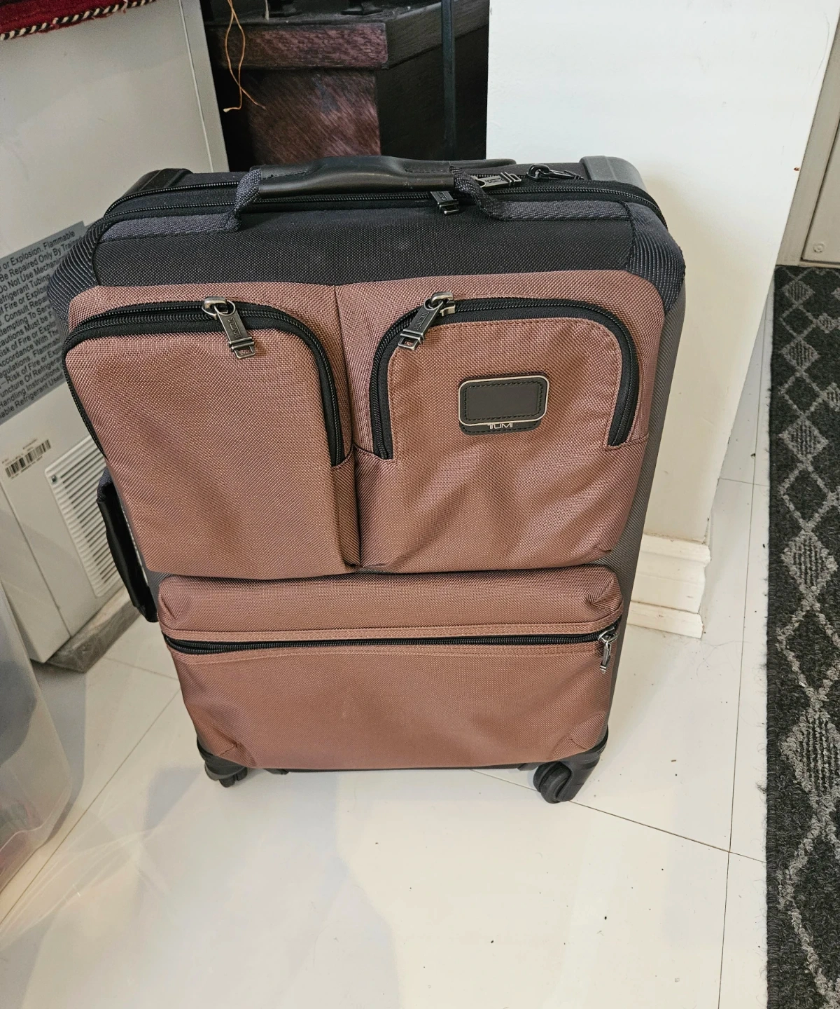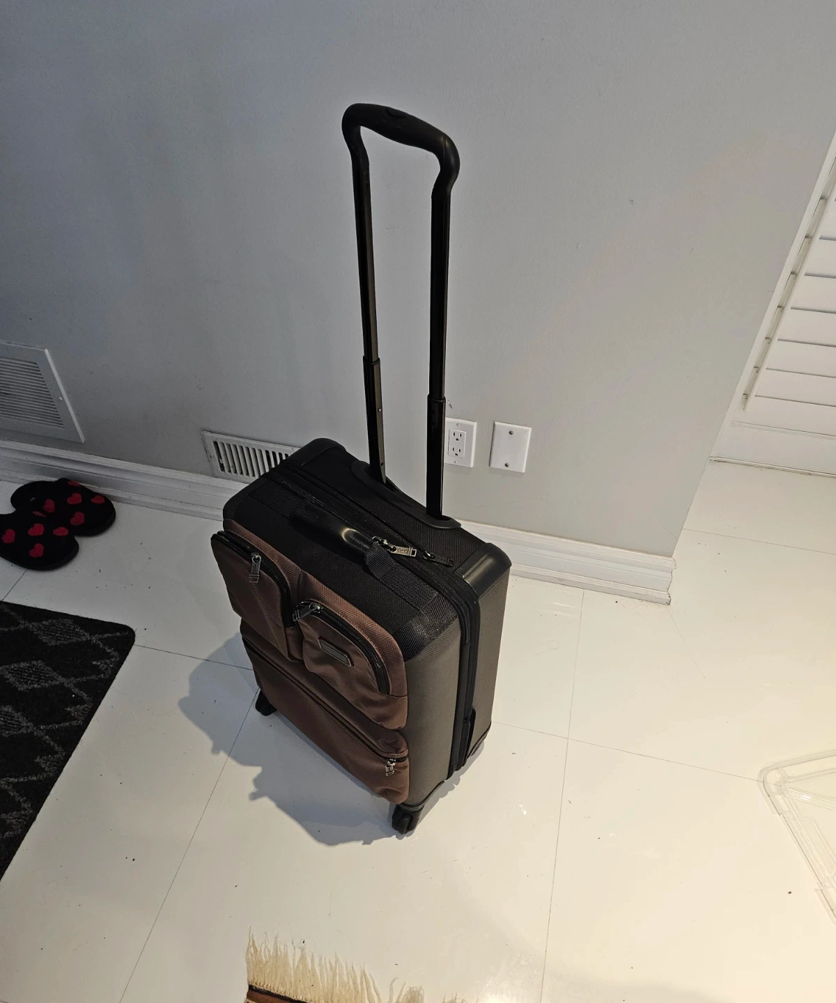 Tumi carry-on suitcase in a grey and brown colourway. It's made with durable nylon material. Features multiple zippered pockets for organization. Great for weekend trips!