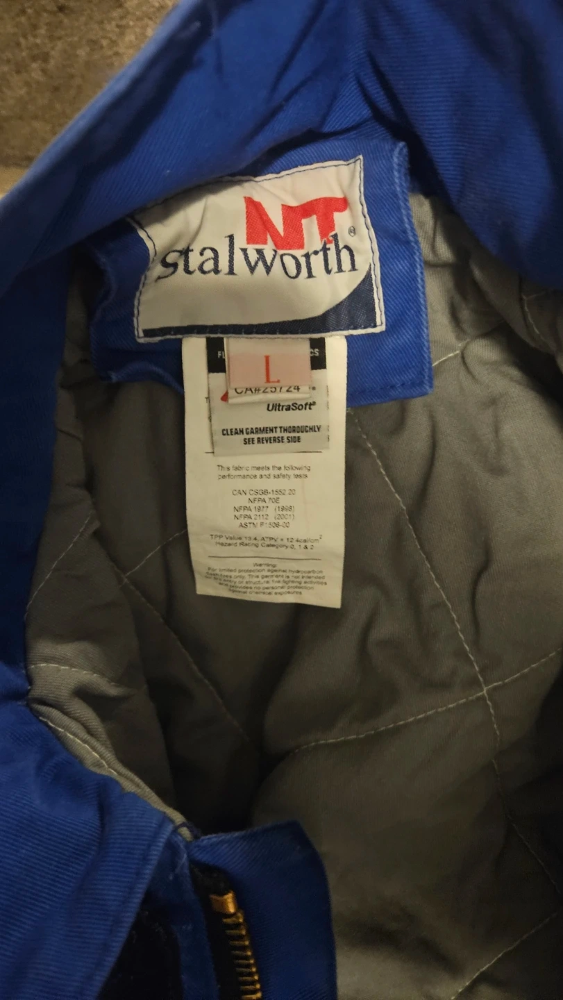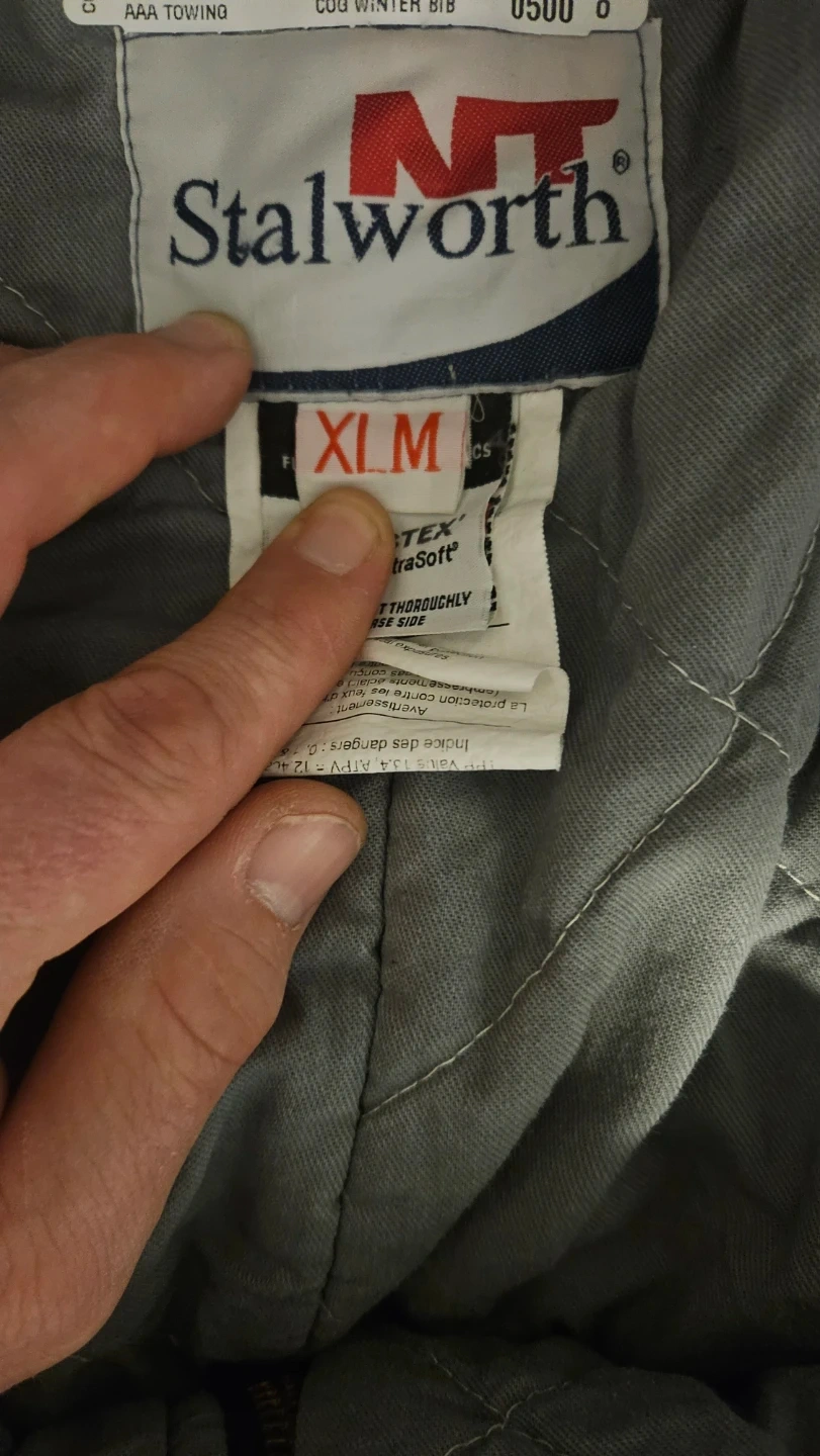 This is a blue Stalworth winter bib overall and jacket set. It features reflective safety stripes. Both pieces are lined and insulated for warmth. Includes a removable hood. The jacket is a size L and the bib overalls are a size XL. I'm 5'10 and 180 lbs just to give you an idea of how they fit.
